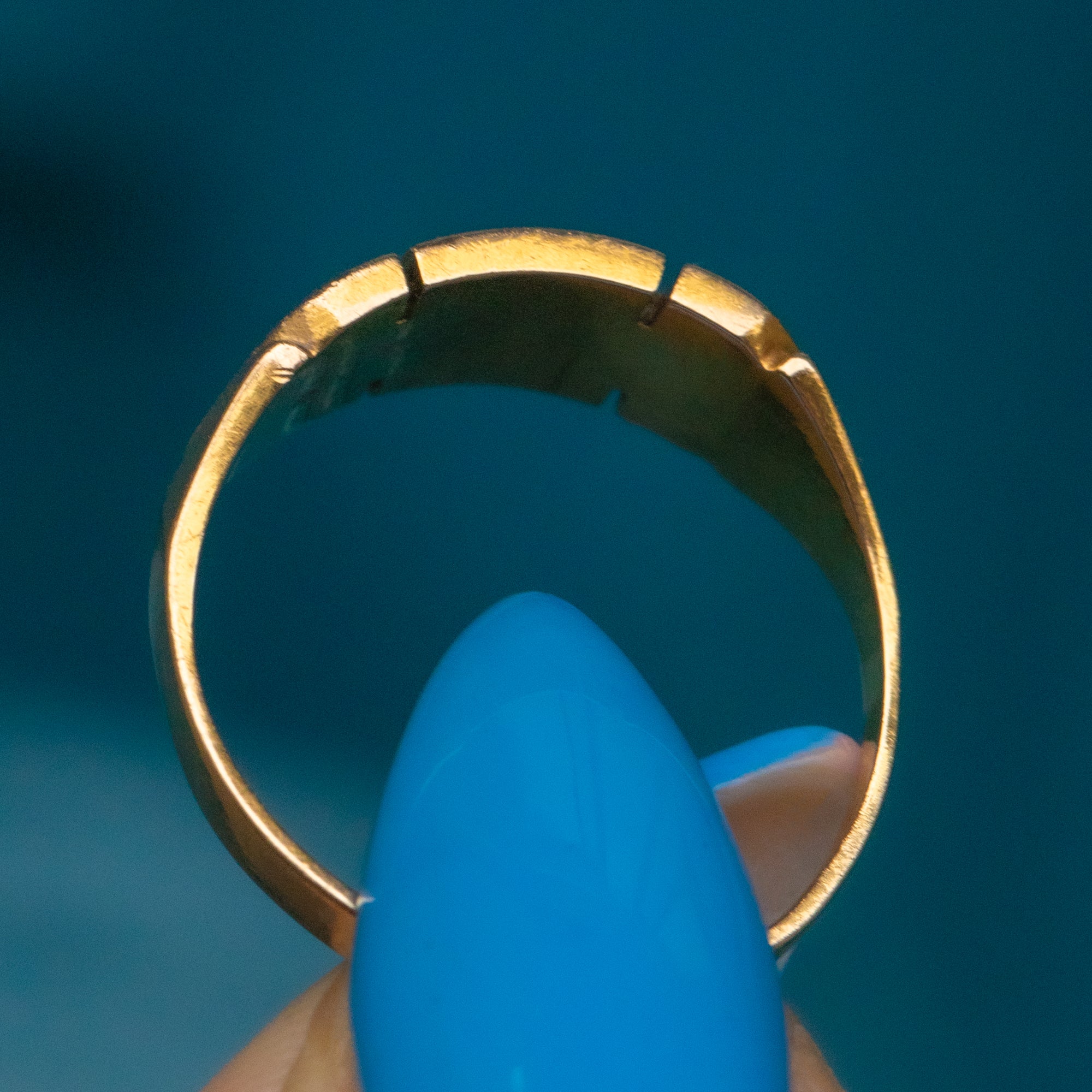 VERY GOOD. This antique 15ct Gold engraved Turquoise Coral gypsy ring is in very good condition. The 15ct Gold is brightly saturated and the details on the front have remained defined, with only minor age-related wear on the inside of the band at the back of the settings. The gemstones are all present and securely set, the Coral is quite pale, however, this creates a lovely contrast against the bright Turquoise. The hallmarks are bold and easily legible, making this antique gypsy ring a lovely addition to any collection!