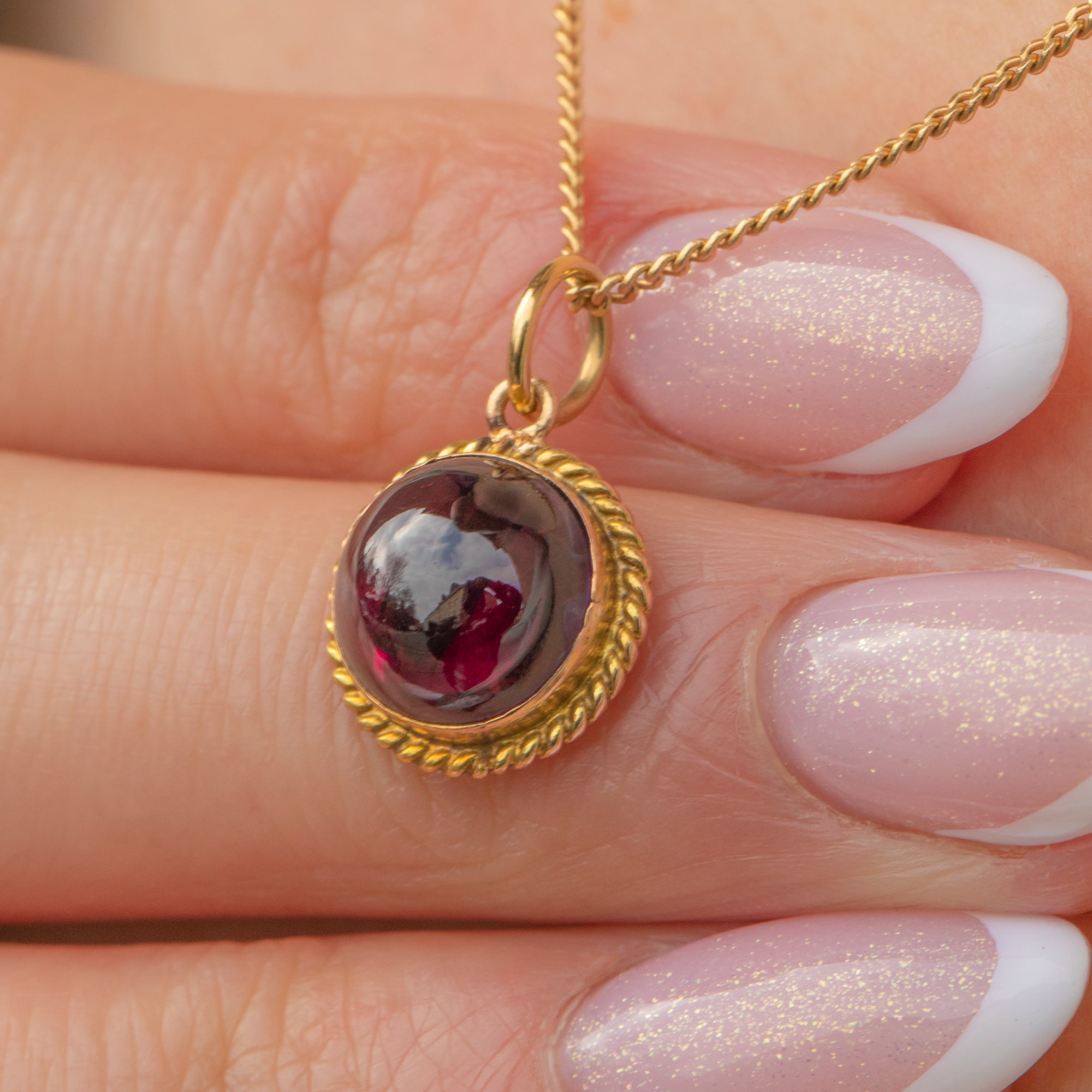 GOOD: This antique 15ct Gold Garnet cabochon pendant is in good condition. The Garnet is radiant and secure within its setting. There are some notable signs of wear to her bezel, commensurate with age, and a conversion mark to the back of the charm which cannot be seen from the front. With a secure jump ring, you can wear this Victorian charm with confidence!