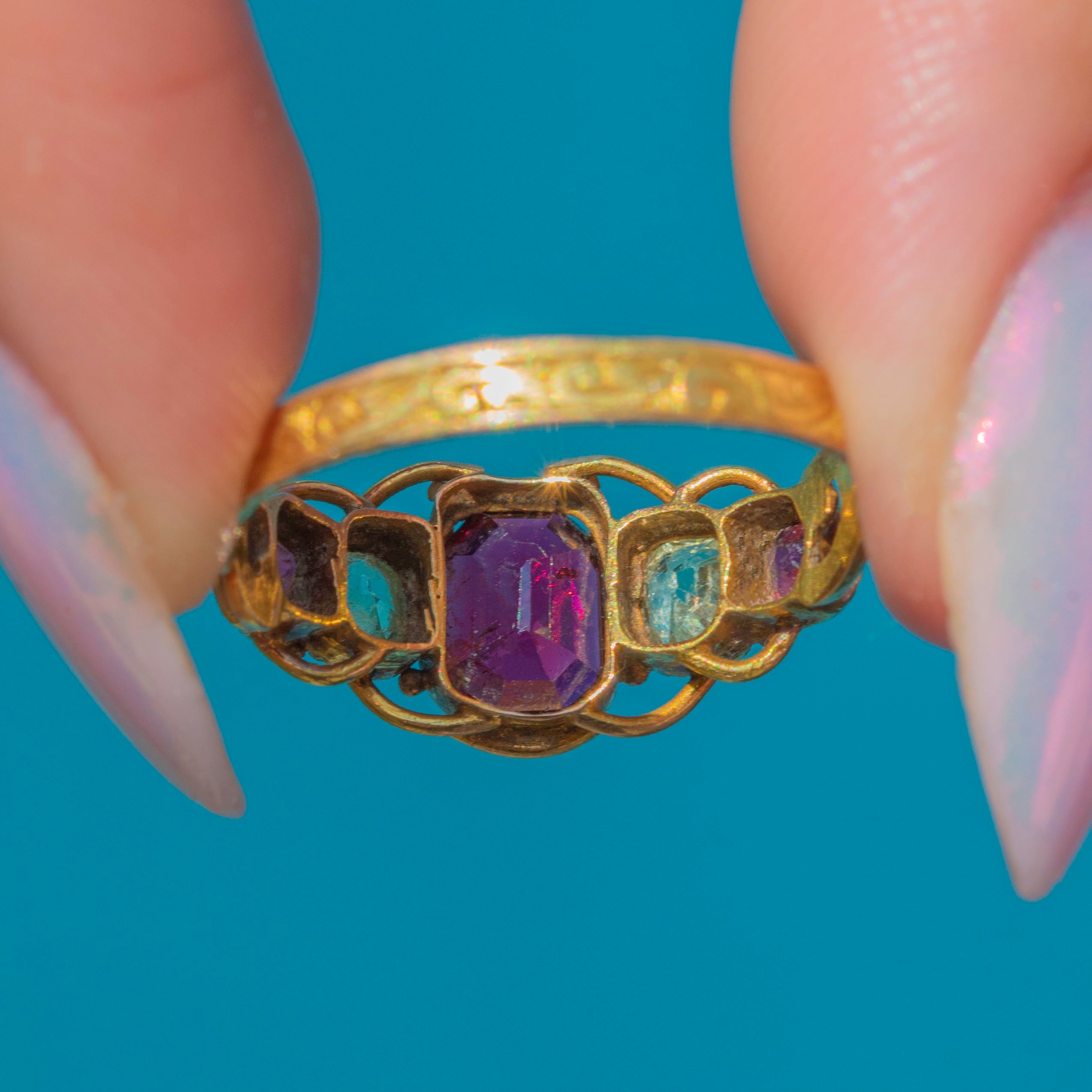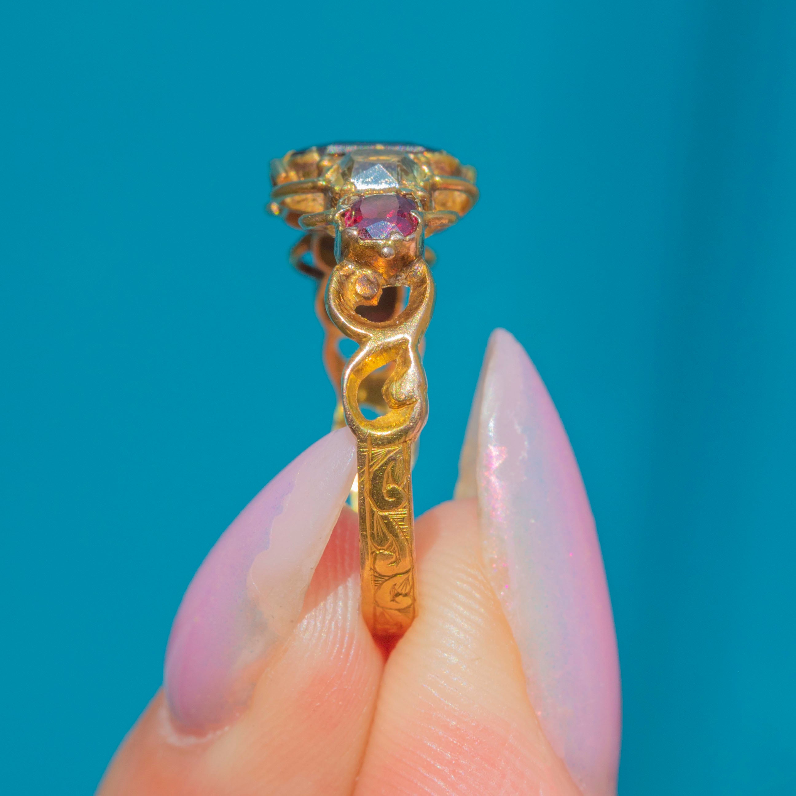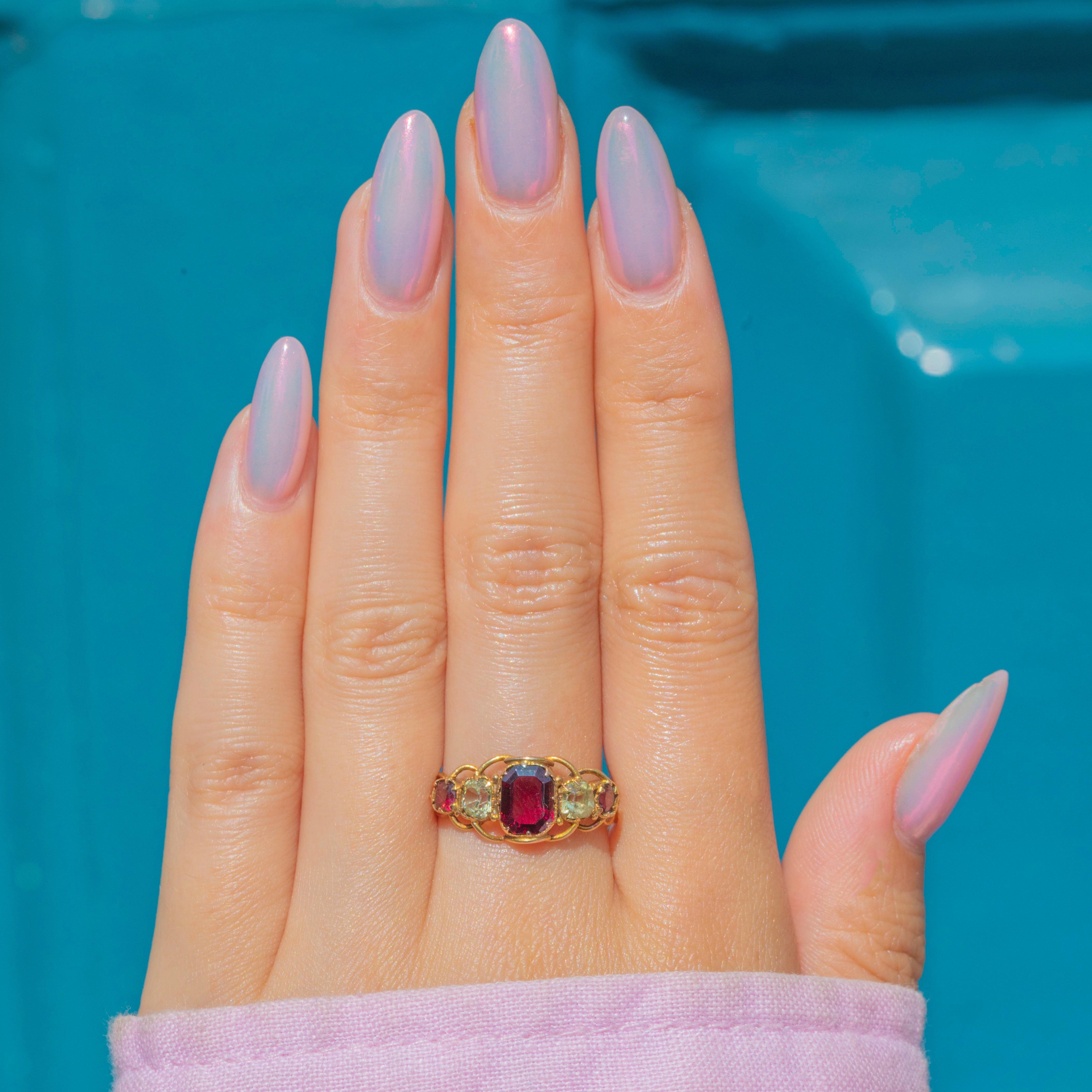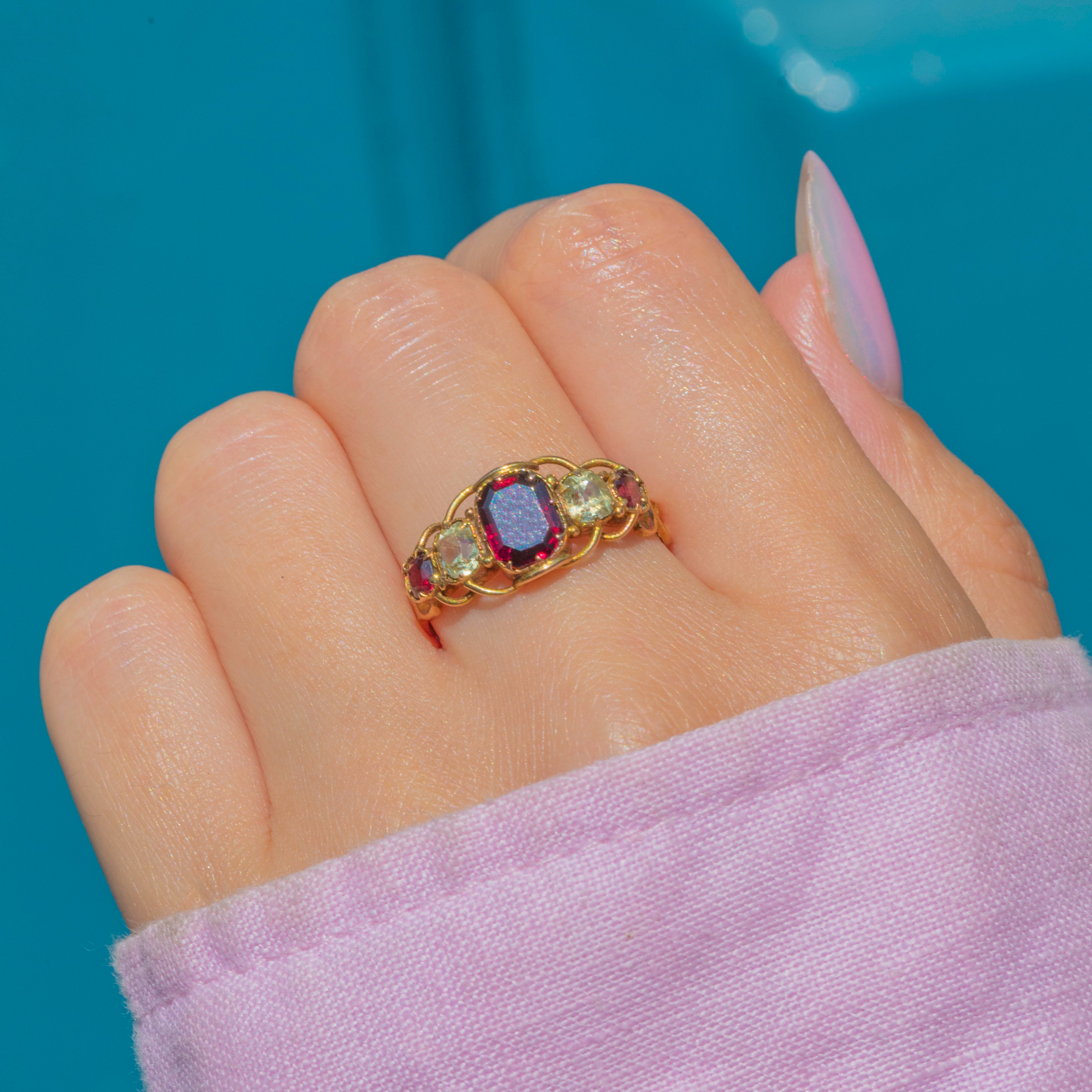 The ring face is comprised of three juicy Garnets interspersed with cool, sage green Chrysoberyl, each gemstone married by the warmth of the bright 15ct Gold. She is complete with ornate openwork settings and a finely detailed band, providing undeniable Victorian antique allure!