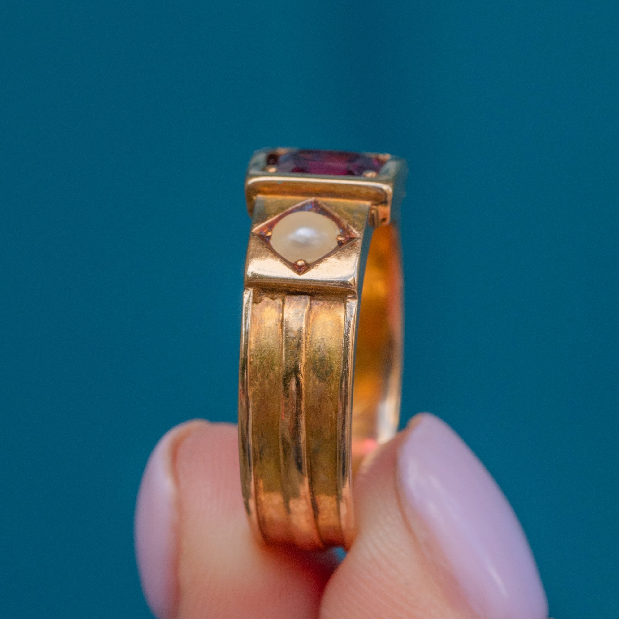 Stand out from the crowd with this unique antique 15ct Gold Garnet Pearl ring adorning your hand! The vibrant magenta-hued Rhodolite Garnet takes centre stage, flanked between two iridescent Pearls creating the most delectable gemstone trilogy.