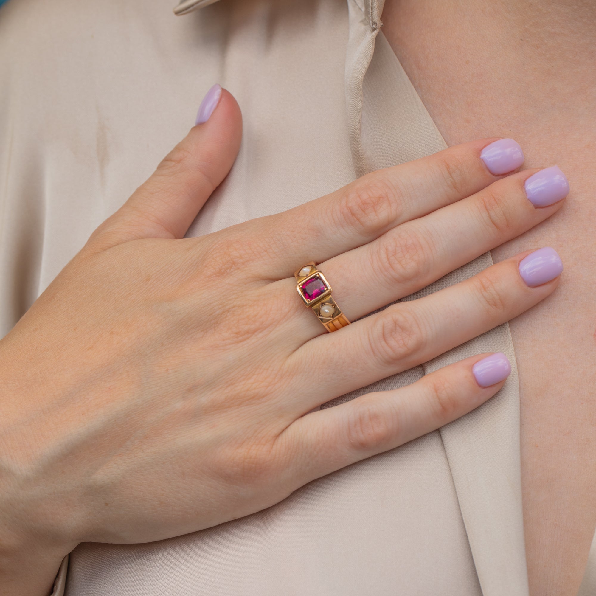 VERY GOOD. This antique 15ct Gold Garnet Pearl ring is in very good condition. The Gold has a wonderful saturation throughout, with only subtle age-related wear, and the band is robust allowing for comfortable and confident wear. The Garnet is free from chips or abrasions, it does have some slight movement but has remained secure within its setting. The Pearls are pristine with their natural nacre fully intact. With a full set of hallmarks inside the band, we can accurately date this Victorian Garnet Pearl ring to 1886!