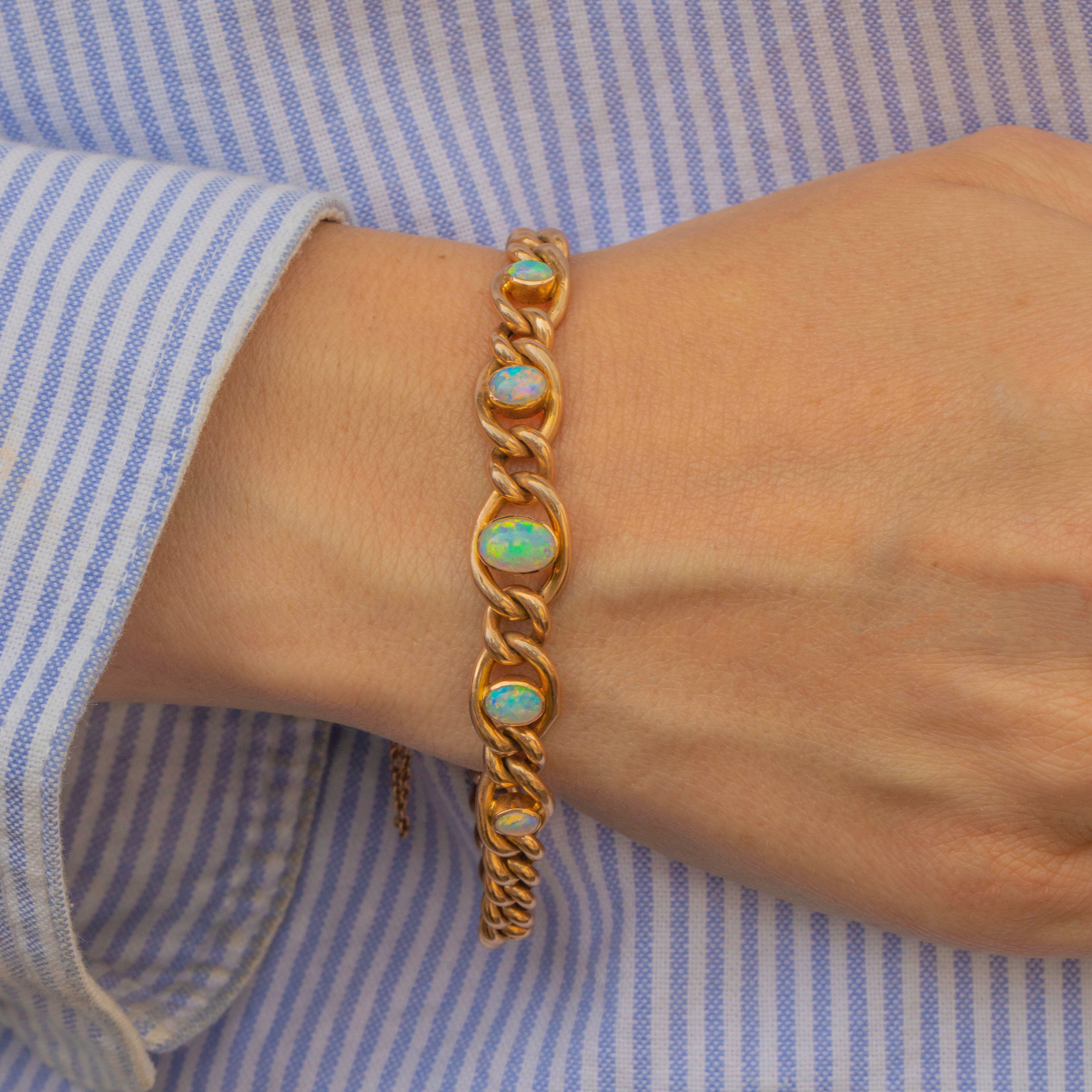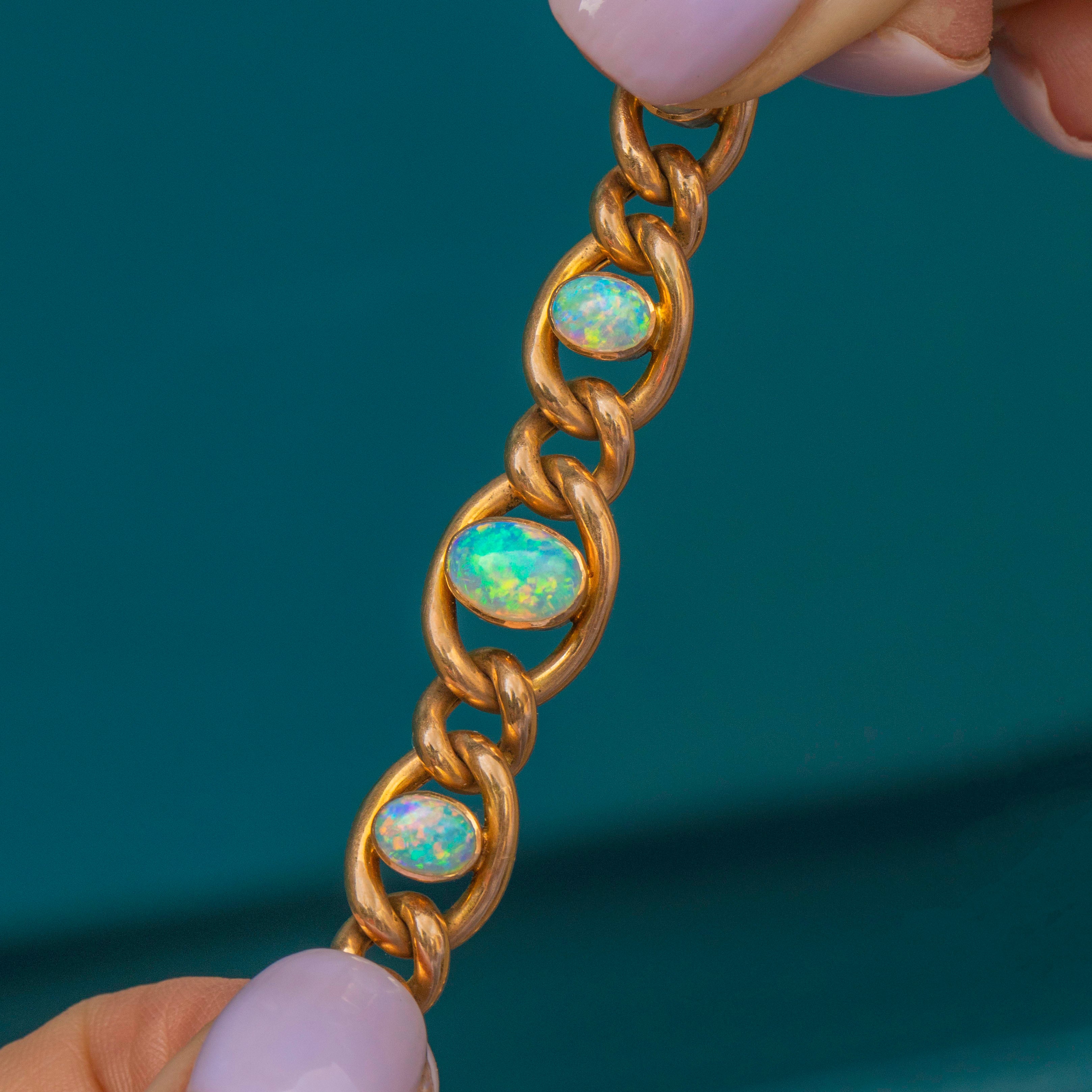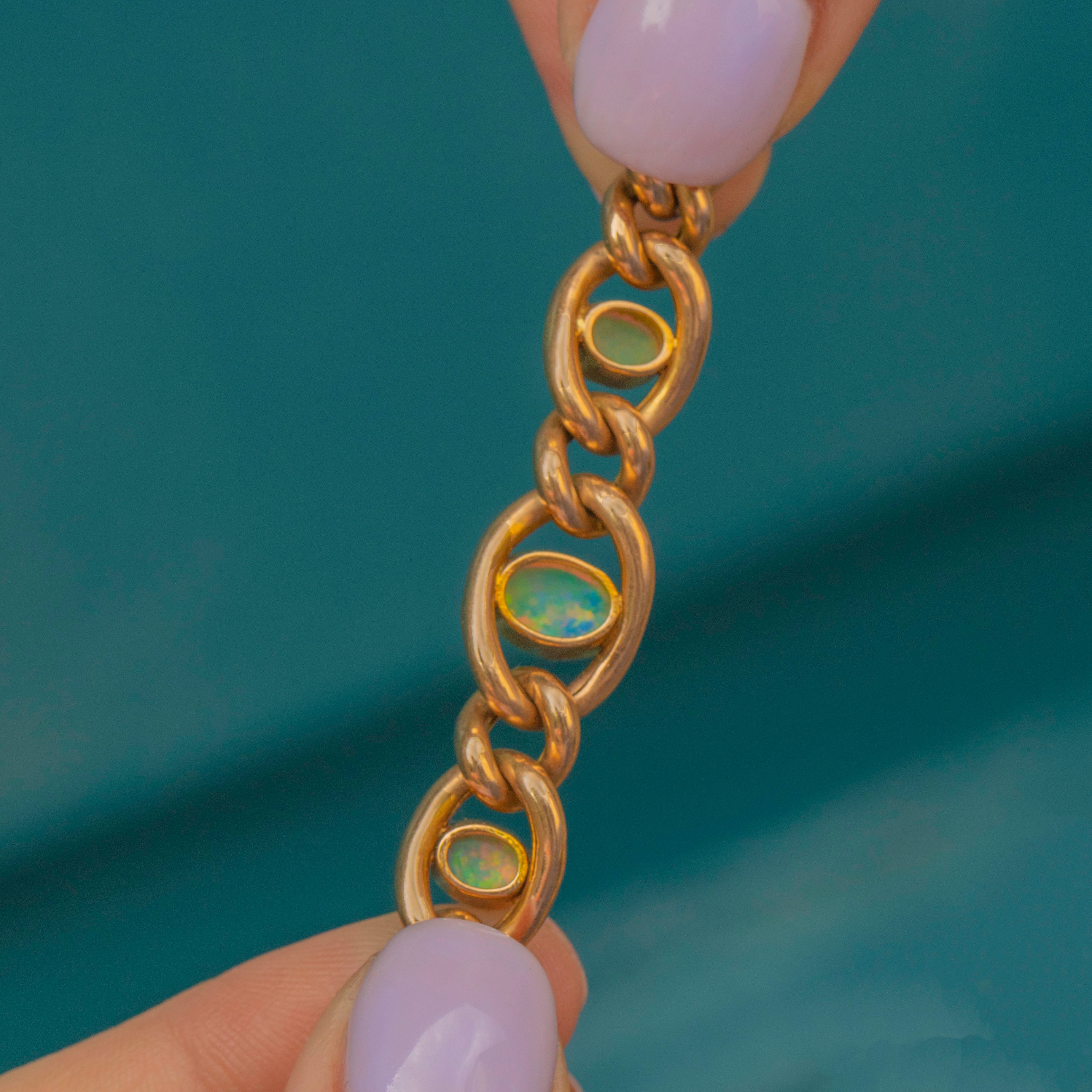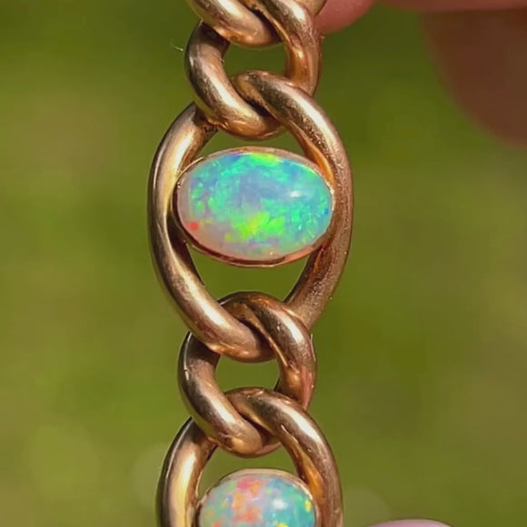 Bring luxury to your every day with this exquisite antique 15ct Gold graduating Opal bracelet! As the chunky 15ct Gold curb links elegantly wrap around your wrist, your eyes will immediately be drawn to the firework display of vivid hues emanating from the smoothly cut Opal cabochons.