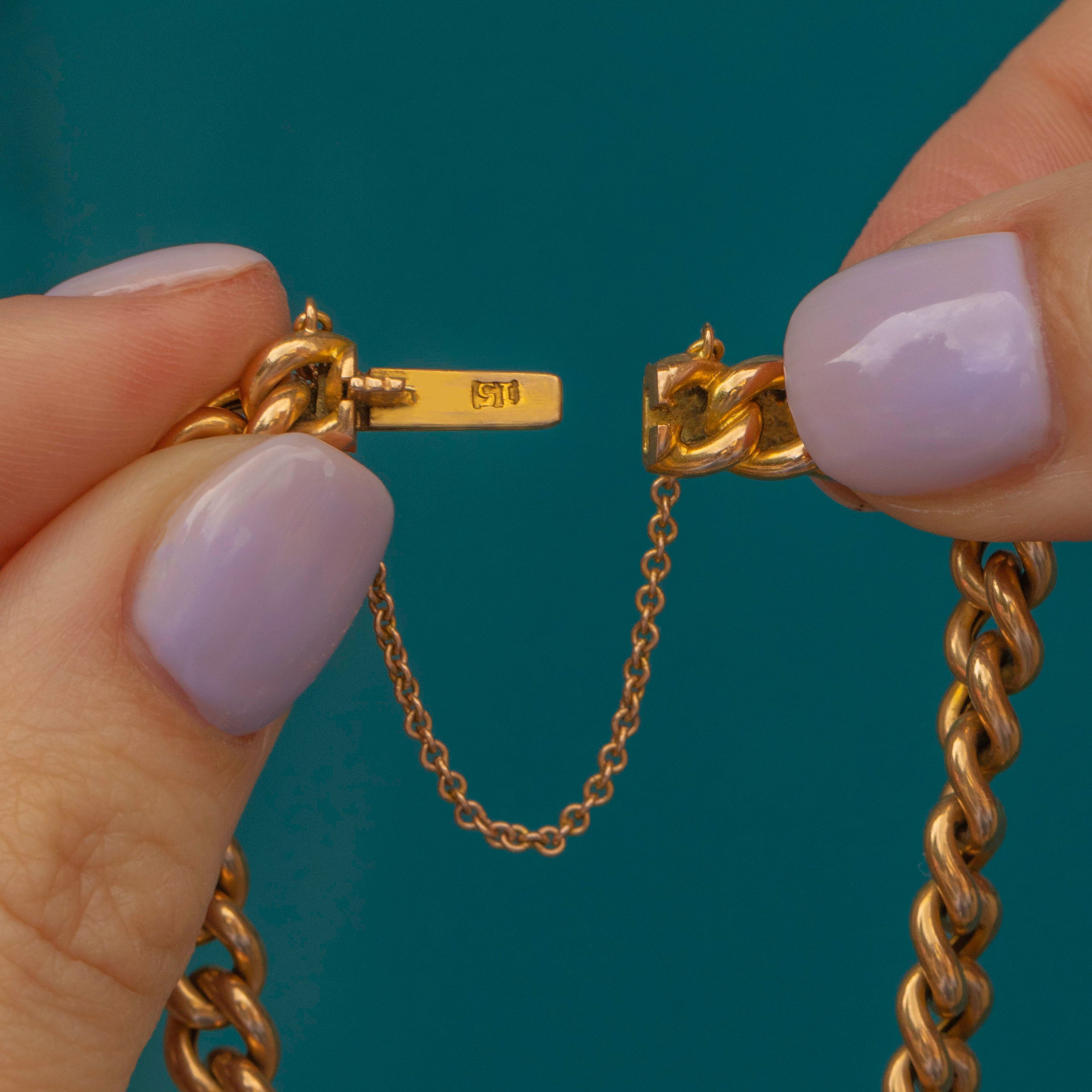 EXCELLENT. We are pleased to present this antique 15ct Gold graduating Opal bracelet in excellent condition! The smooth Opal cabochons are secure within their bezels and free from any signs of wear. The 15ct Gold has a desirable rosy hue that trickles through each securely connected link. The clasp is in perfect working condition and comes with a safety chain for added peace of mind, allowing you to wear this Victorian Opal bracelet with confidence!