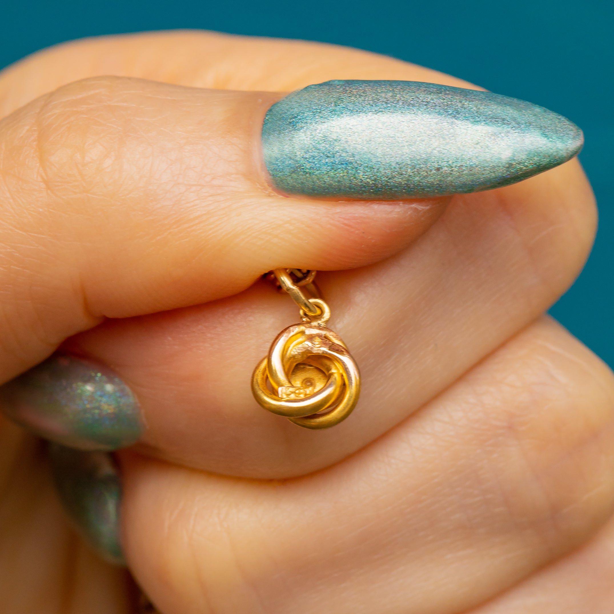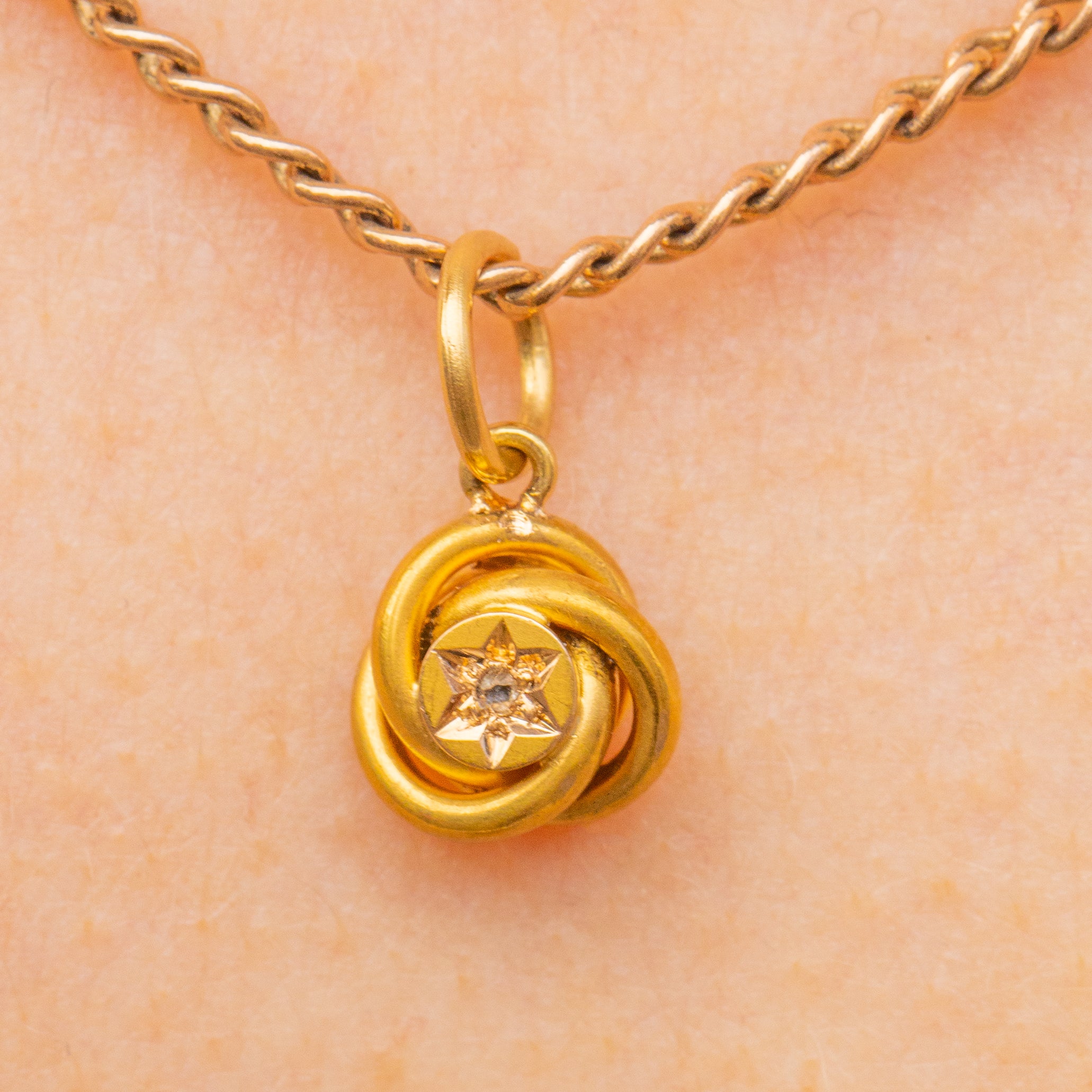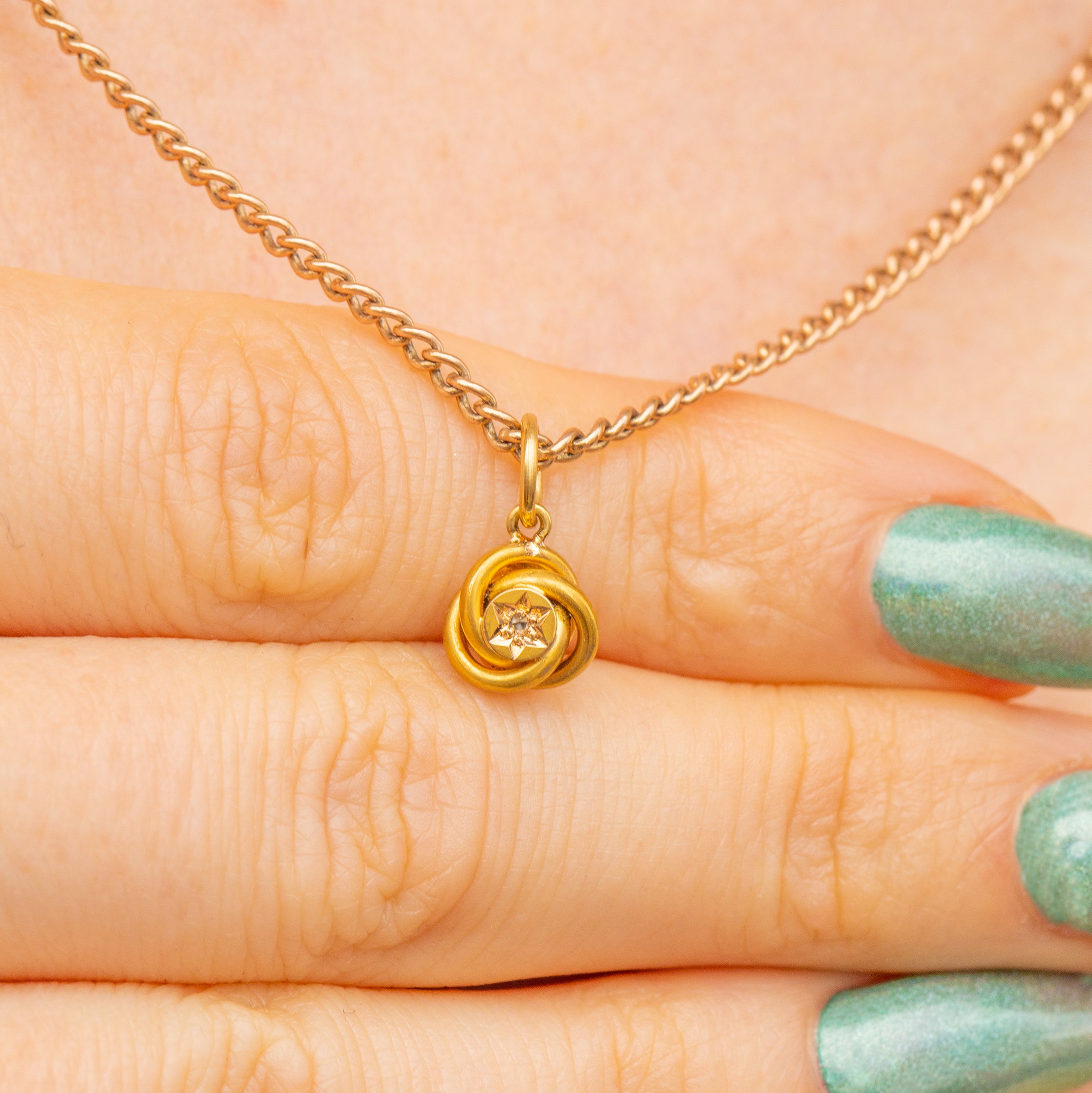 How sweet is this antique 15ct Gold lovers knot Diamond charm! Her tightly woven knot is bursting with romantic sentiment, a motif often featured within Victorian jewellery to represent an unbreakable bond, centred by a single Diamond adding a subtle sparkle.
