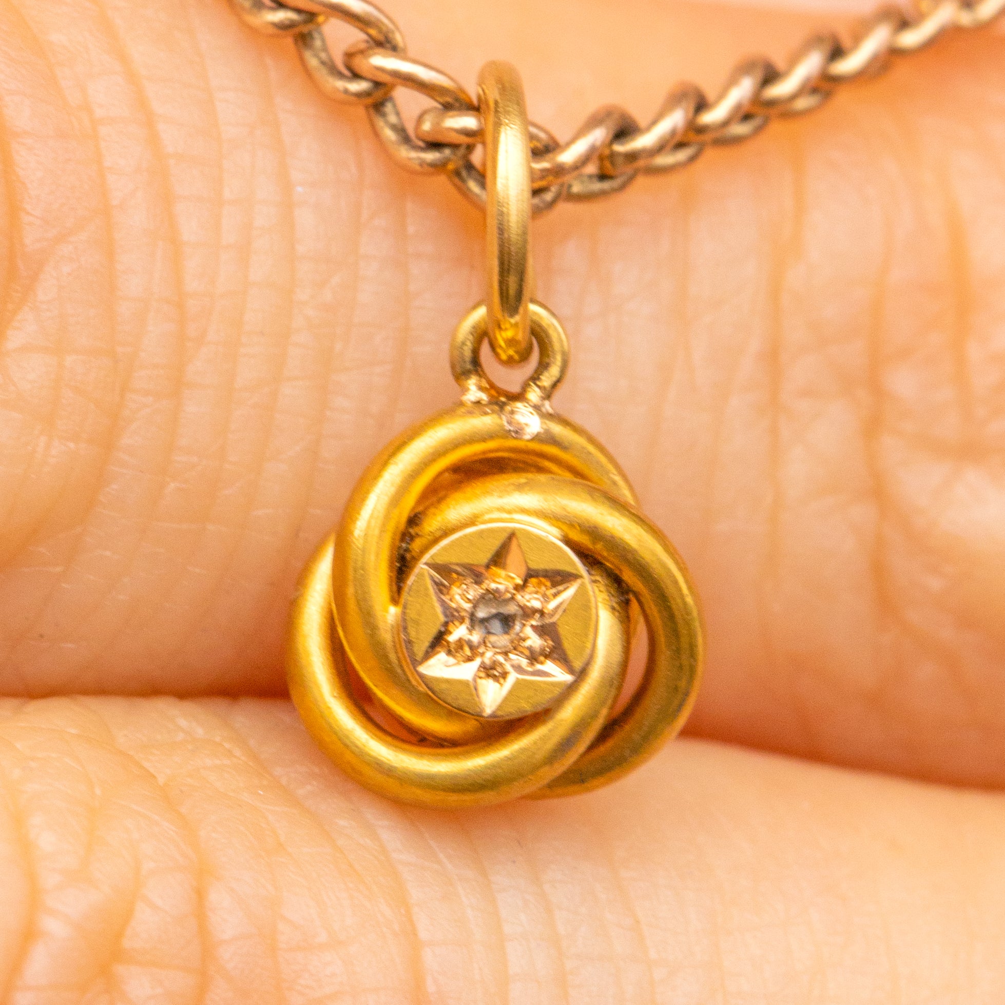 VERY GOOD. This antique 15ct Gold lovers knot Diamond charm is in very good condition. The Diamond is nestled securely within the star setting, and the star setting is crisp to the naked eye. There is some wear on the back of the charm from its previous conversion as a stick pin, but this cannot be seen when worn. With a soldered jump-ring, you can wear this Victorian pendant with confidence!