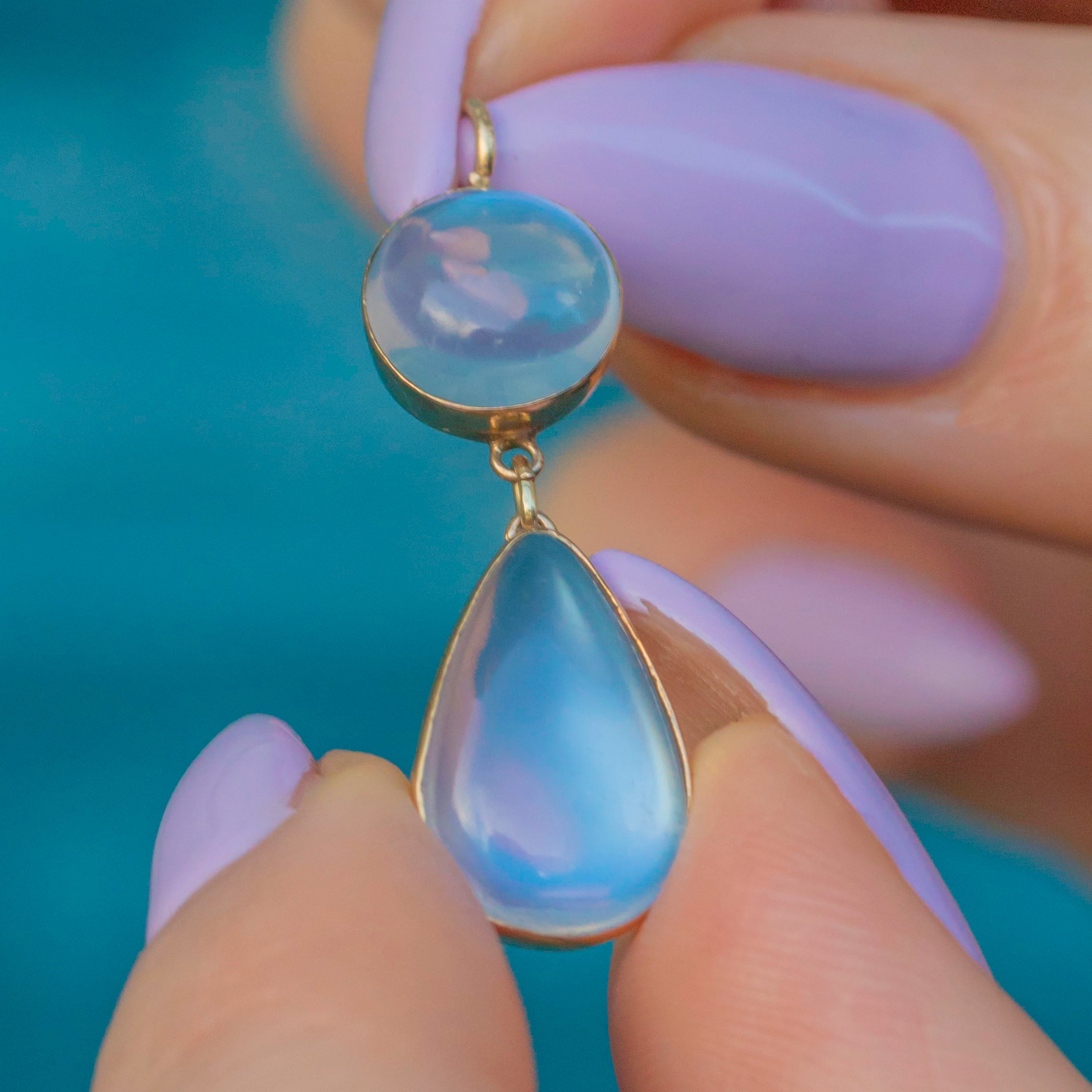 VERY GOOD-EXCELLENT. This Victorian 15ct Gold Moonstone drop pendant is in superb addition. Each Moonstone has a lovely glow, with only minor surface wear, which is difficult to spot without a jeweller's loupe. The rare 15ct Gold is buttery and holds the Moonstones securely in place. With a secure jump ring, you can wear her with confidence!