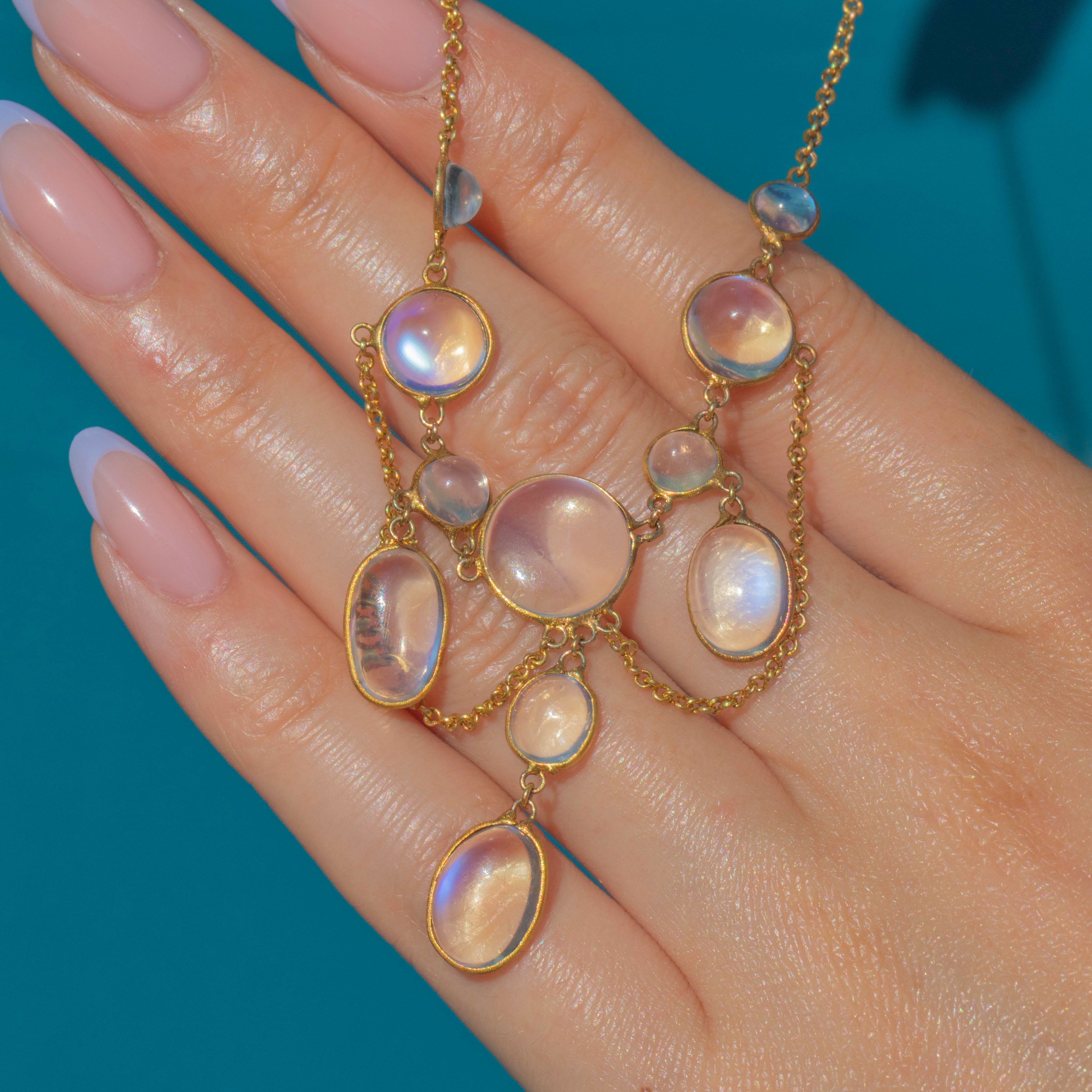 The shining droplets of moonlight, each with a glowing adularescence, are displayed within a gorgeous fringe design and possess a fluidity like no other. Simply drape her across your décolletage for a timelessly elegant allure.