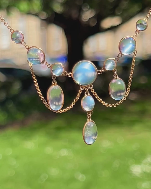 Crafted from rich, buttery 15ct Gold and inlaid with 11 mystical Moonstones, boasting a combined carat weight of 10.55ct, this Victorian necklace emits a luminous silvery adularescence.