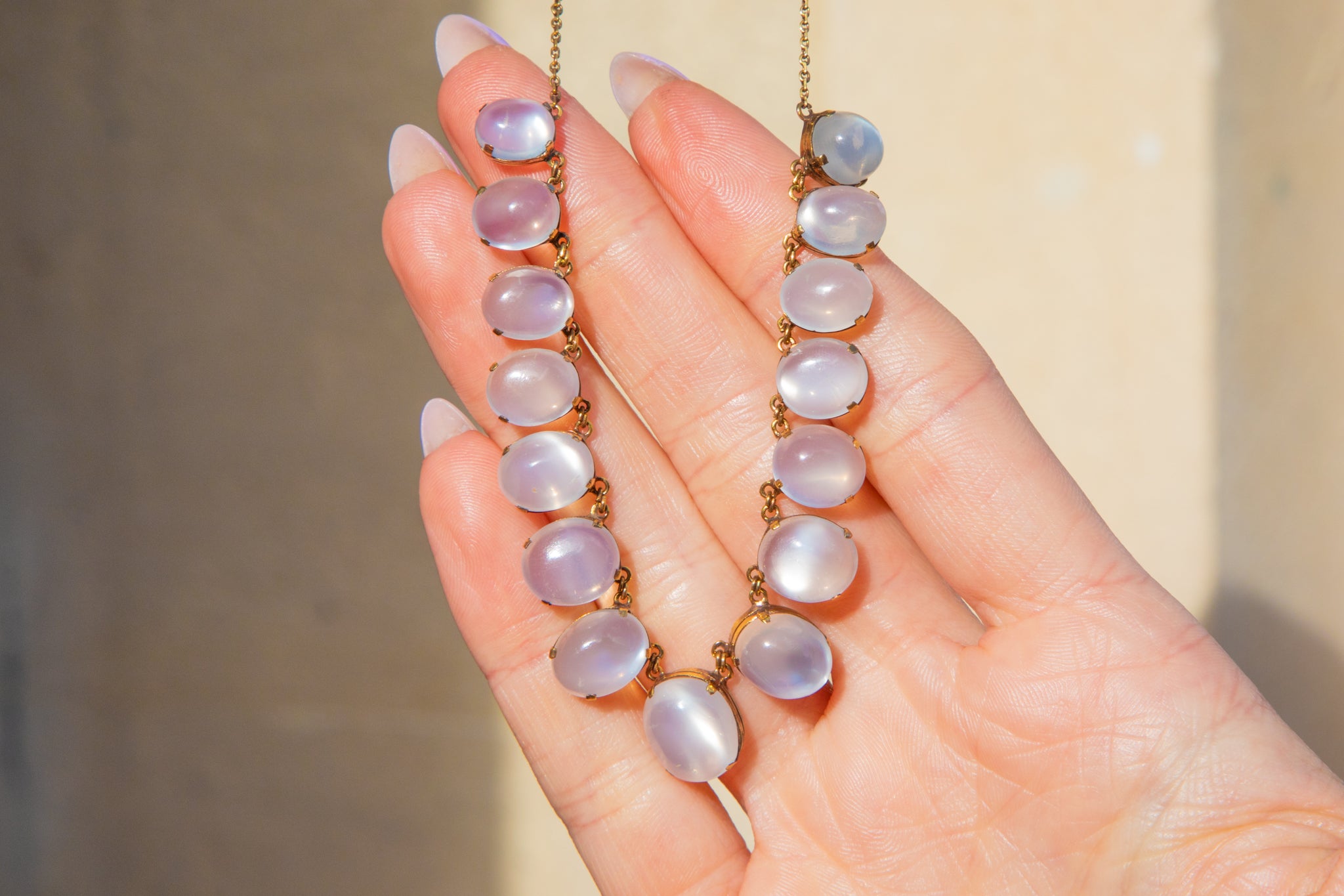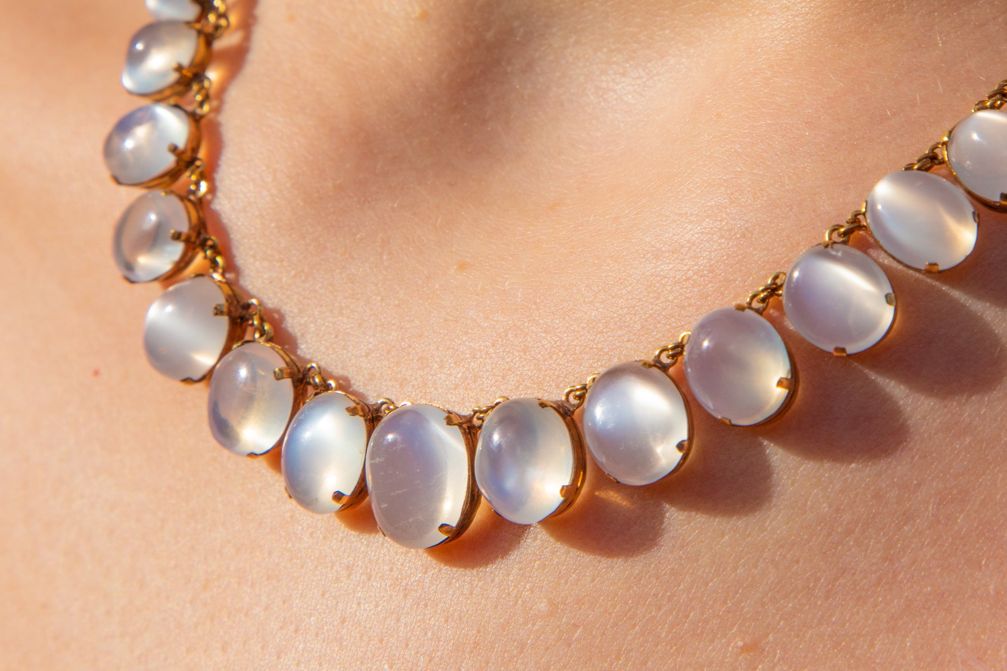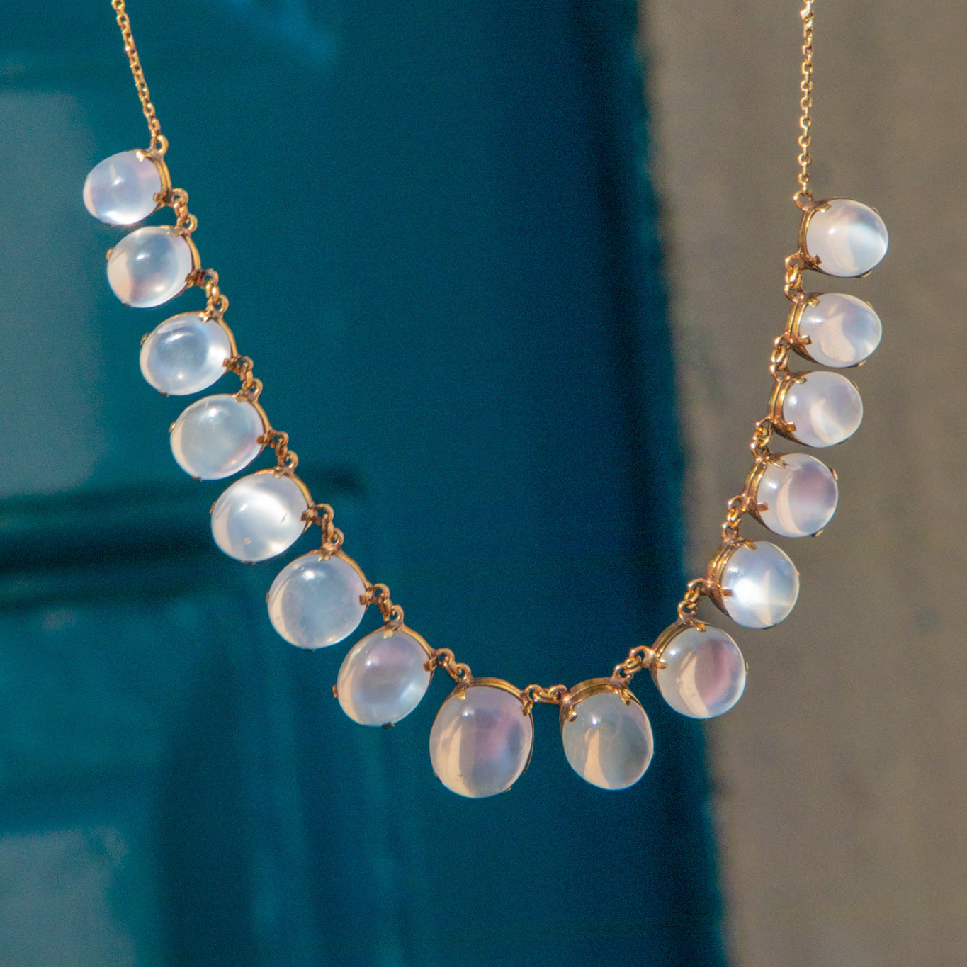 Fall in love with this classic antique 15ct Gold Moonstone fringe necklace. Boasting fifteen mystical cabochon cut Moonstones, this turn-of-the-century treasure carries 30.00cts of the precious healing stones.