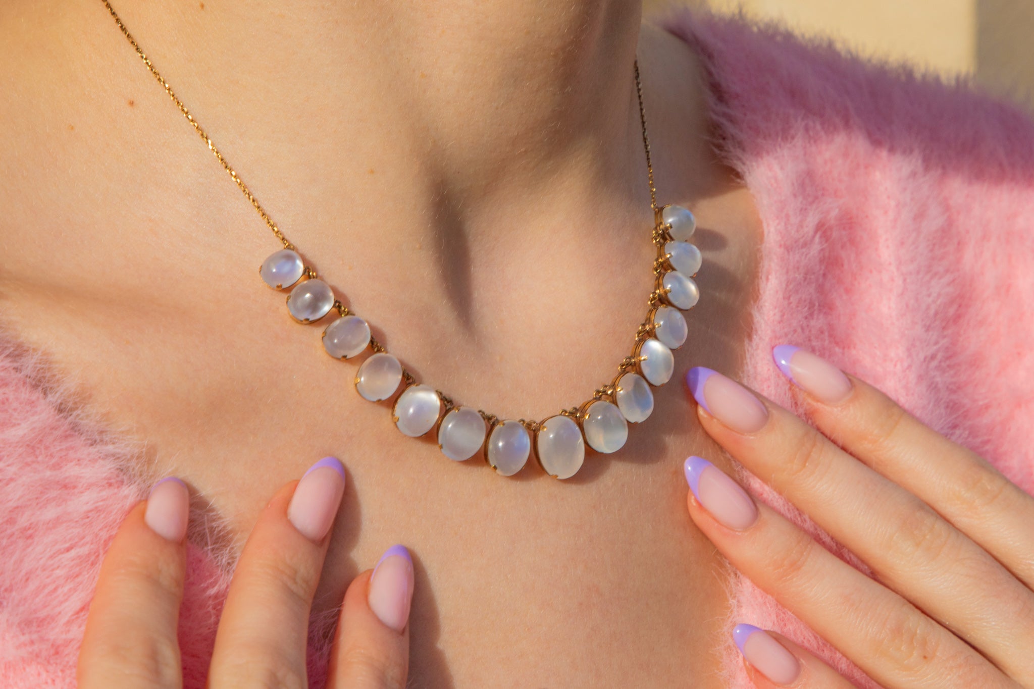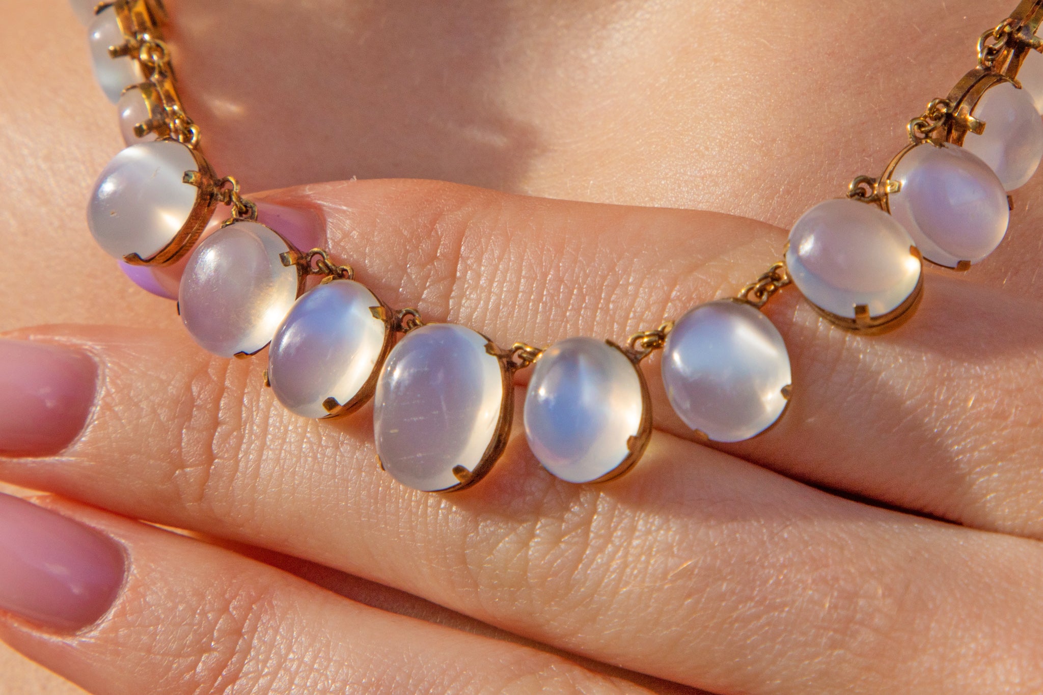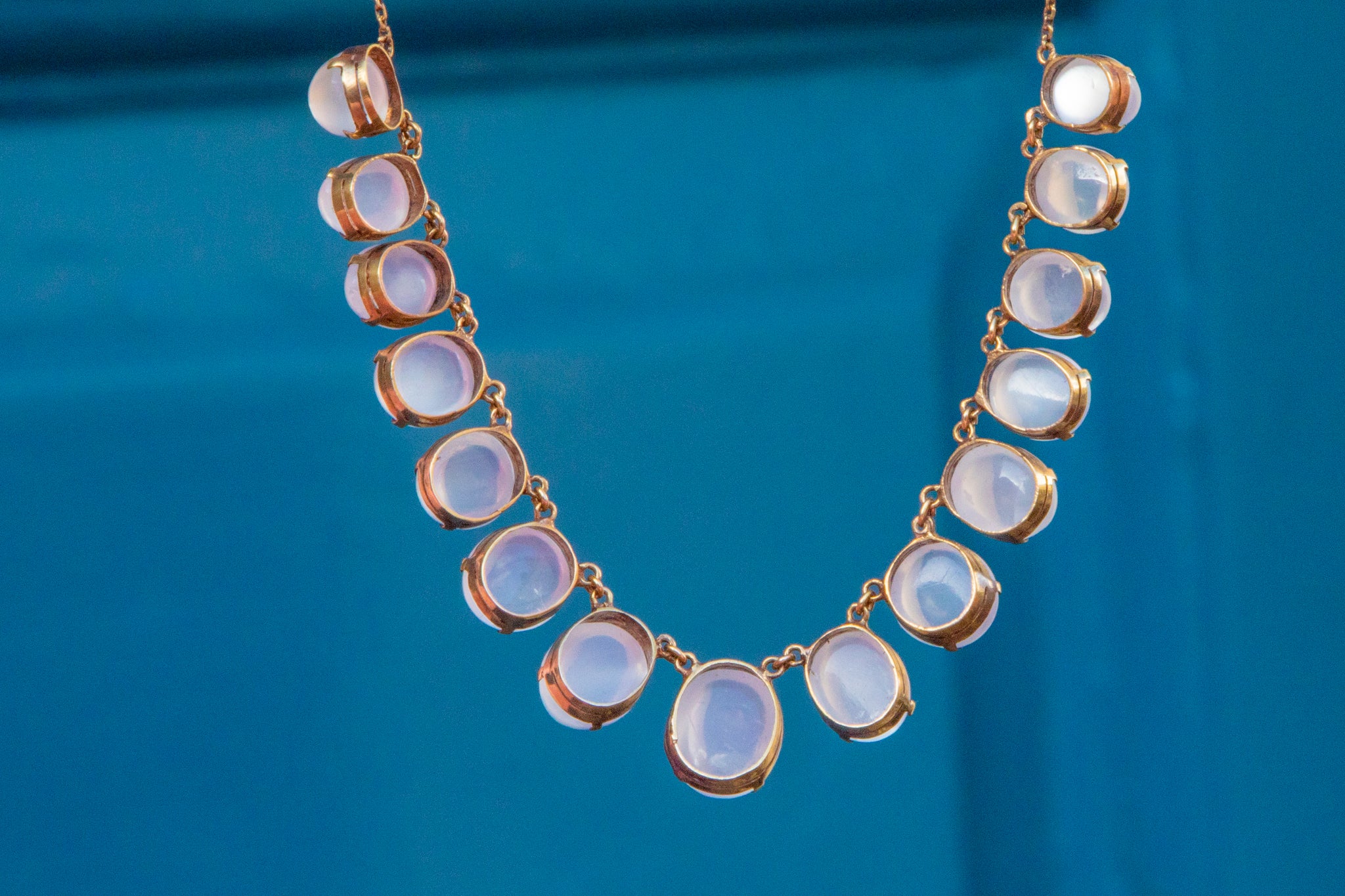 Fall in love with this classic antique 15ct Gold Moonstone fringe necklace. Boasting fifteen mystical cabochon cut Moonstones, this turn-of-the-century treasure carries 30.00cts of the precious healing stones.