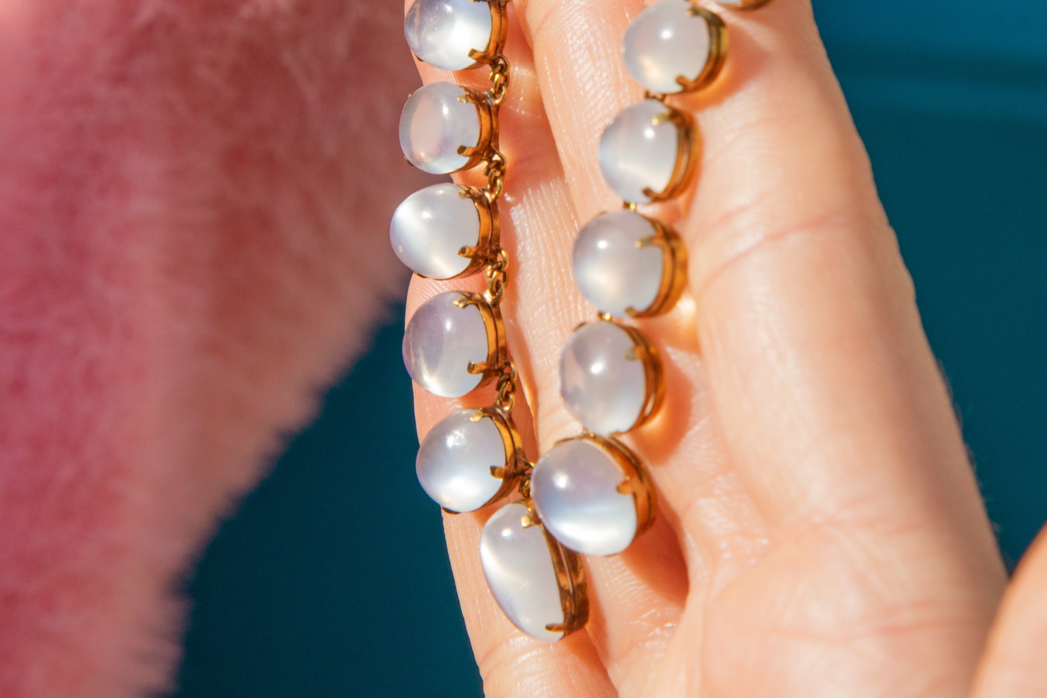 Moonstones are loved for their magical appearance, and these cabochon-cut Moonstones have a hypnotising adularescence. The fringe detail will sit beautifully against your neck, emanating a similar light to the moon on a jet-black night!