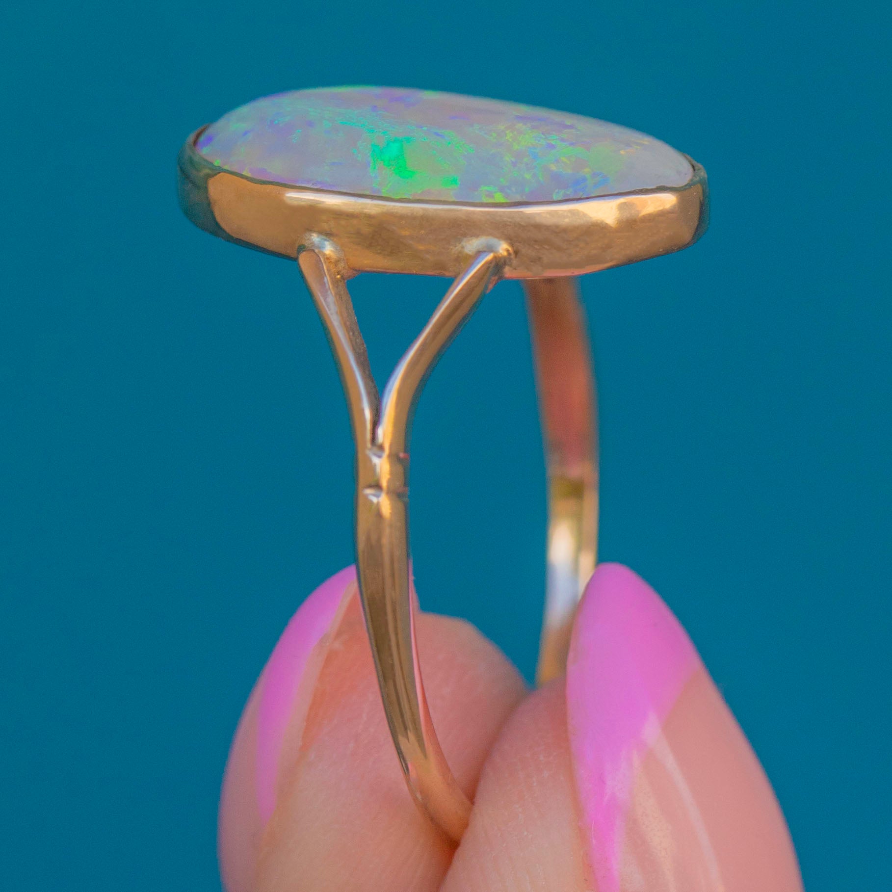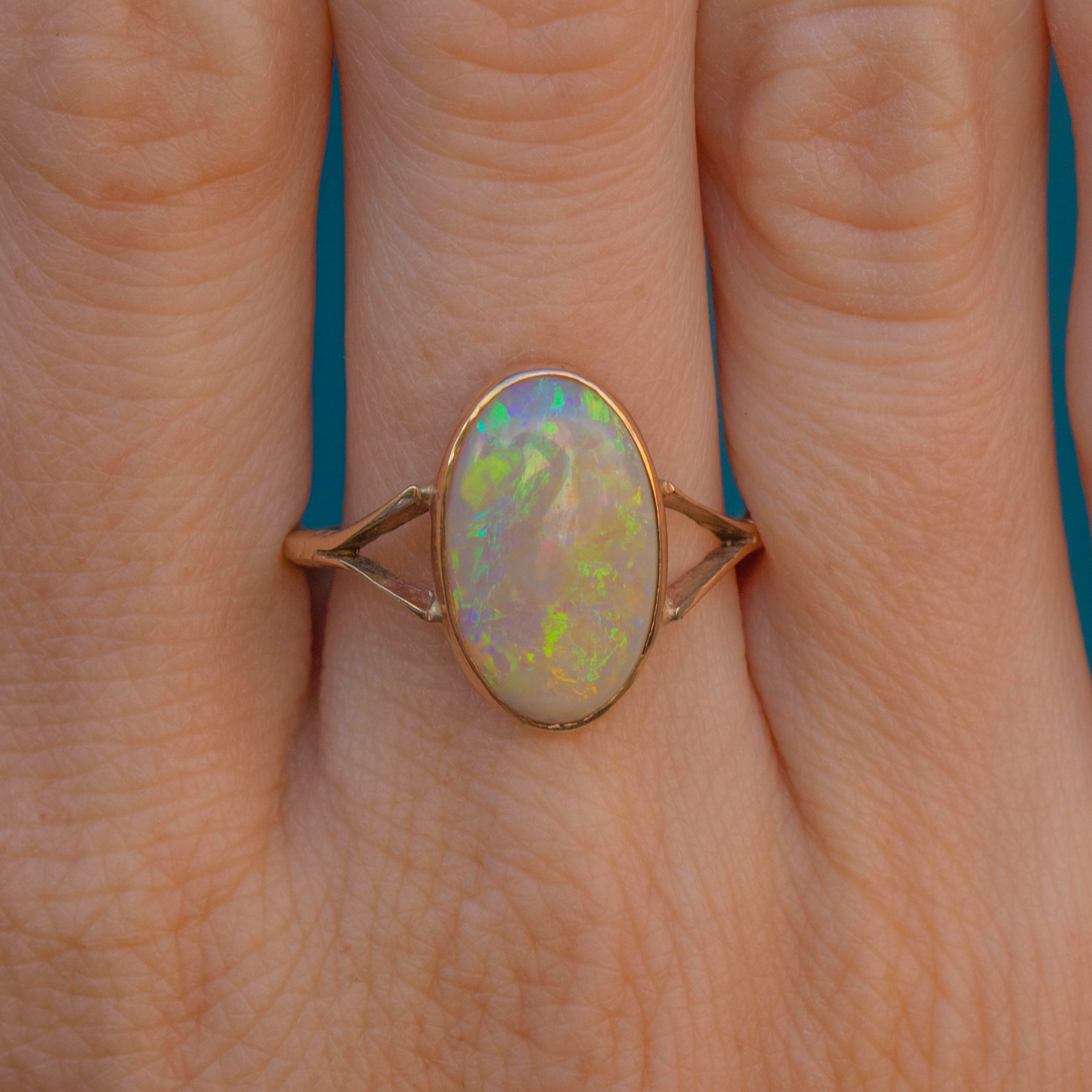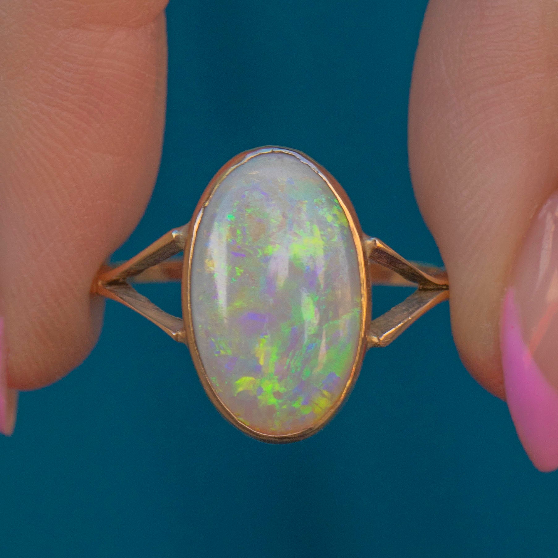 EXCELLENT. This antique 15ct Gold Opal cabochon ring is in excellent condition. The Opal sits securely within the setting, flaunting a mesmerising play of colour. The form of the band has stood the test of time, with ultimate comfort in mind. With so much antique beauty to offer, it's hard to resist this Victorian Gold ring.