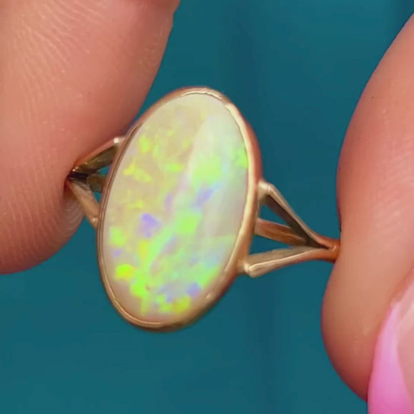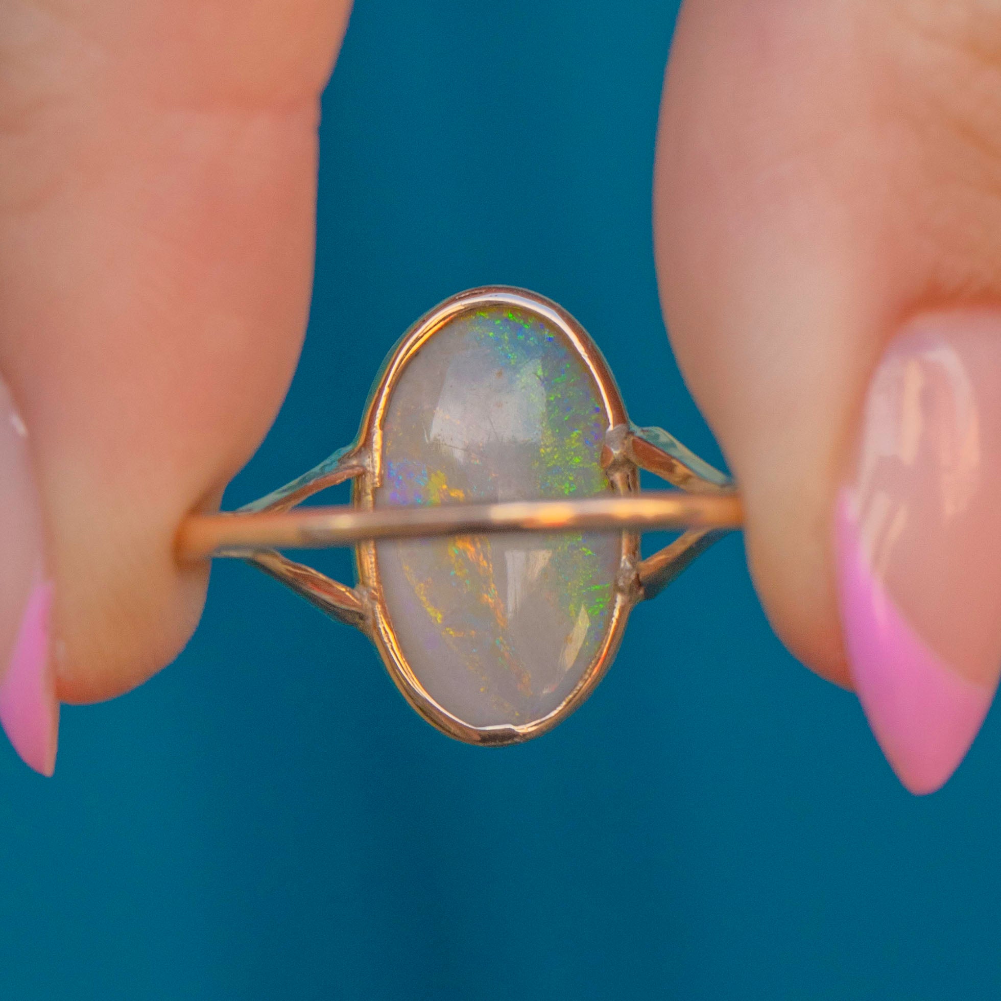 The classic design of this antique 15ct Gold Opal cabochon ring is what makes her so irresistible! A smooth 2.45ct Opal provides great finger coverage, with her play of colour catching beneath the light remarkably.