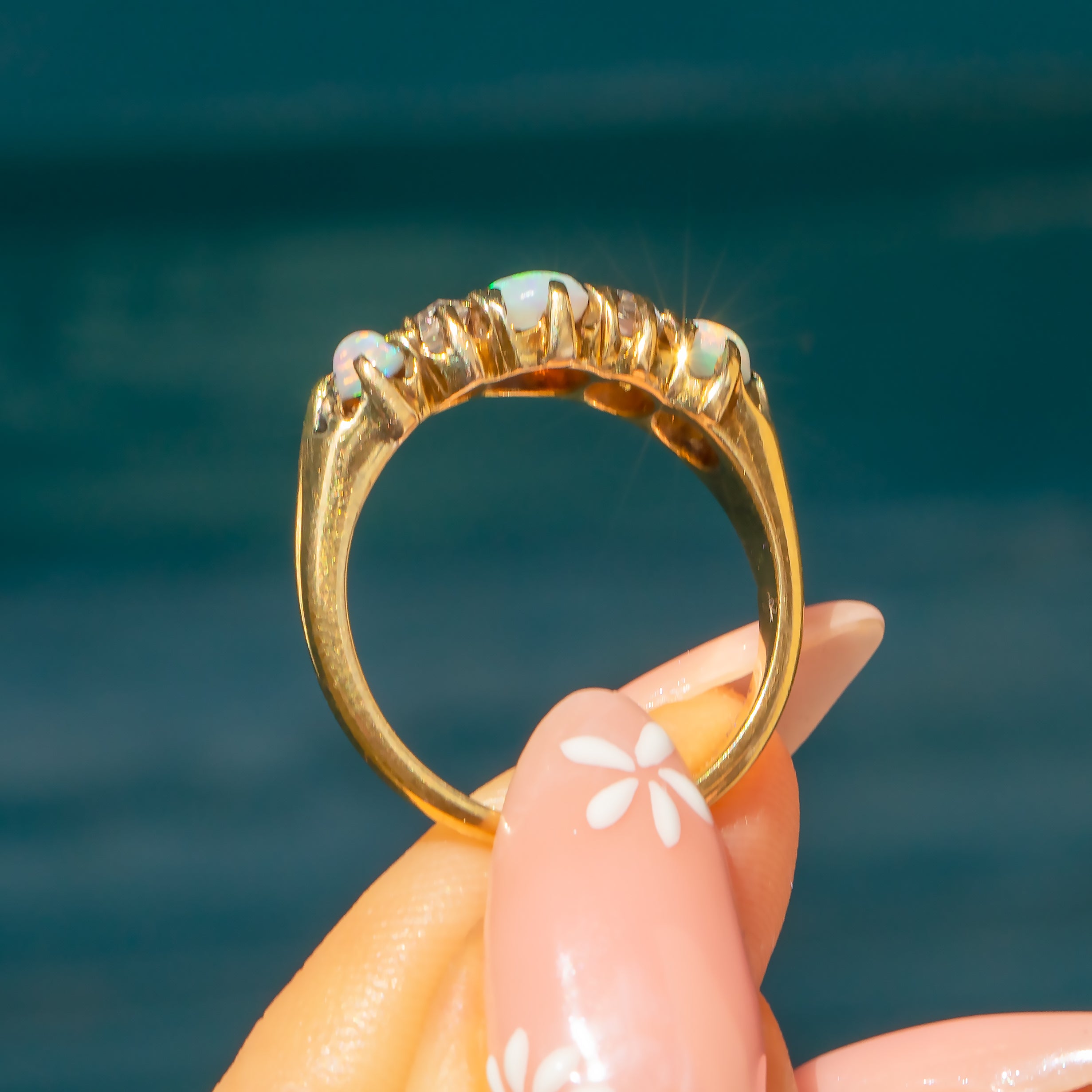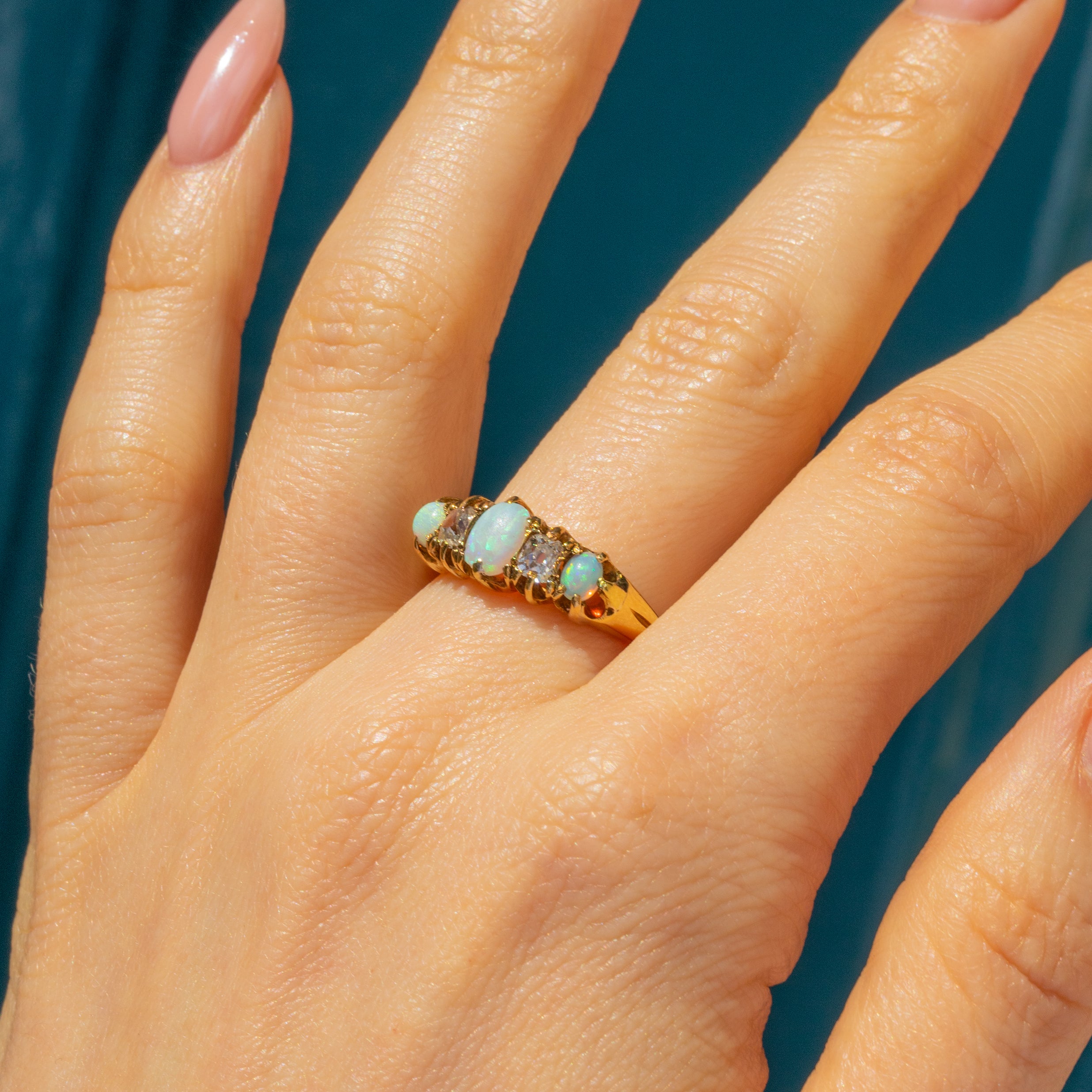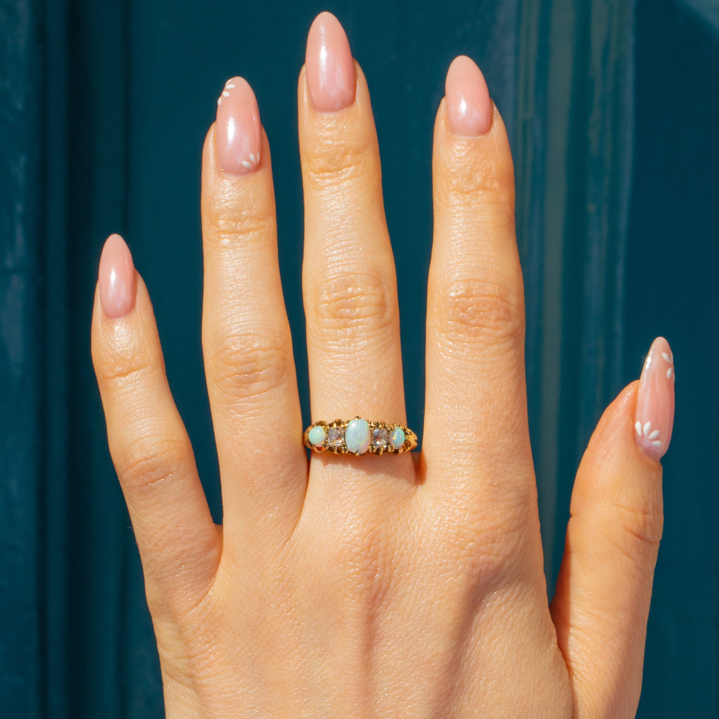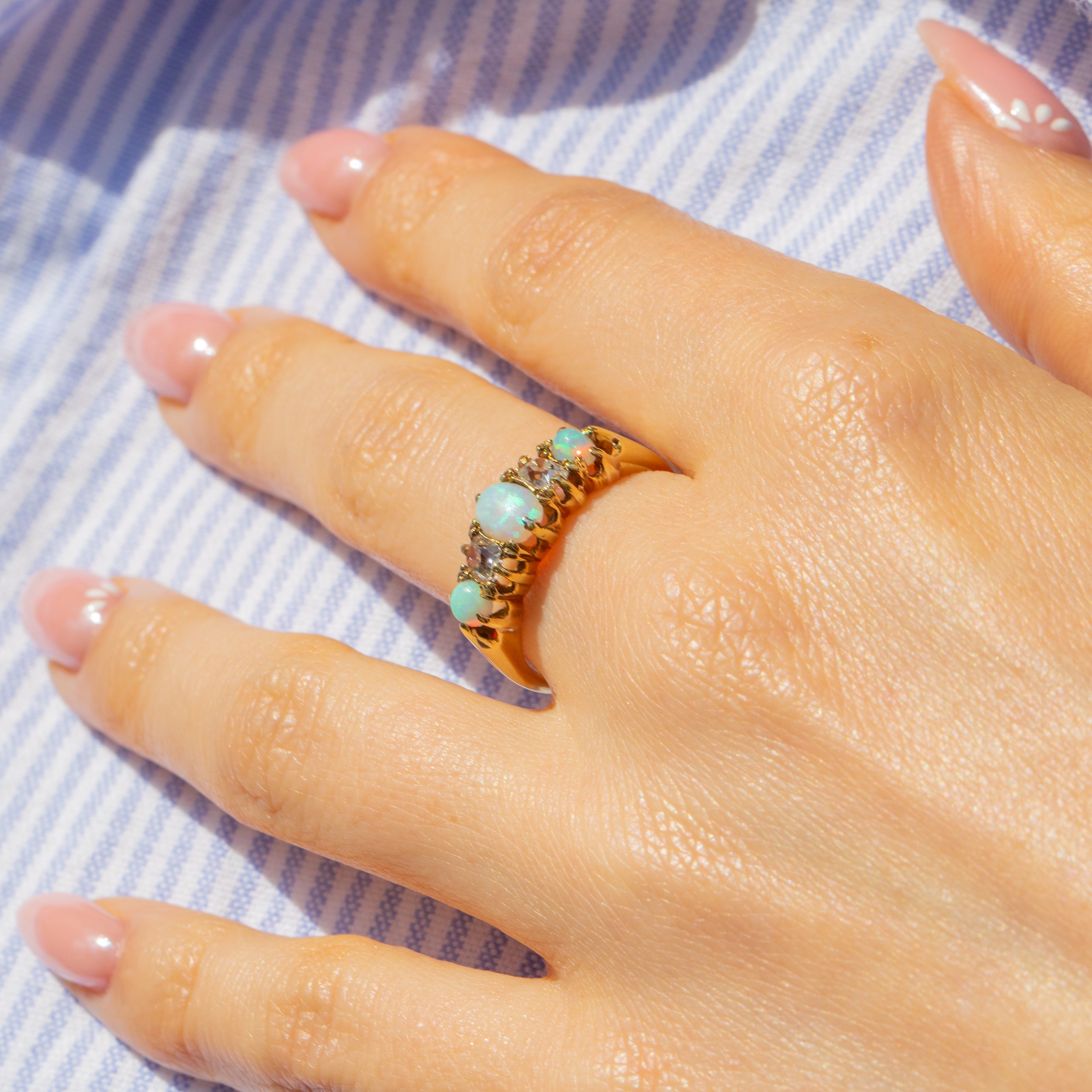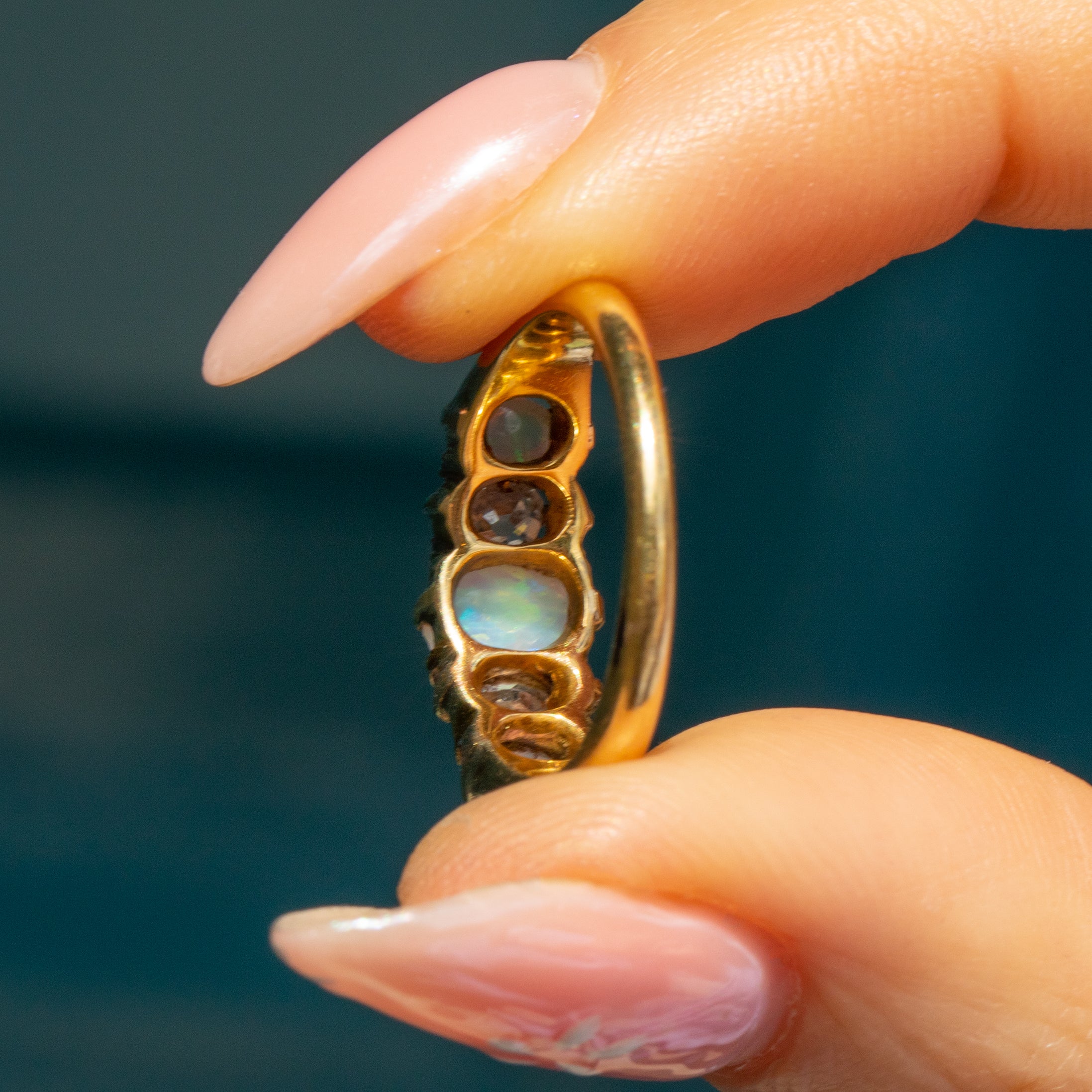This sensational antique 15ct Gold Opal Diamond boat ring will bring undeniable Victorian charm to your curated ring stack! This five-stone ring provides excellent finger coverage and boasts a delectable selection of gemstones displayed within 15ct Gold claws.