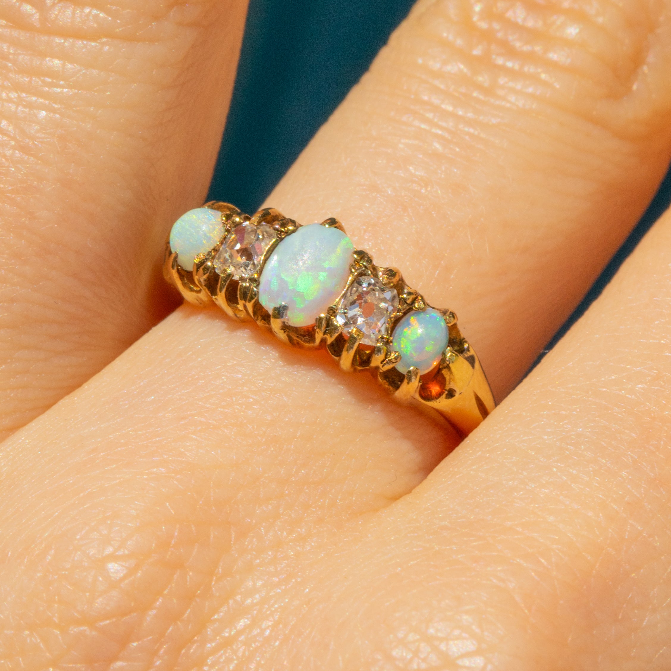 Neon green and electric blue sprinkled with hints of orange and peach sparkle across each smoothly cut Opal cabochon, with two old mine-cut Diamonds adding scintillation and fire; this Victorian boat ring will enchant anyone lucky enough to lay eyes on her!