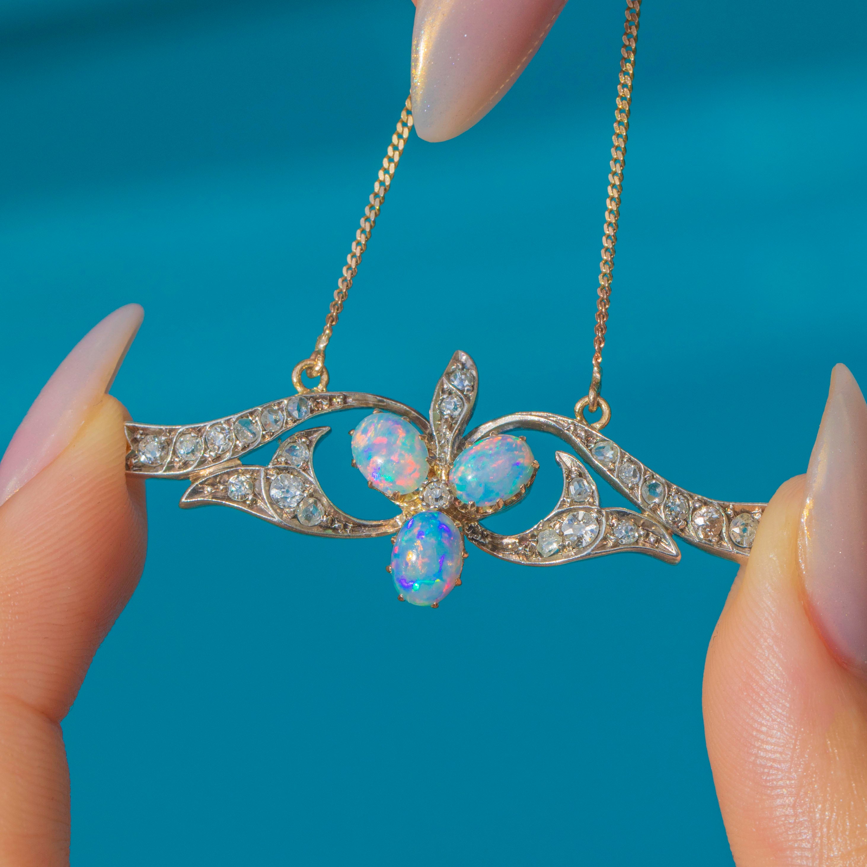 EXCELLENT: This antique 15ct Gold Opal and Diamond shamrock necklace is in excellent condition. Each gemstone sits securely within its setting and is free from any visible signs of wear. Her pendant is securely attached to her chain, and with her bolt ring in perfect working order, you can wear her with confidence.
