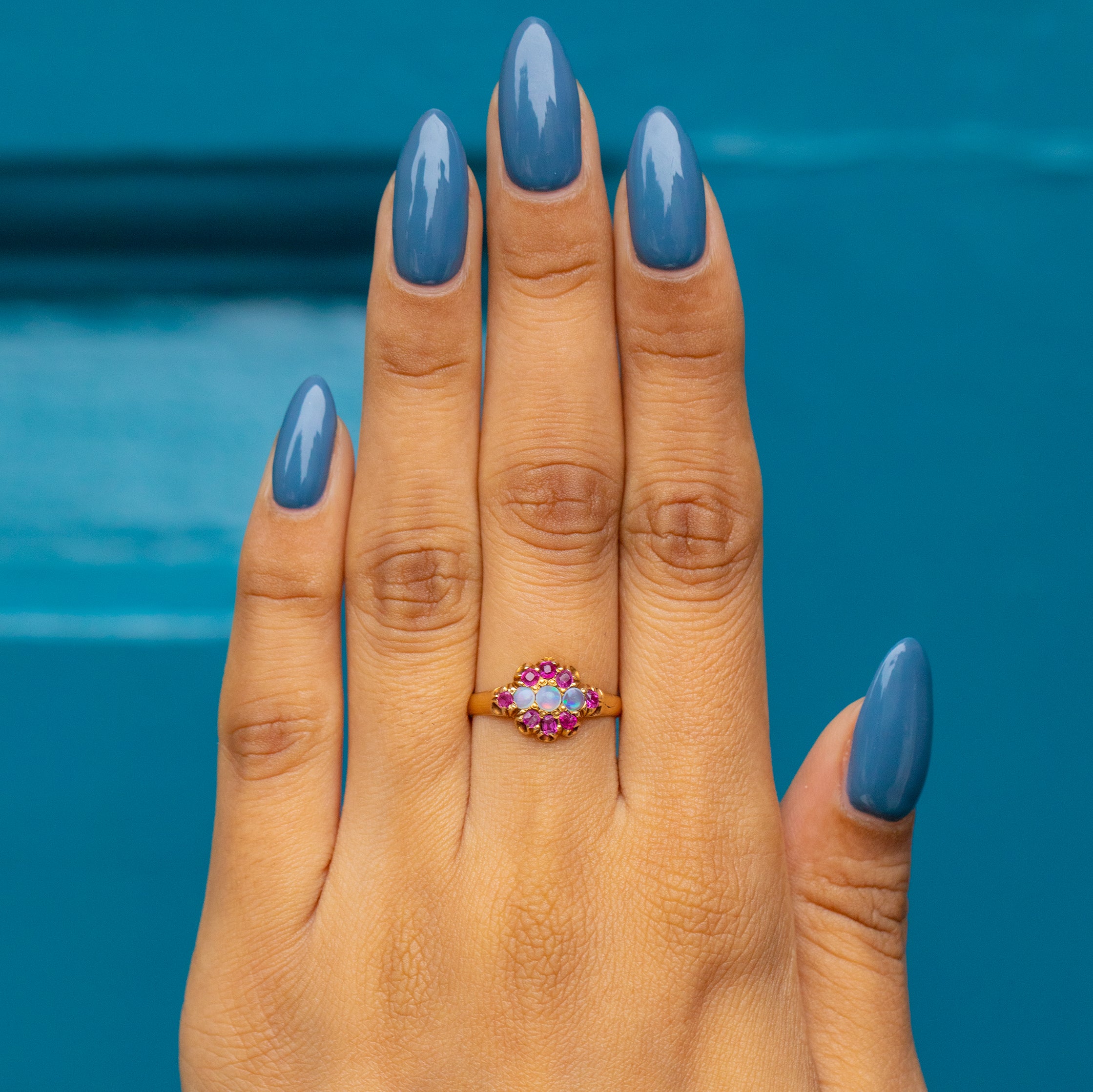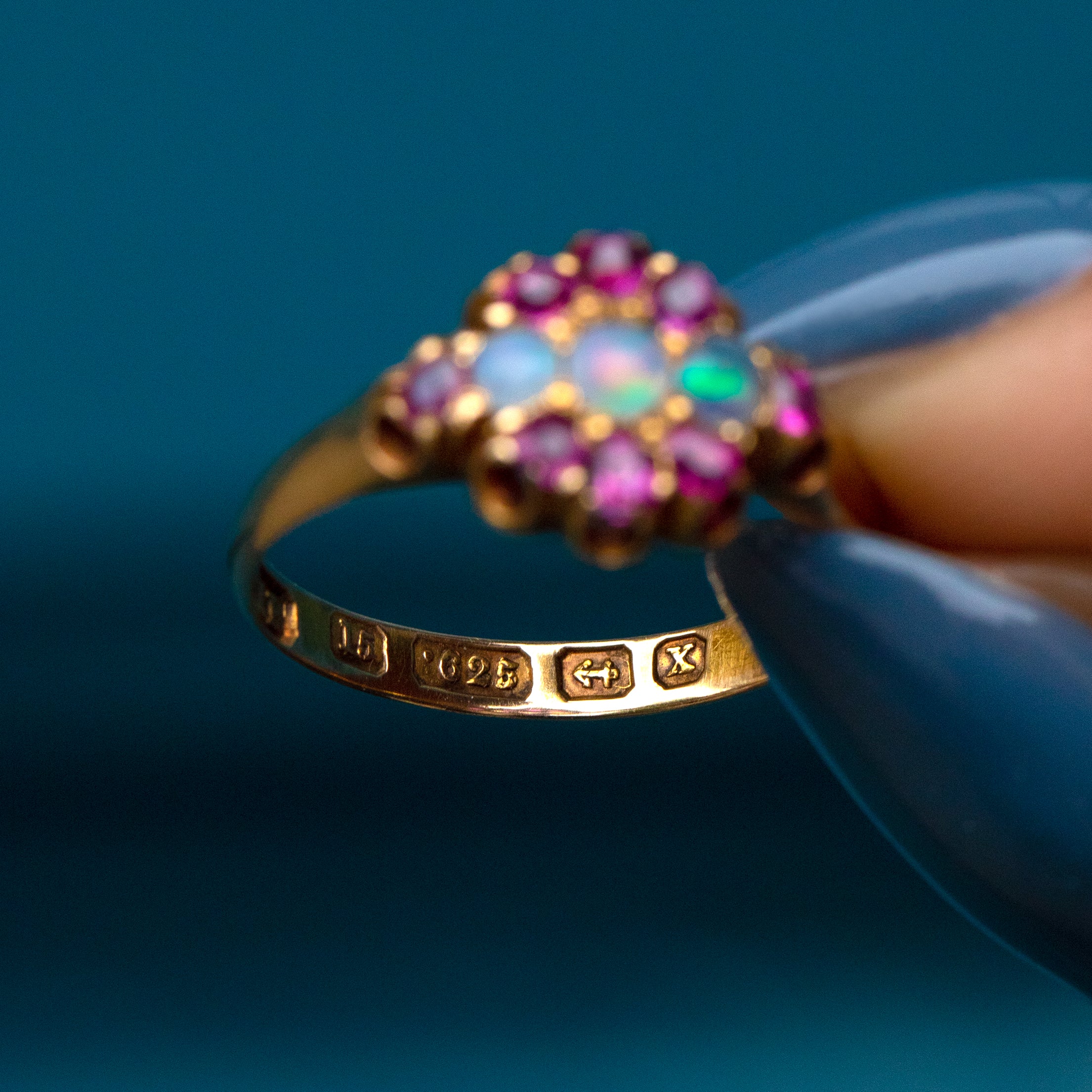 VERY GOOD. This antique 15ct Gold Opal Ruby cluster ring is offered in very good condition. The gemstones are securely set within their 15ct Gold settings. One of the Rubies has a minor nibble, however, this is only noticeable under closer inspection. The Opals are smooth to the touch and shimmering with vibrant hues. The band exhibits a minor dent on the shoulders, but this does not affect the integrity of the piece. The ring is fully hallmarked and the 15ct Gold is lustrously shiny and robust. With proper care and maintenance, this cluster ring will last for generations to come!
