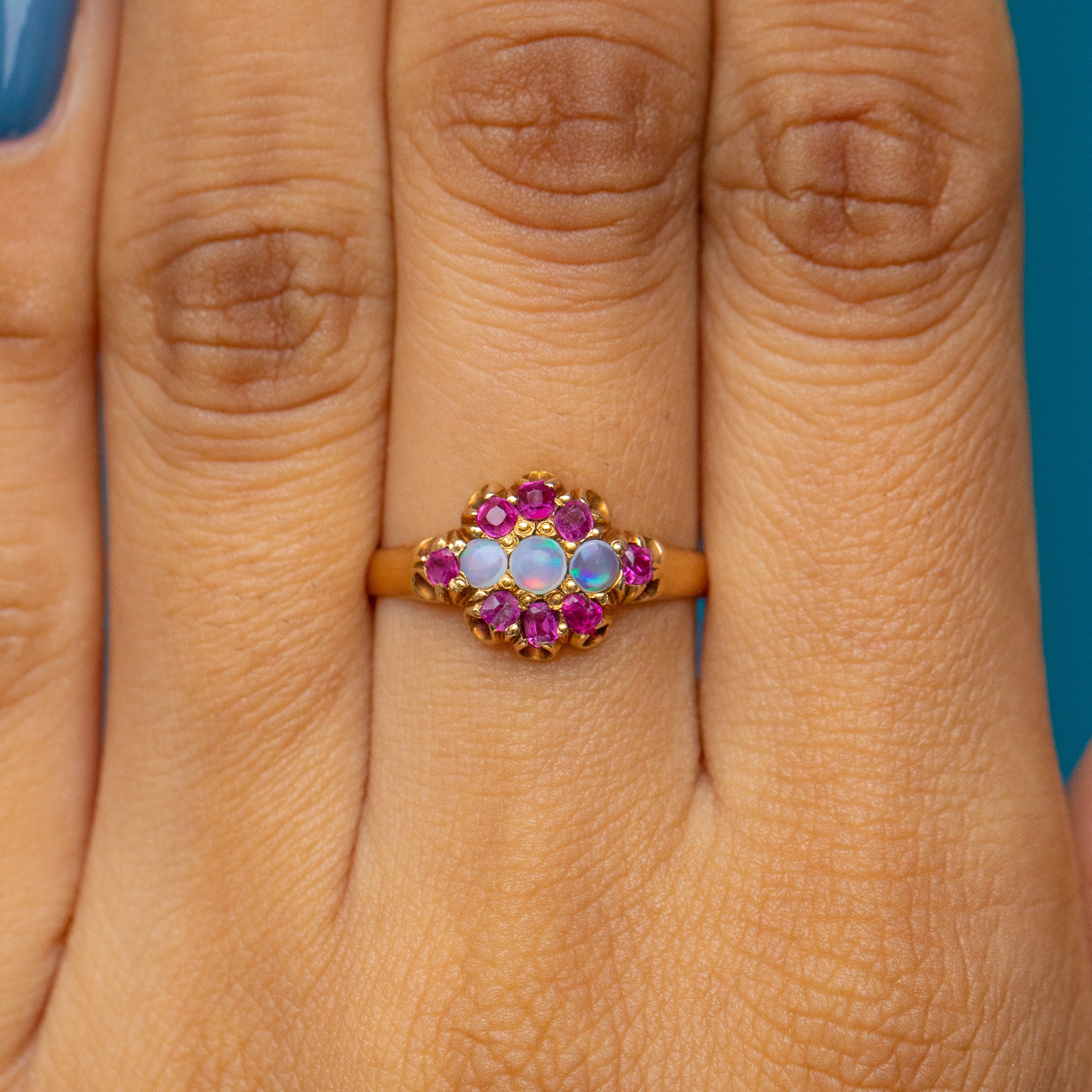 This antique 15ct Gold Opal Ruby cluster ring is a beautiful find! Jam-packed with sumptuous gemstones, this Victorian ring is composed of an Opal trilogy center haloed by eight fuchsia Rubies.