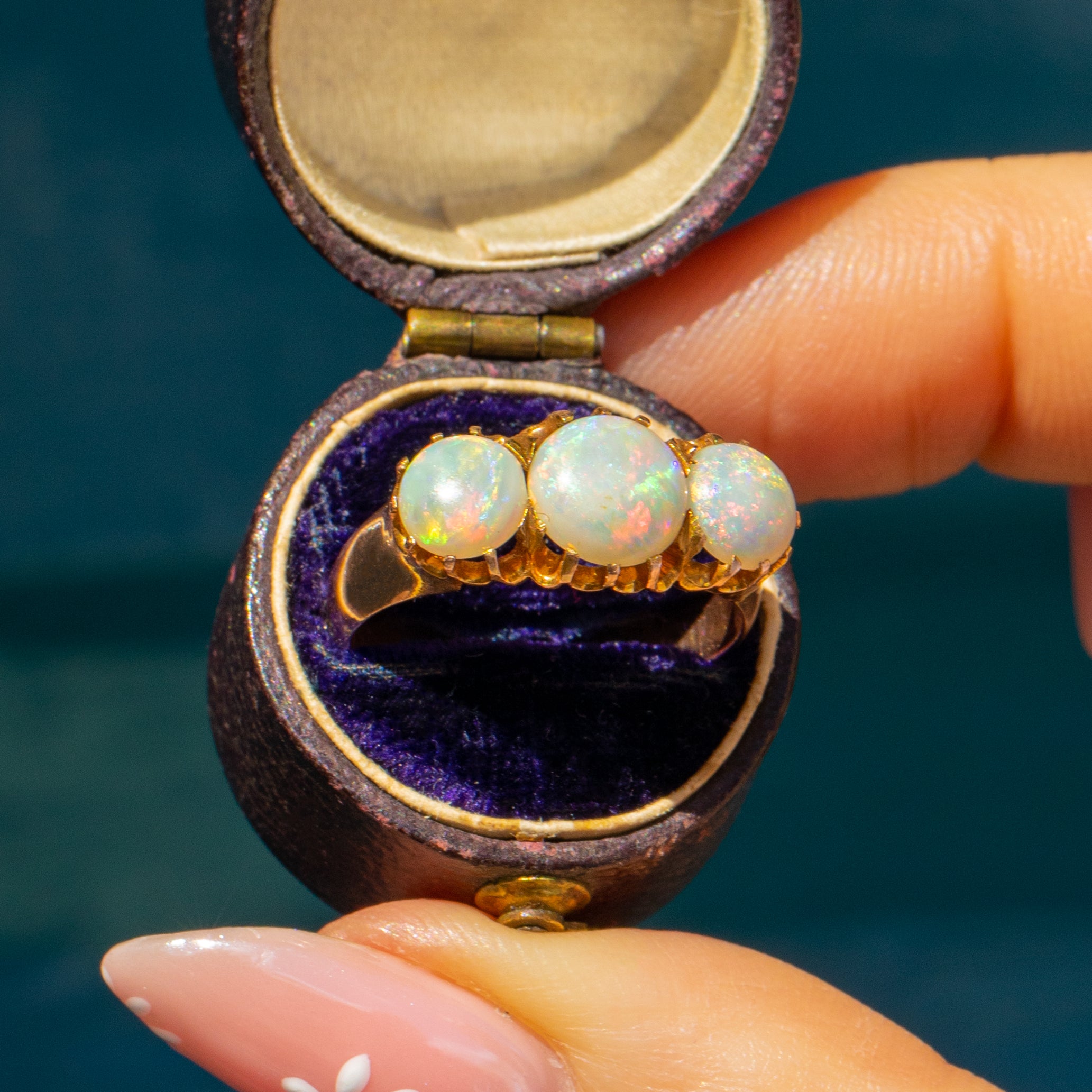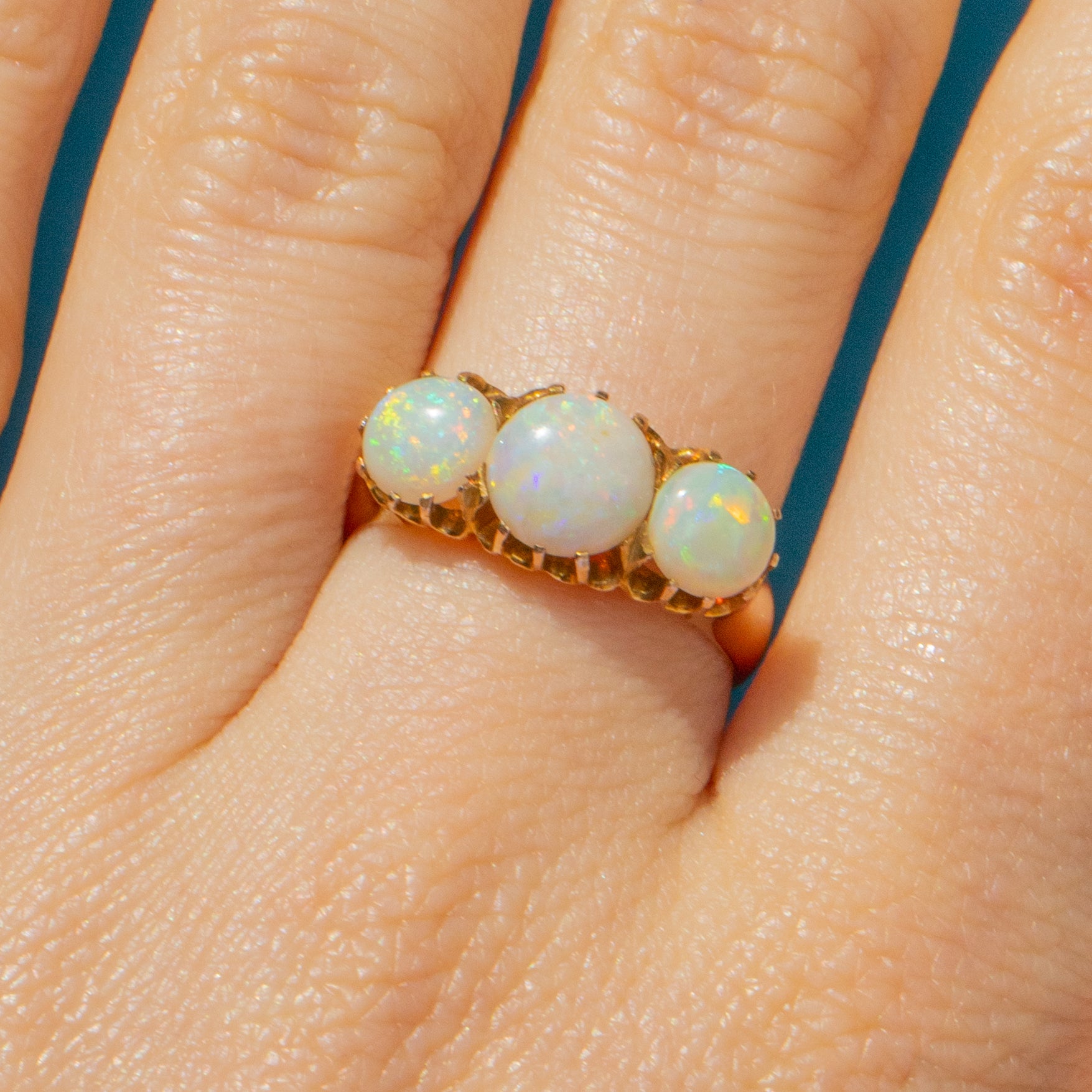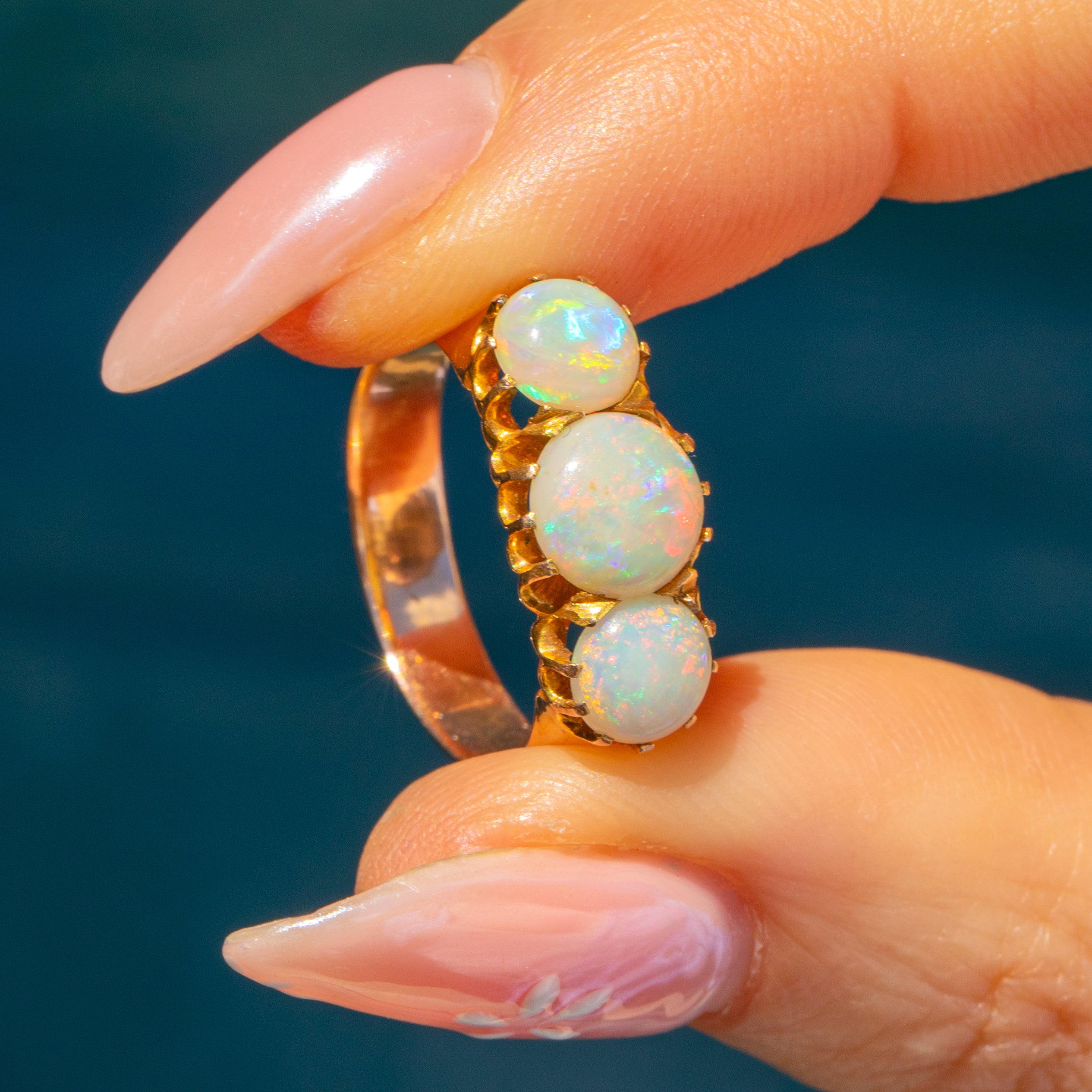 This antique 15ct Gold Opal three stone ring will provide your finger with a magnificent band of vividly colourful Opals, totalling 1.30ct. Secured in place by skilful claw settings, the light streams through enhancing the vivid greens and peaches flashing across their plump cabochon surfaces.