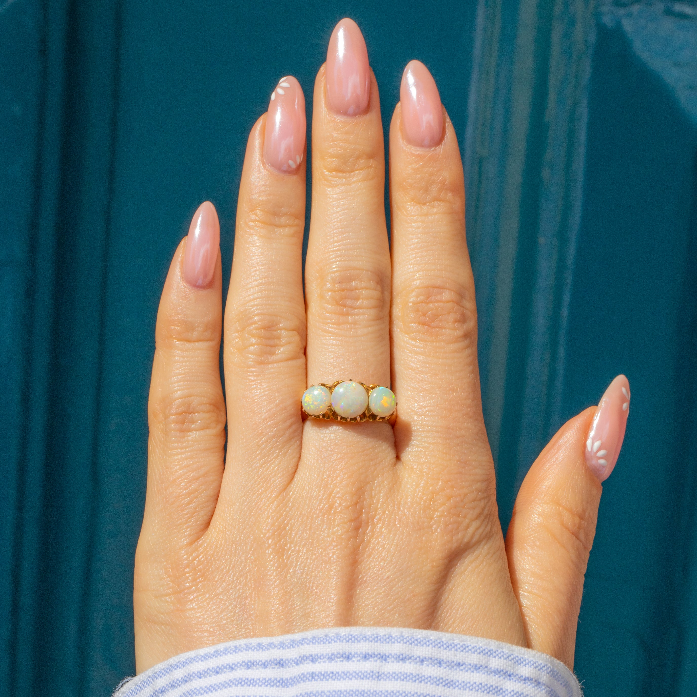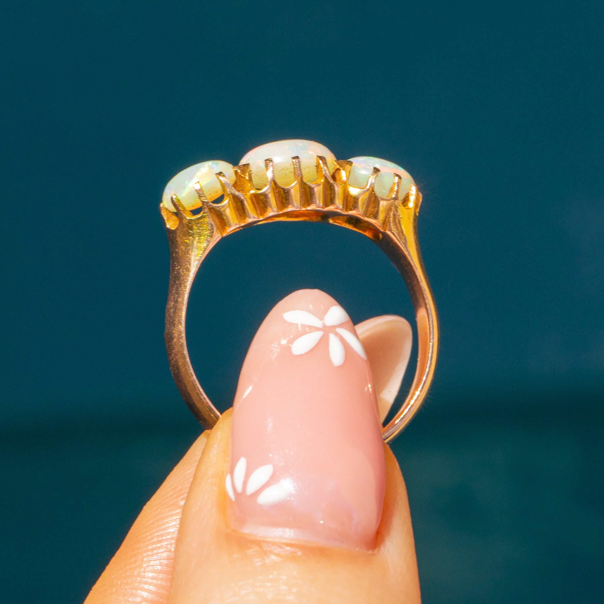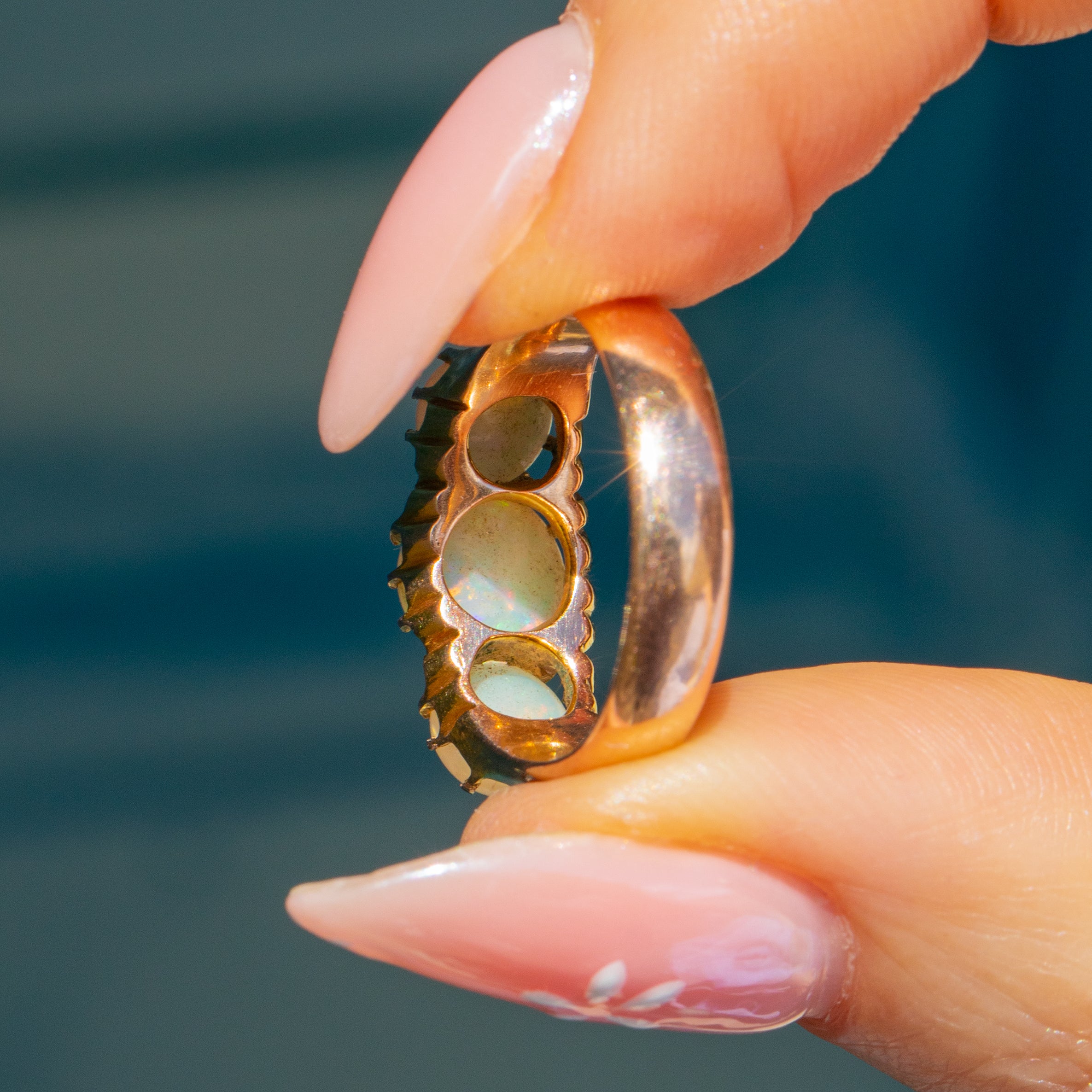 This antique 15ct Gold Opal three stone ring will provide your finger with a magnificent band of vividly colourful Opals, totalling 1.30ct. Secured in place by skilful claw settings, the light streams through enhancing the vivid greens and peaches flashing across their plump cabochon surfaces.