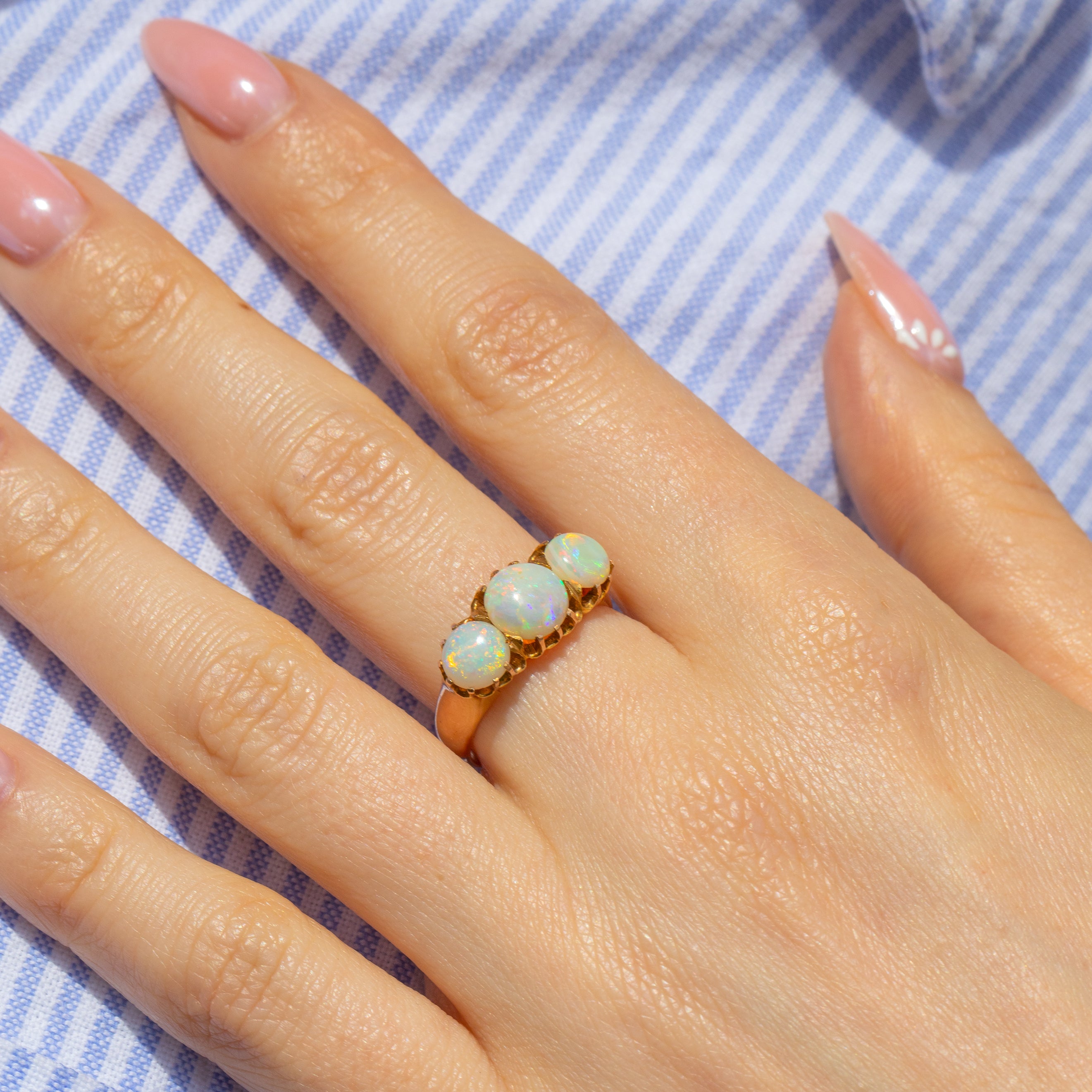 EXCELLENT. This Victorian Opal trilogy ring is in great antique condition. The band is bright with very little signs of wear and the settings are all present and intact keeping the Opals securely held in place. A wonderful piece of antique jewellery!