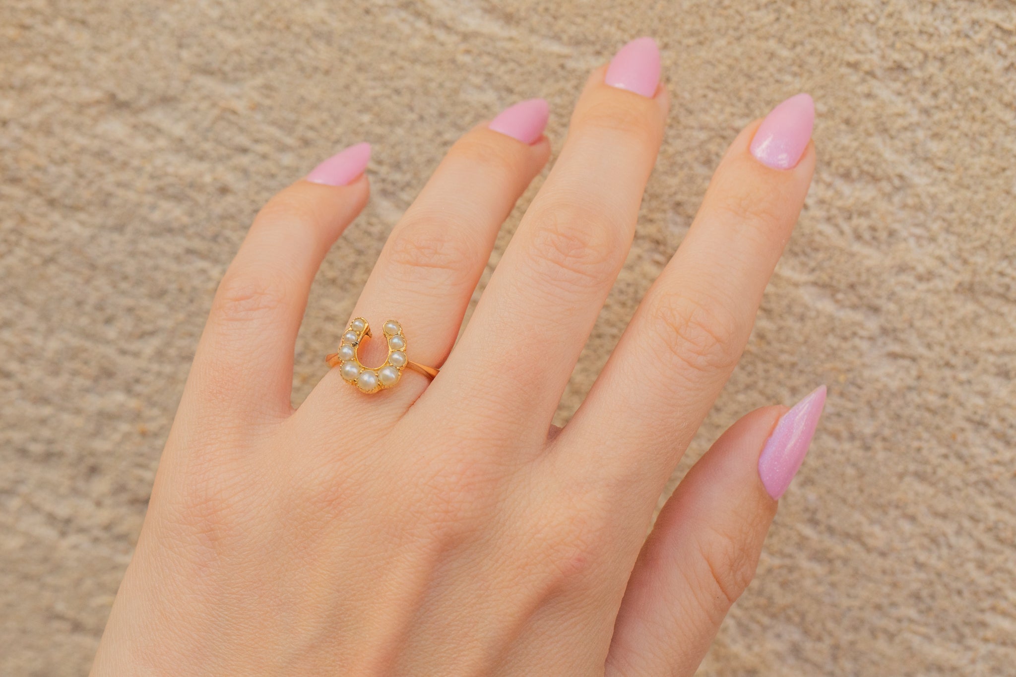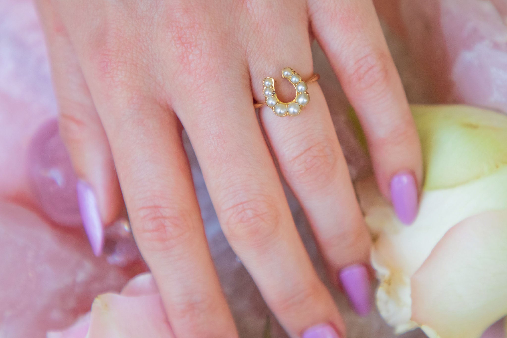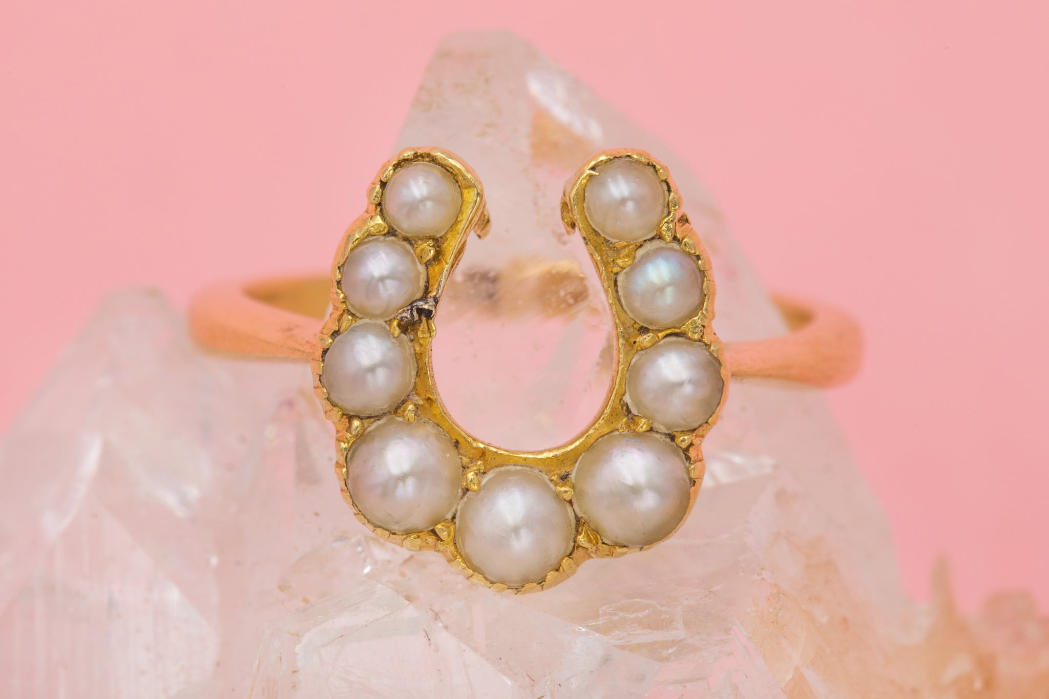 This antique 15ct Gold Pearl horseshoe ring is a thing of true beauty. Embellished with nine creamy ivory Pearls, this sweet antique ring is the bearer of good luck you're missing in your life!