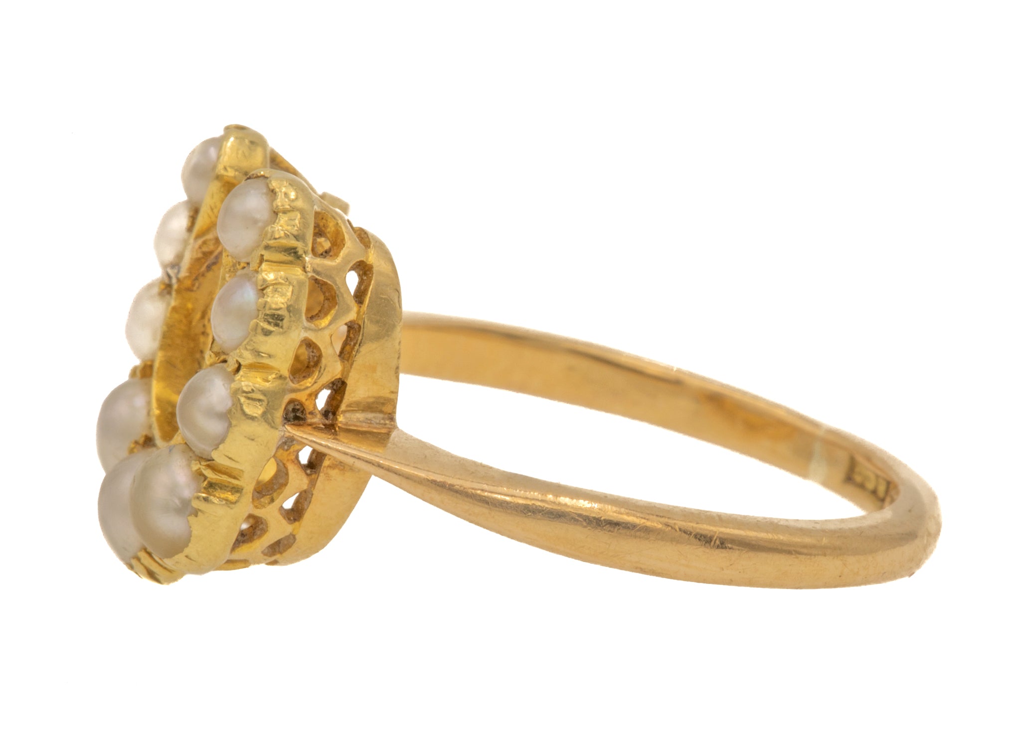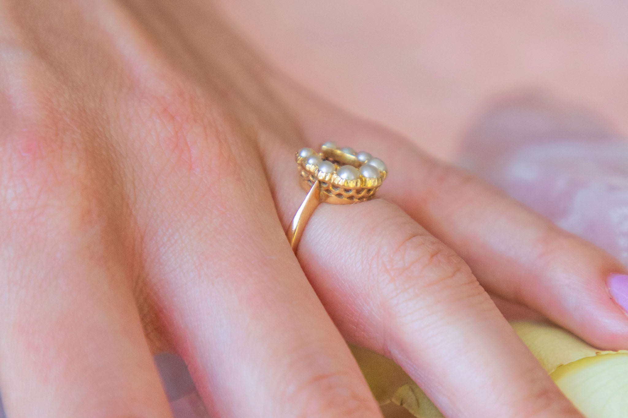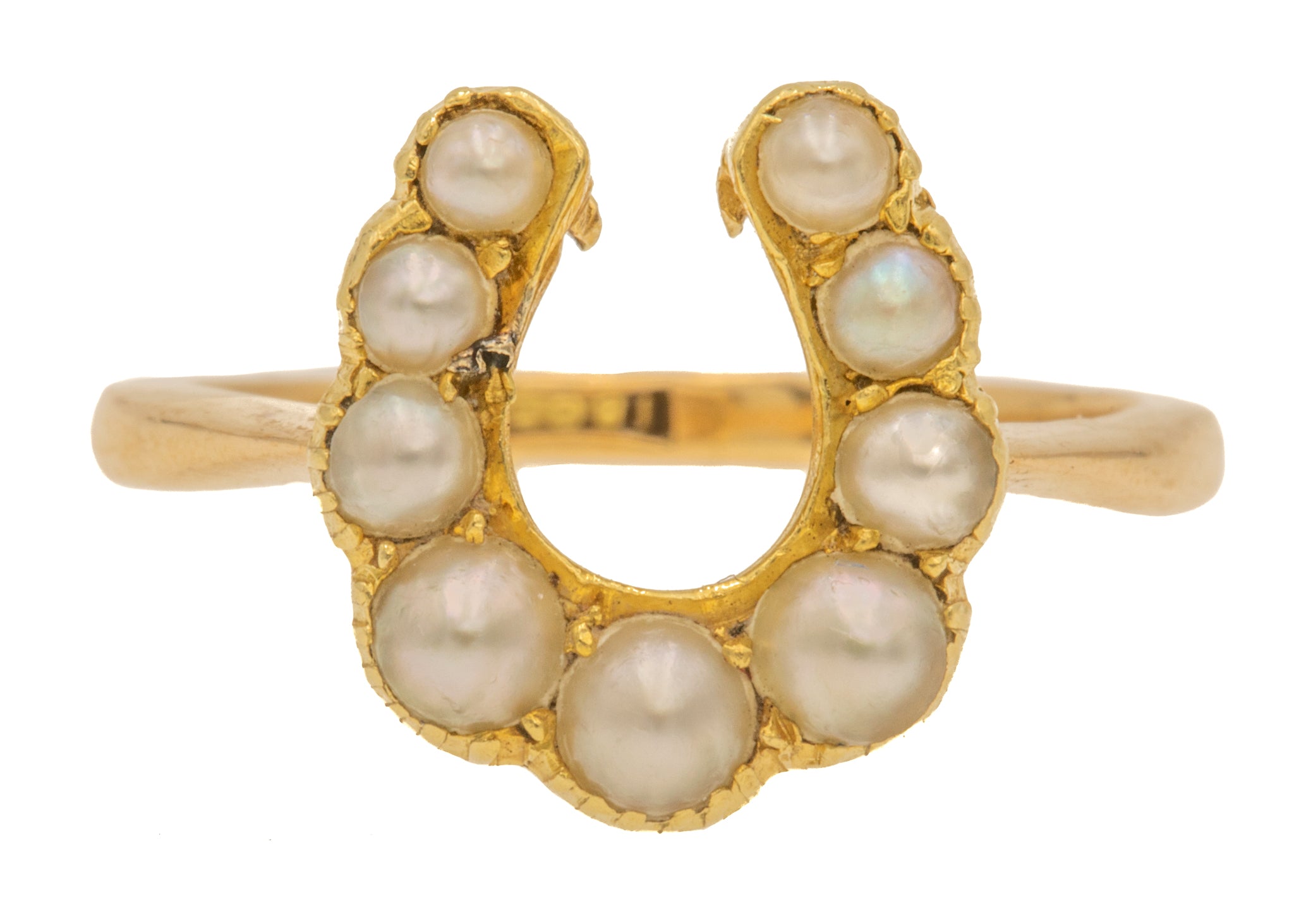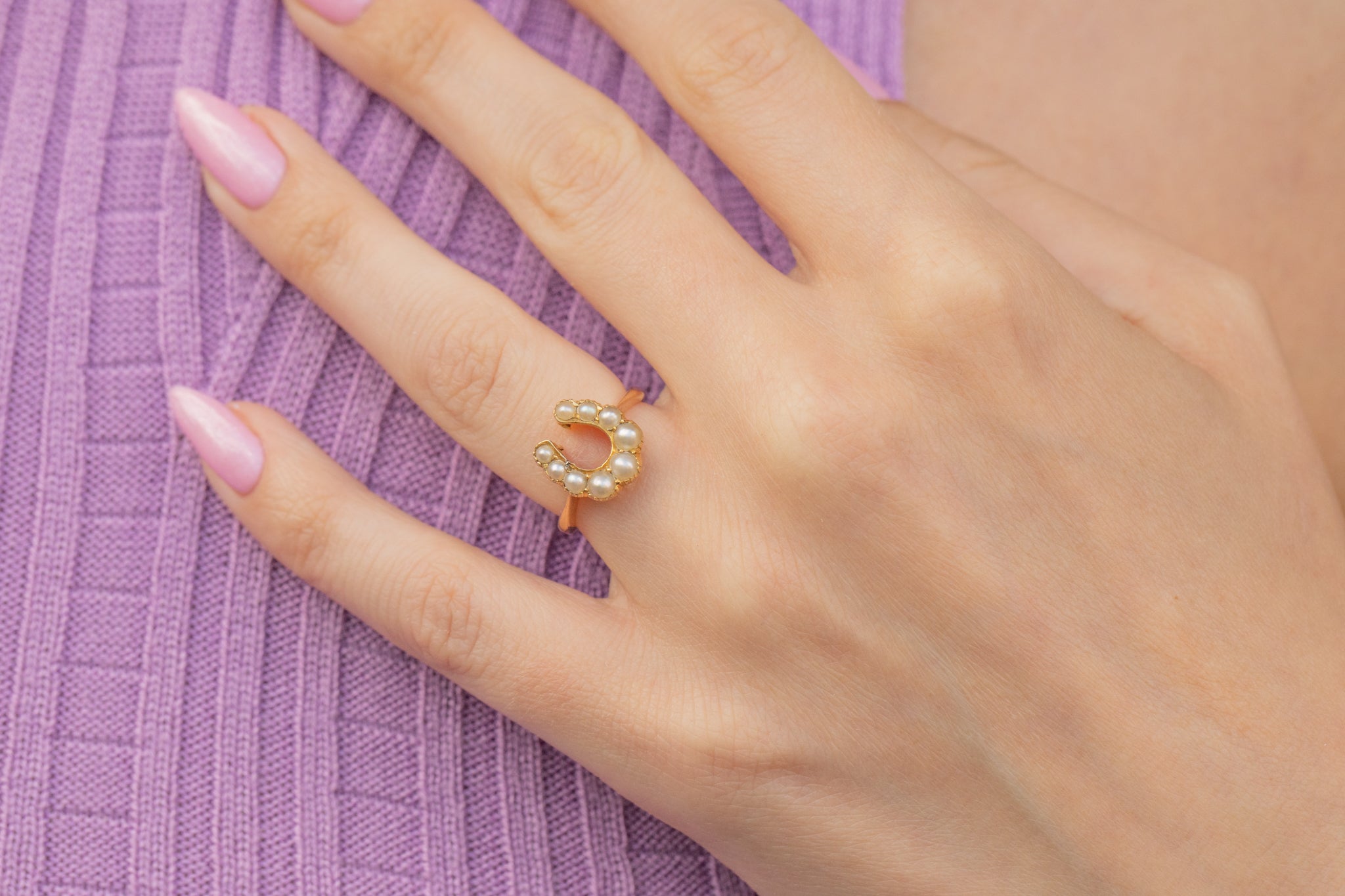 This antique 15ct Gold Pearl horseshoe ring is a thing of true beauty. Embellished with nine creamy ivory Pearls, this sweet antique ring is the bearer of good luck you're missing in your life!