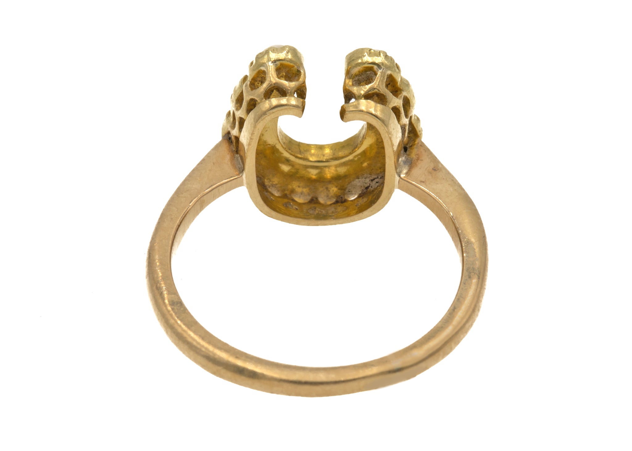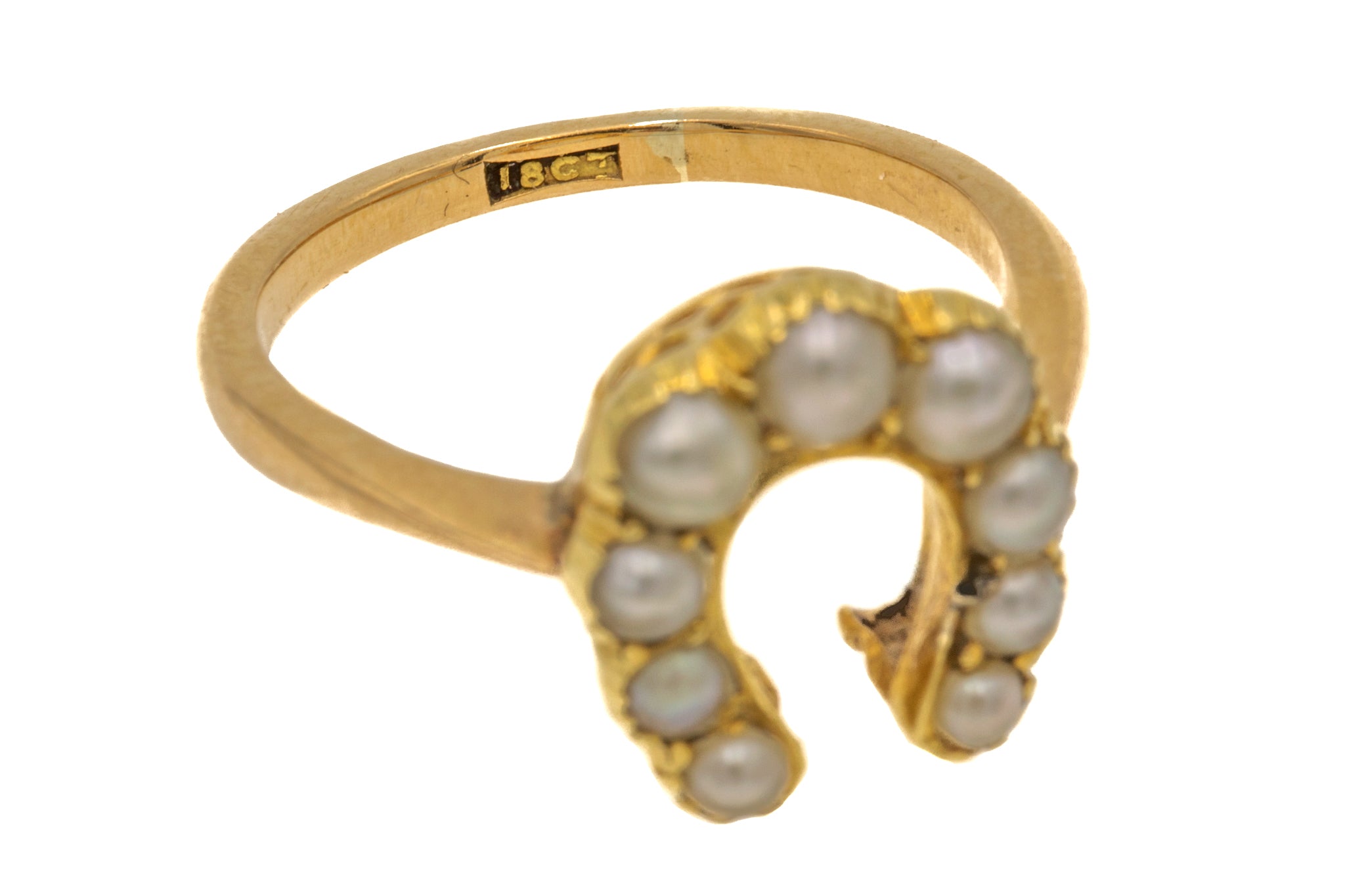 VERY GOOD. This antique 15ct Gold Pearl horseshoe ring is in very good condition. Each Pearl is secure and snug in its settings, each free from damage and retaining a lustrous sheen. There is some light wear to the settings, commensurate with age, but this is very subtle. Overall, a beautiful good luck charm to gift or keep all to yourself!