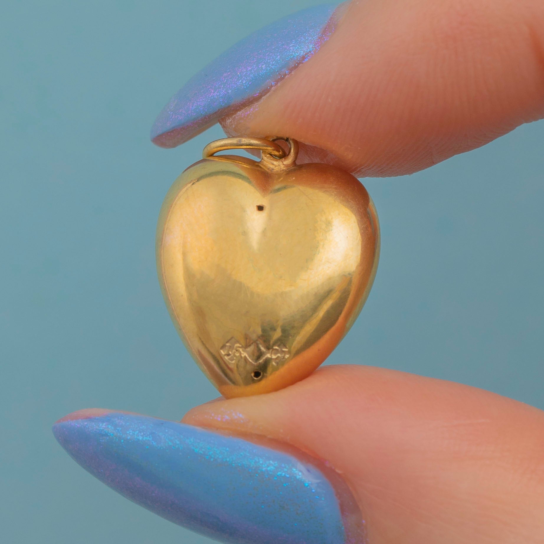 EXCELLENT. This antique 15ct Gold Pearl puffy heart pendant is in great condition. Her Gold is lustrous and buttery, with very minor signs of wear which are only visible under a loupe. With a secure jump ring, you can wear her with the utmost confidence.