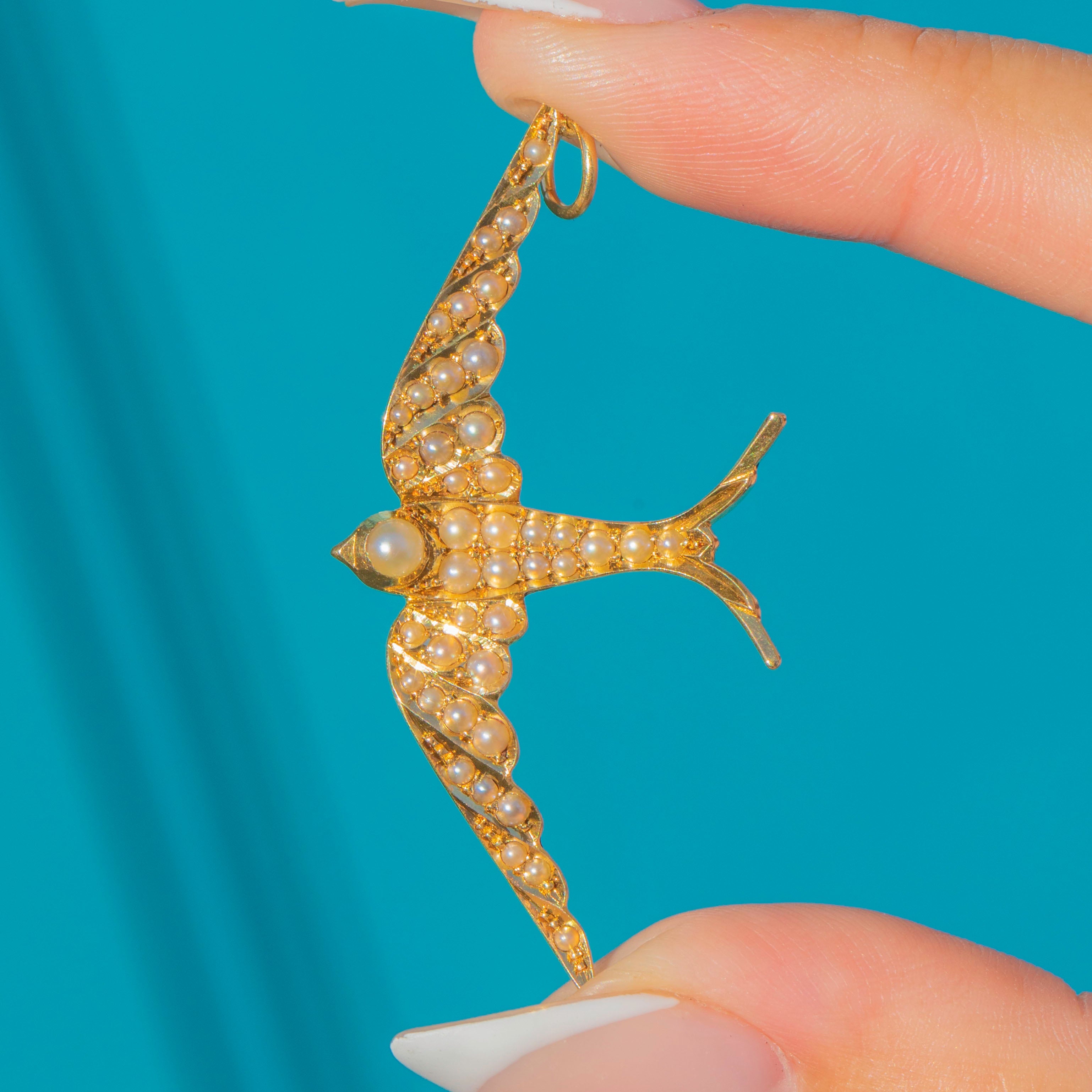 This magnificent Victorian Swallow pendant is crafted in rich 15ct Gold and set with luminous natural Pearls. The swallow, a beloved Victorian motif symbolising love, loyalty, and safe return, is beautifully rendered in a dynamic, sweeping pose that seems to capture the bird mid-flight.