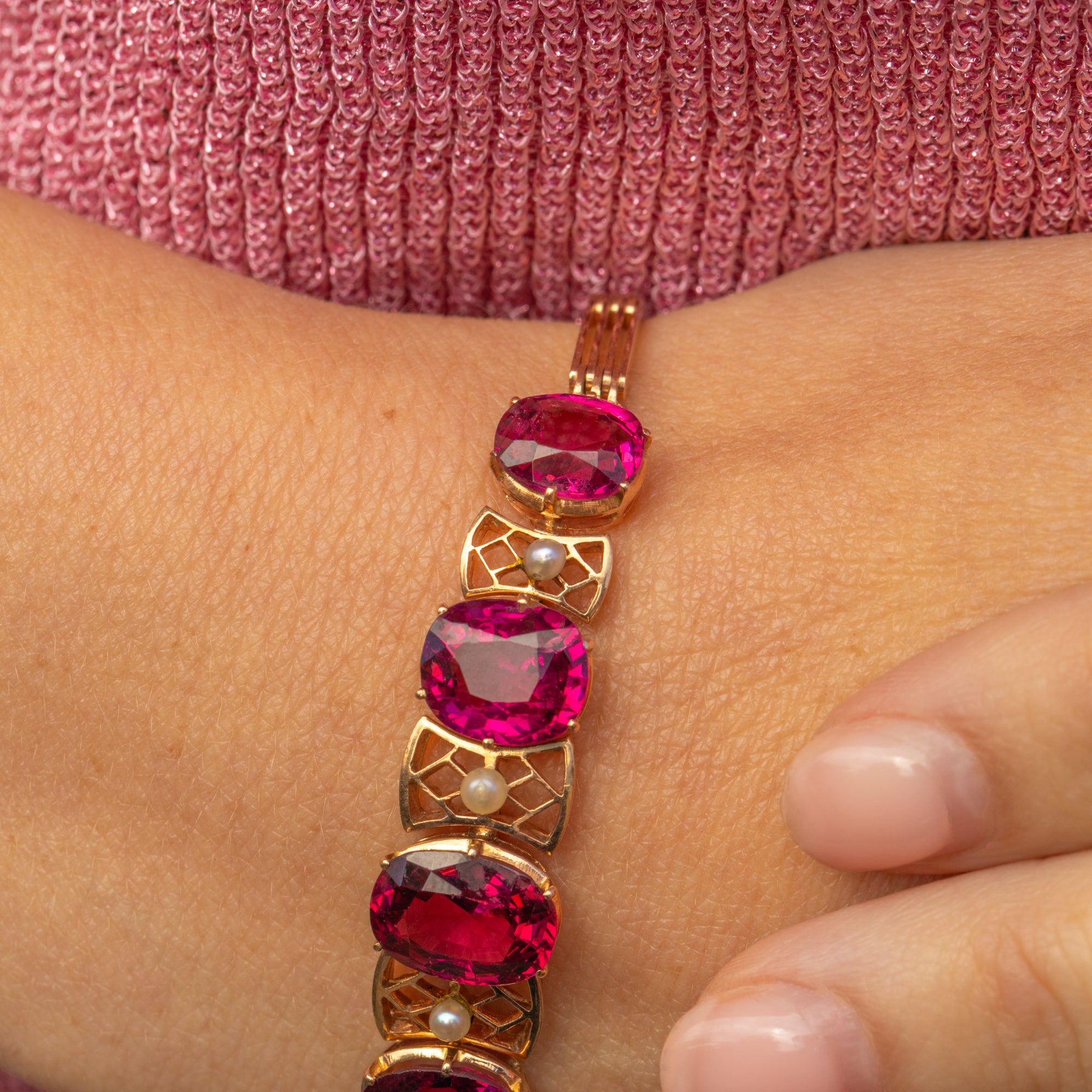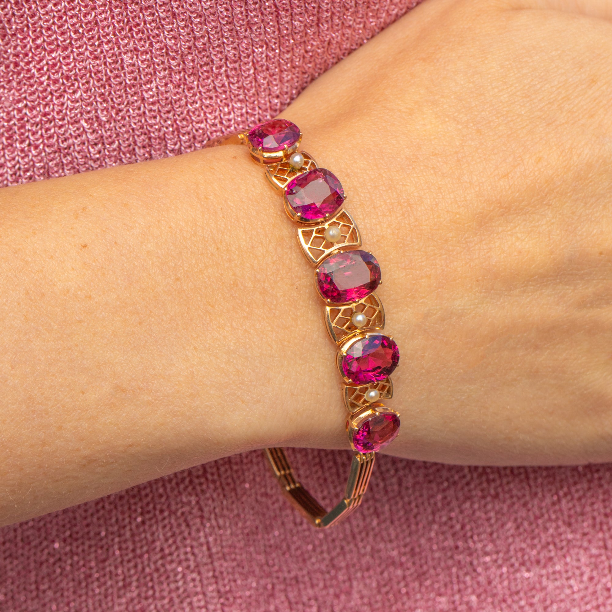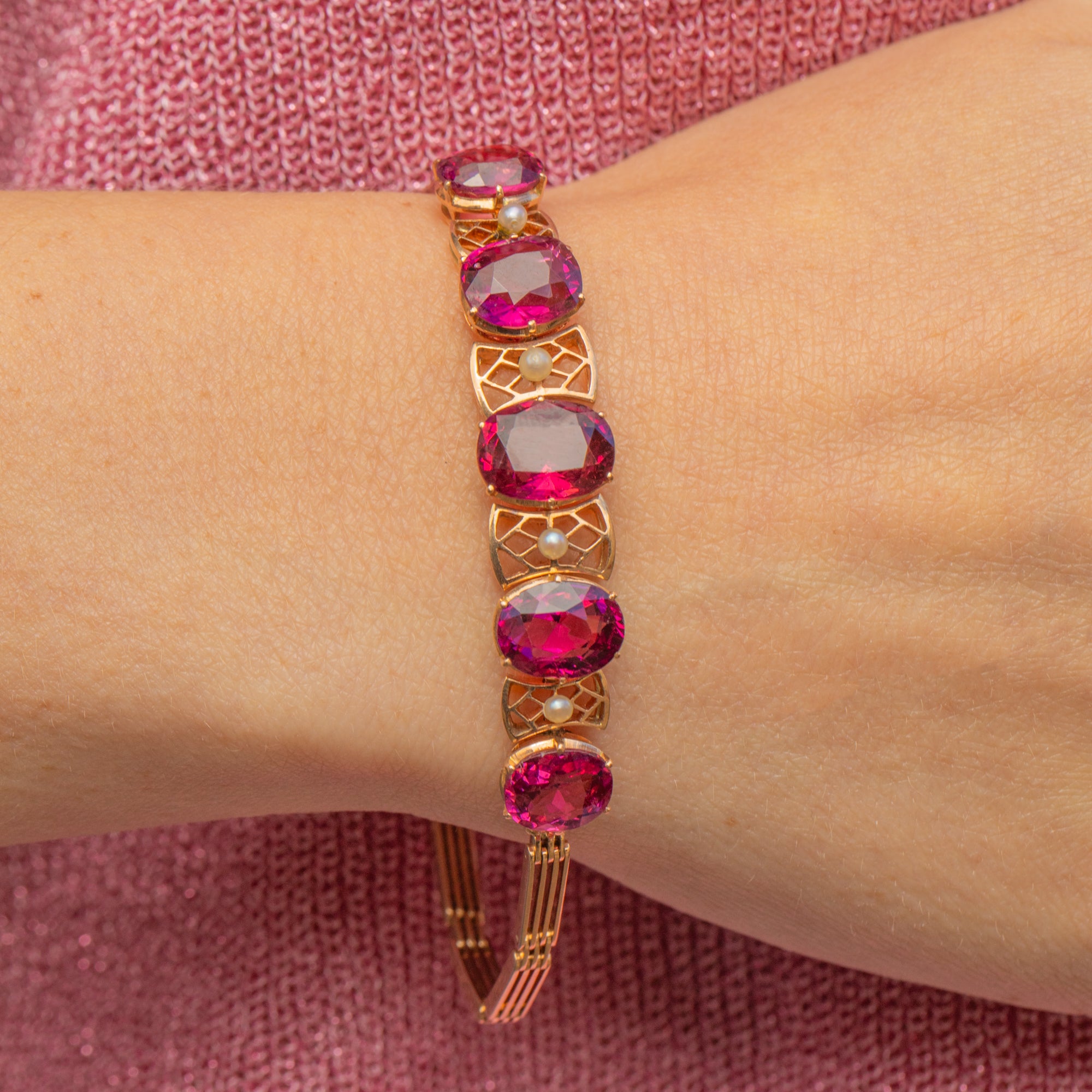 Discover the epitome of luxury with this antique 15ct Gold pink Tourmaline Pearl bracelet! Adorning her front are five exquisite graduating Tourmaline flaunting vibrant magenta hues, with a combined carat weight of 8.00ct and accompanied by lustrous Pearls set amongst geometric Gold work links.