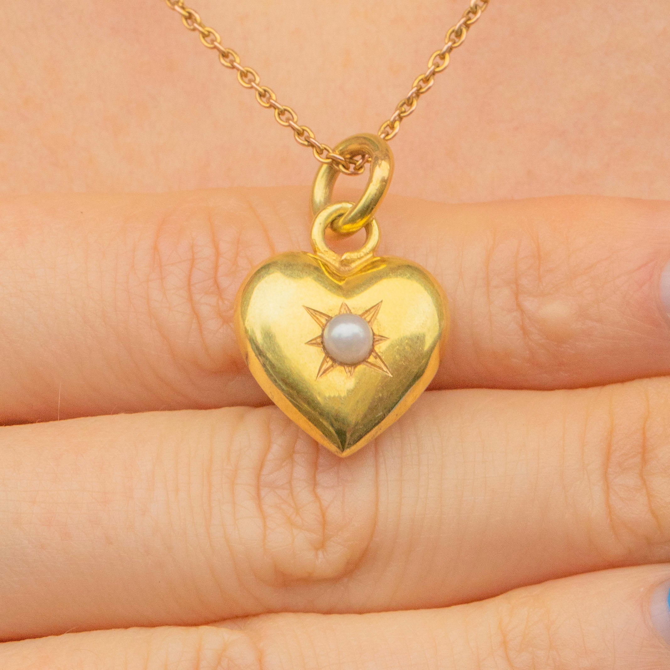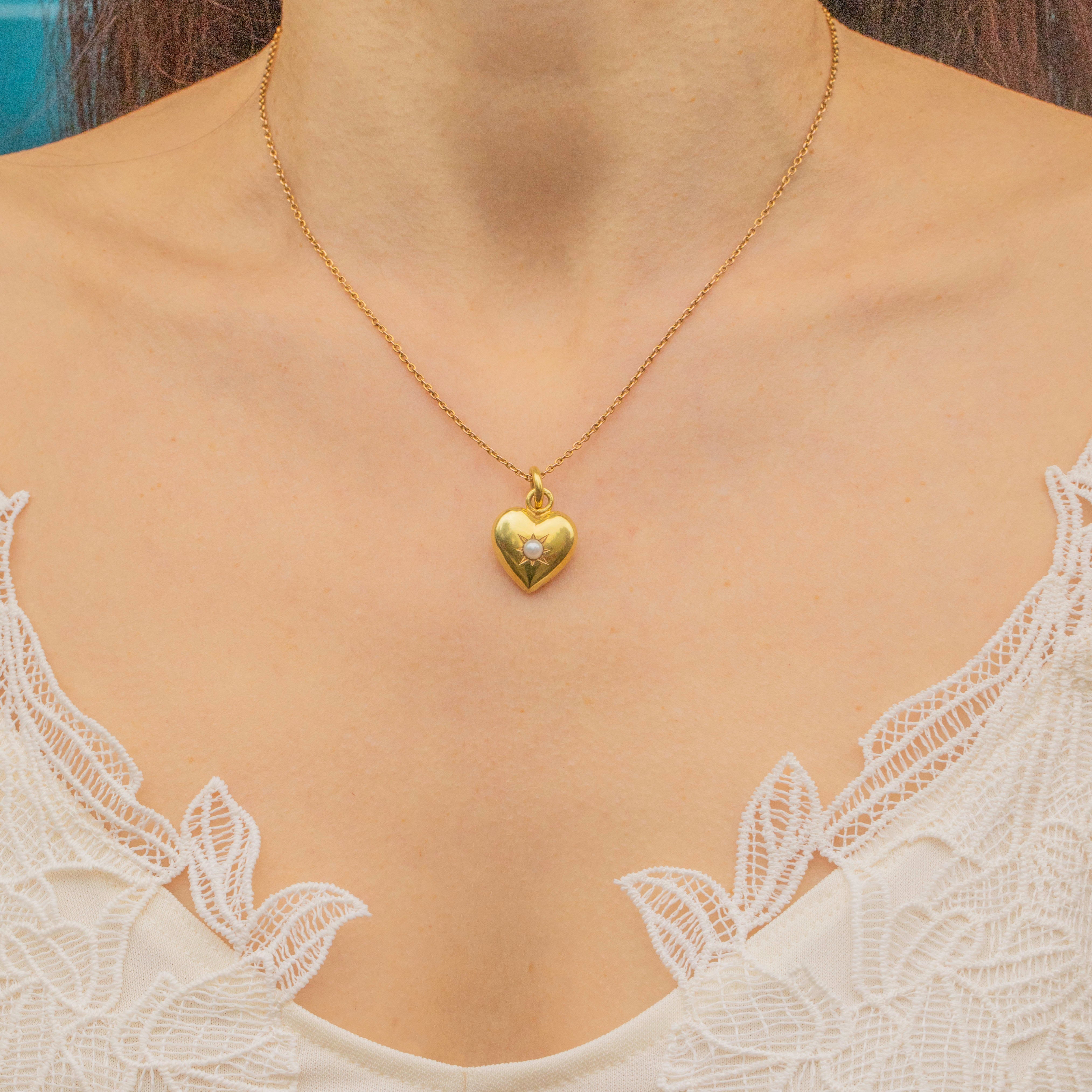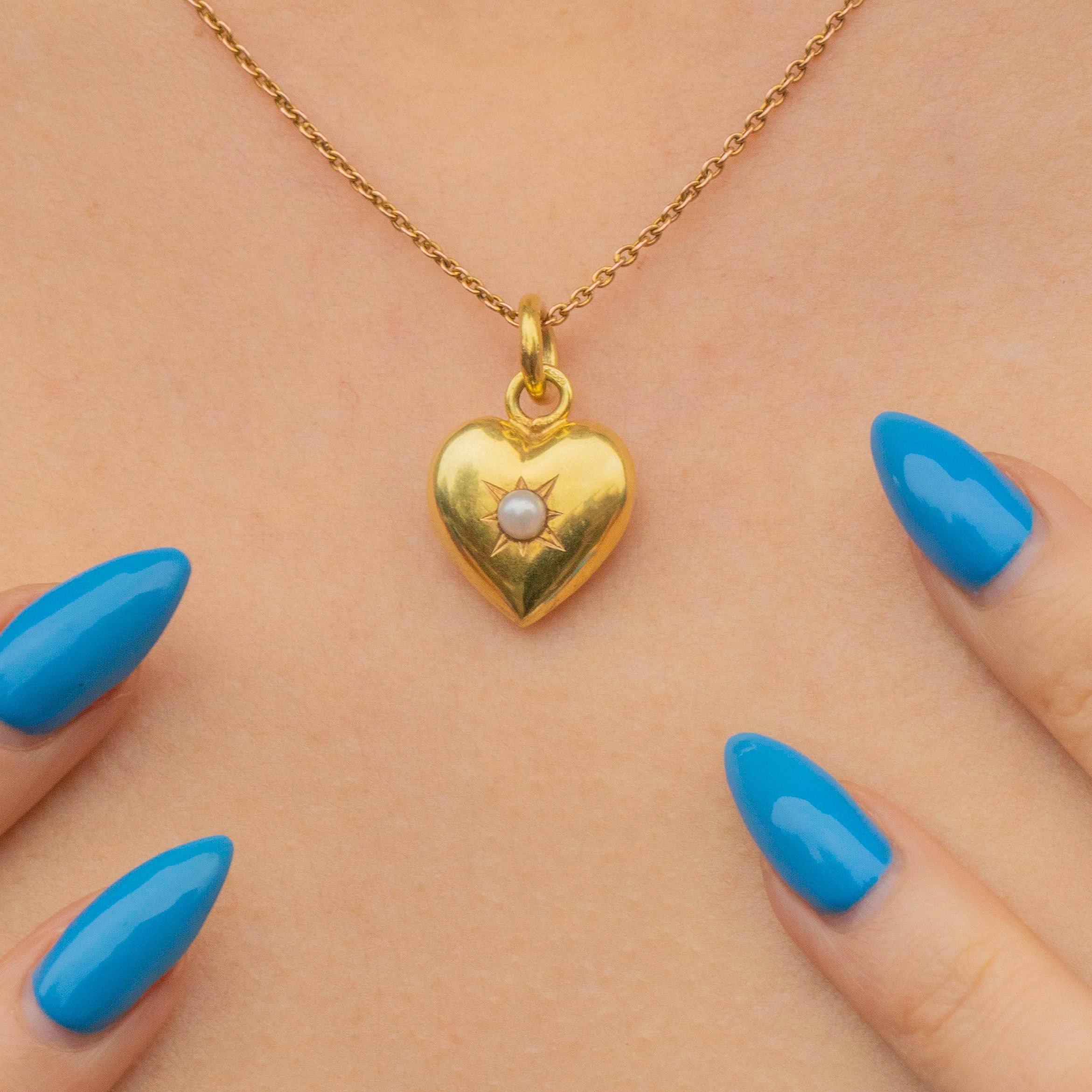 EXCELLENT: This antique 15ct Gold puffy Pearl heart pendant is in wonderful condition. Her Gold is lustrous and radiant, and has retained a gorgeous saturation with only very minor signs of wear visible under a jeweller's loupe. Her Pearl is iridescent and held in place securely. With a well-soldered jump ring, she is in superb condition!