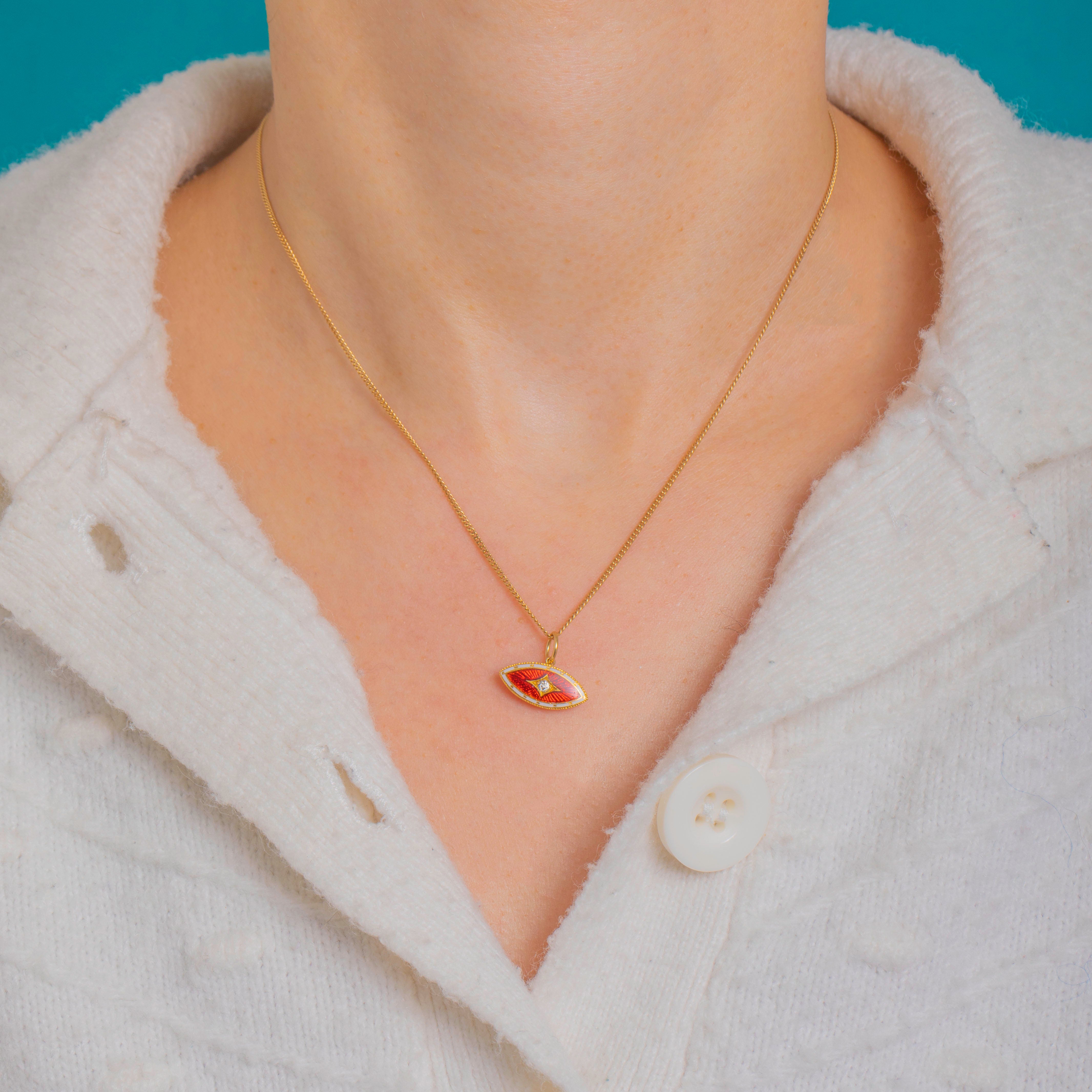A jewel-box treasure in vivid guilloché Enamel, this Edwardian 15ct Gold charm glows with a rich red-orange centre framed by a fine white enamel rim dotted with tiny Gold accents. The marquise silhouette is finished with delicate milgrain, while a raised lozenge collet draws the eye to a crisp, sparkling Diamond at the heart.