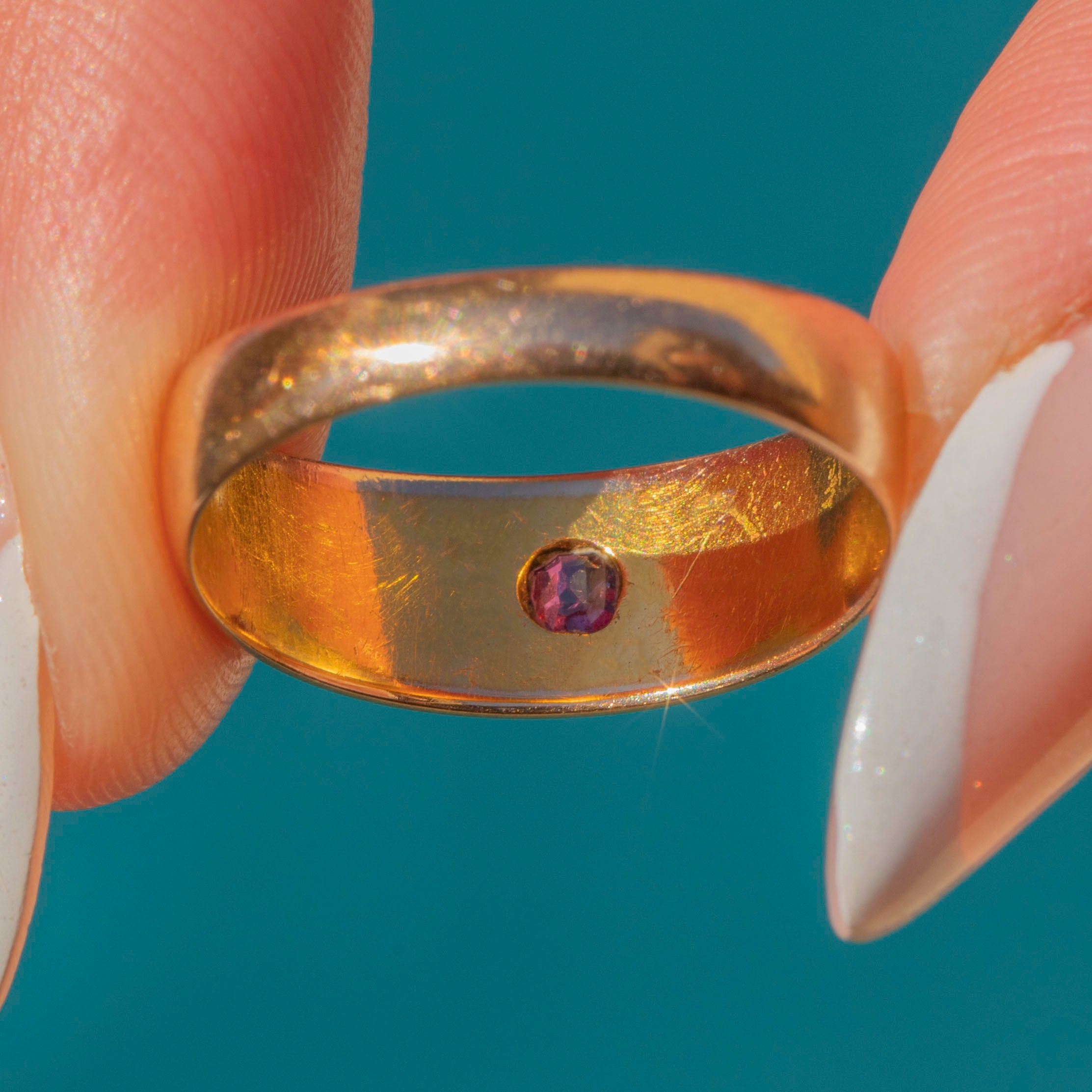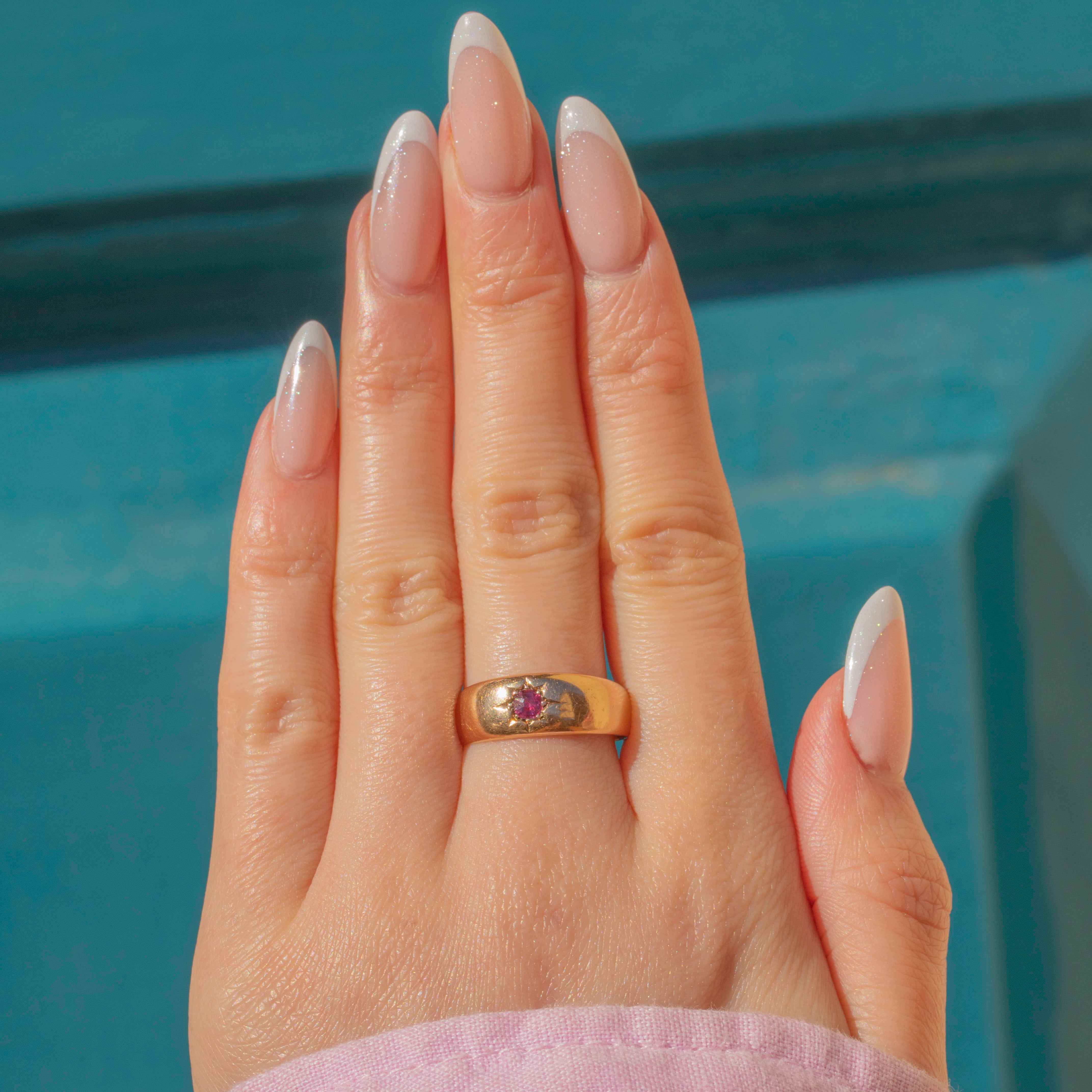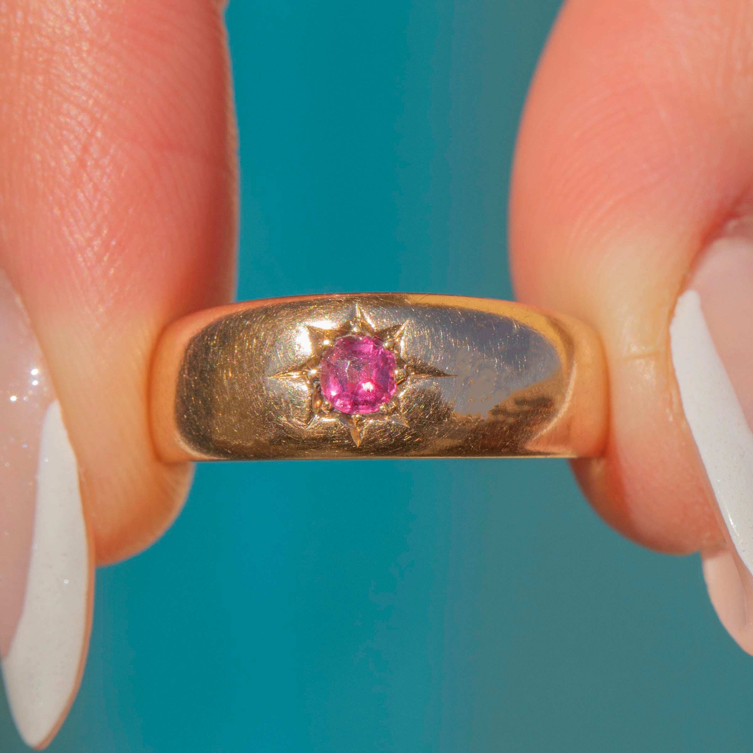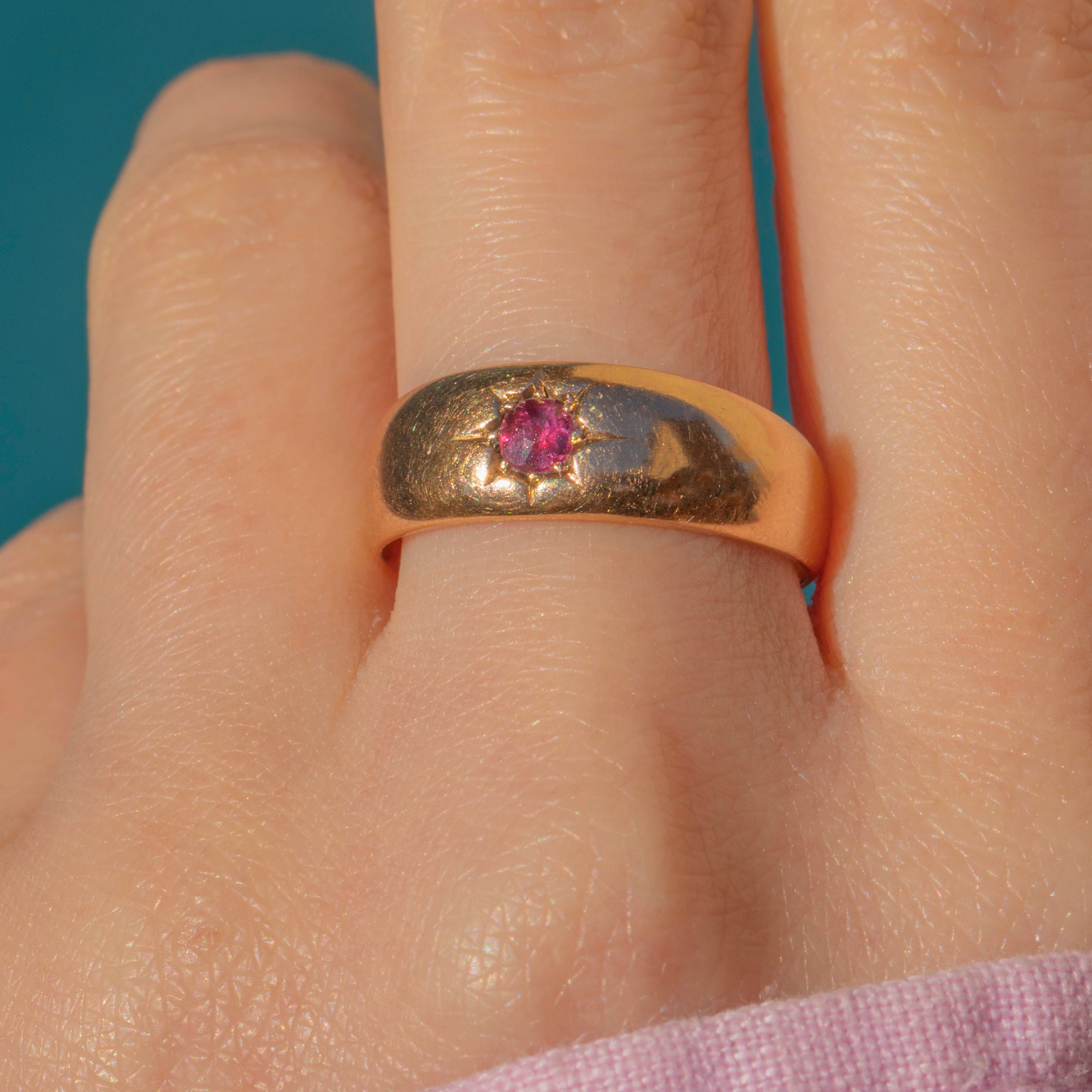Elegant and refined, the chubby and glossy 15ct Gold band is adorned by a single fuchsia Ruby. Set within a star setting, this Victorian Ruby ring radiates celestial charm and has a lovely twinkle as she catches the light.