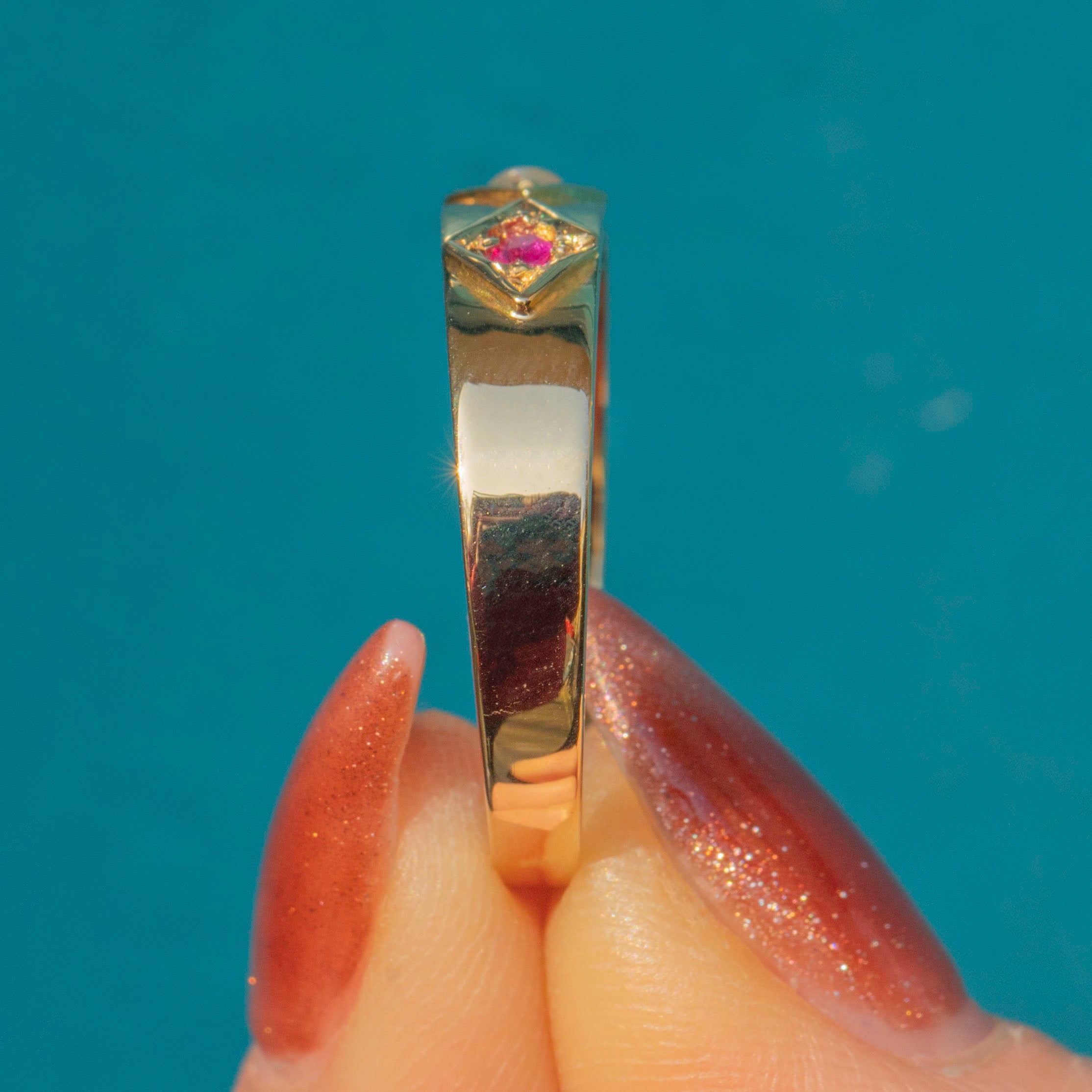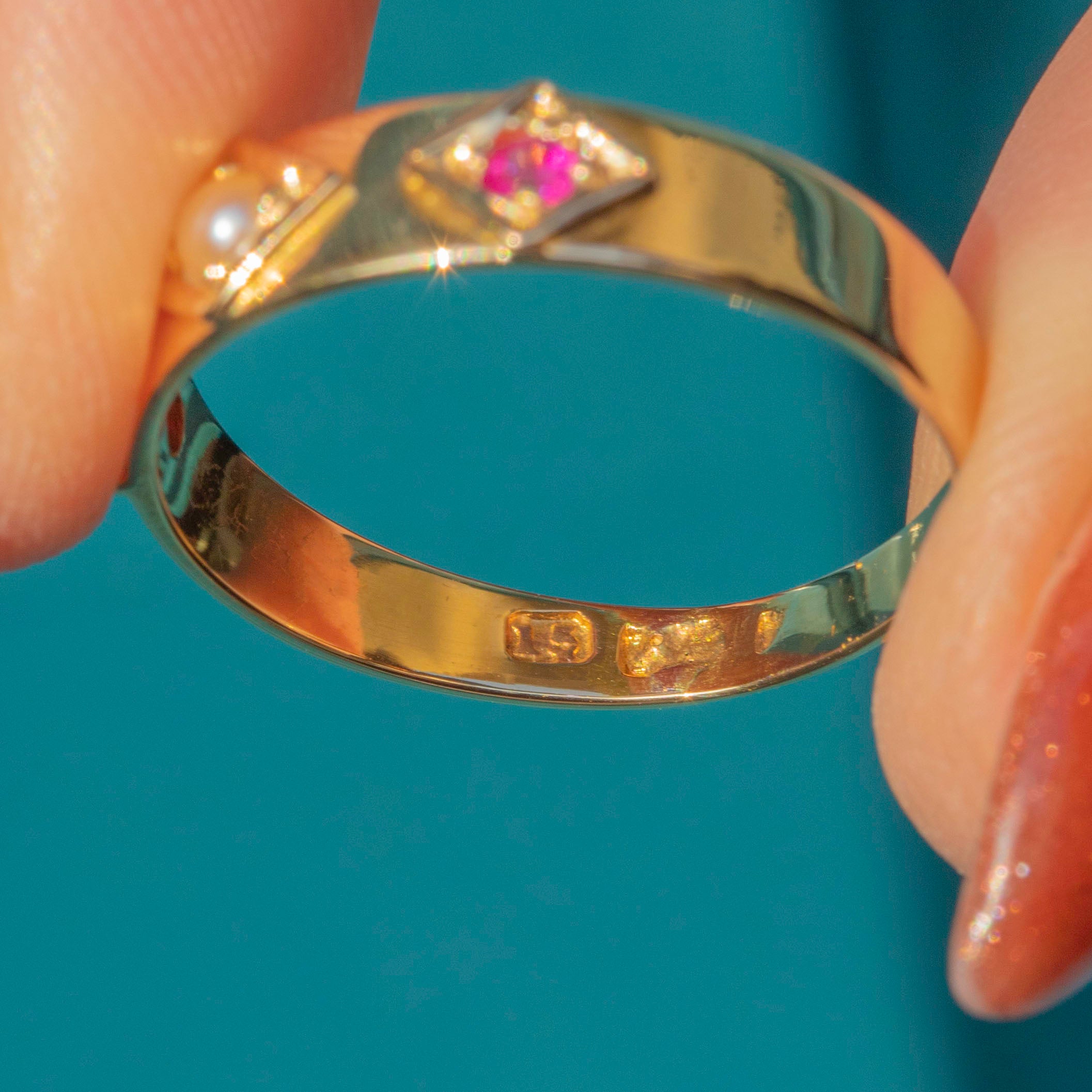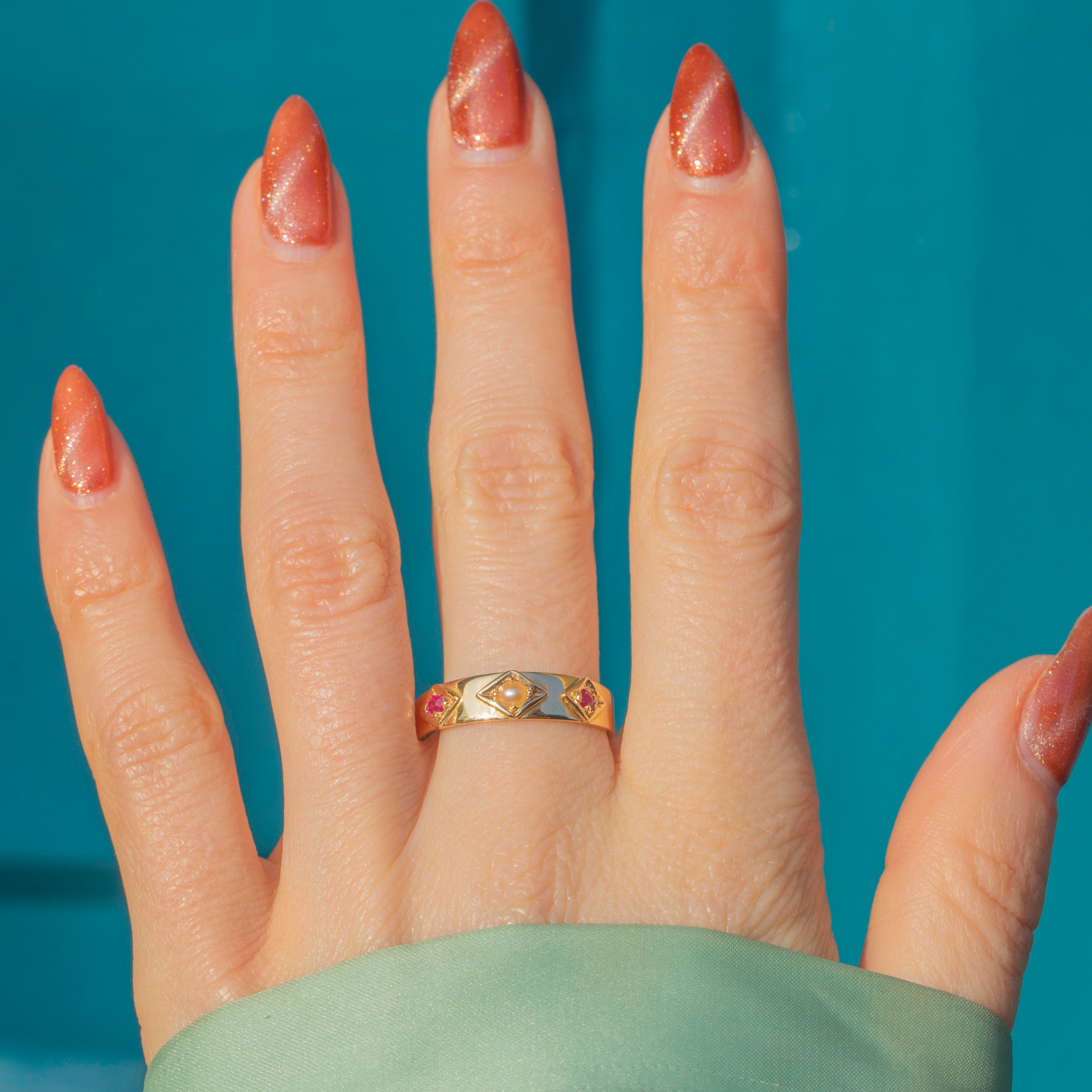 Add Victorian allure to your ring stack with this delightful antique 15ct Gold Ruby Pearl gypsy ring! Her saturated 15ct Gold band displays a gorgeous trio of gemstones, with an iridescent Pearl in the centre, flanked by two juicy pink-red Rubies.