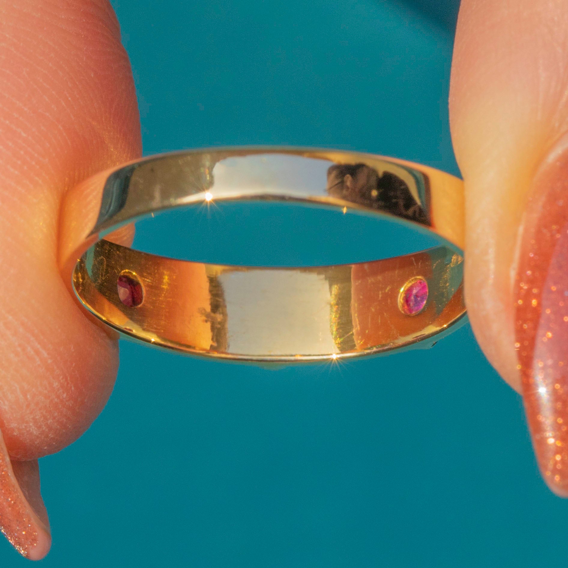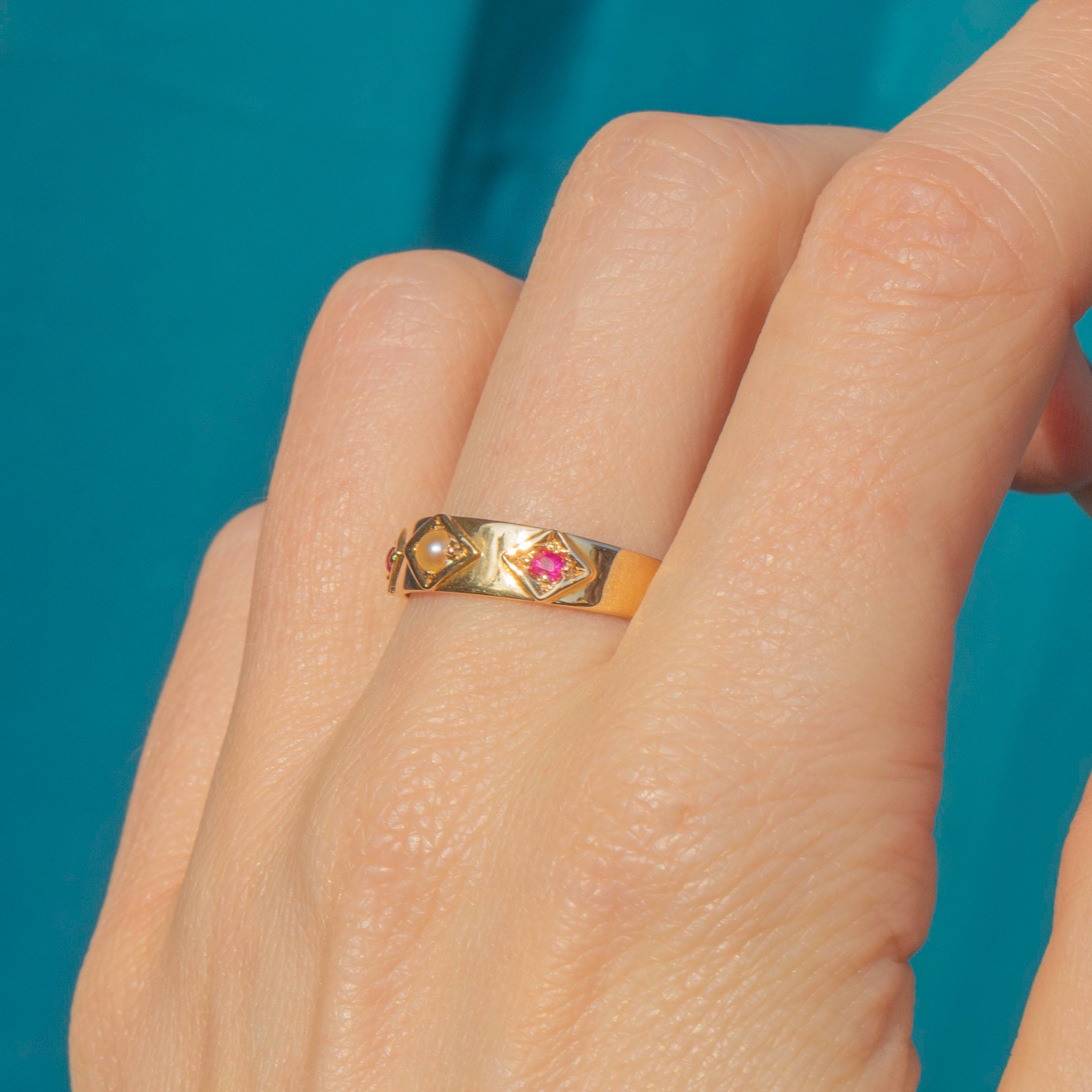 VERY GOOD: This antique 15ct Gold Ruby Pearl gypsy ring is in very good condition. Each of her gemstones is radiant and set securely within its setting. There is evidence of a resize on the back of the ring, though this doesn't affect her wearability and is difficult to spot without a loupe. In great condition, she is a must-have!