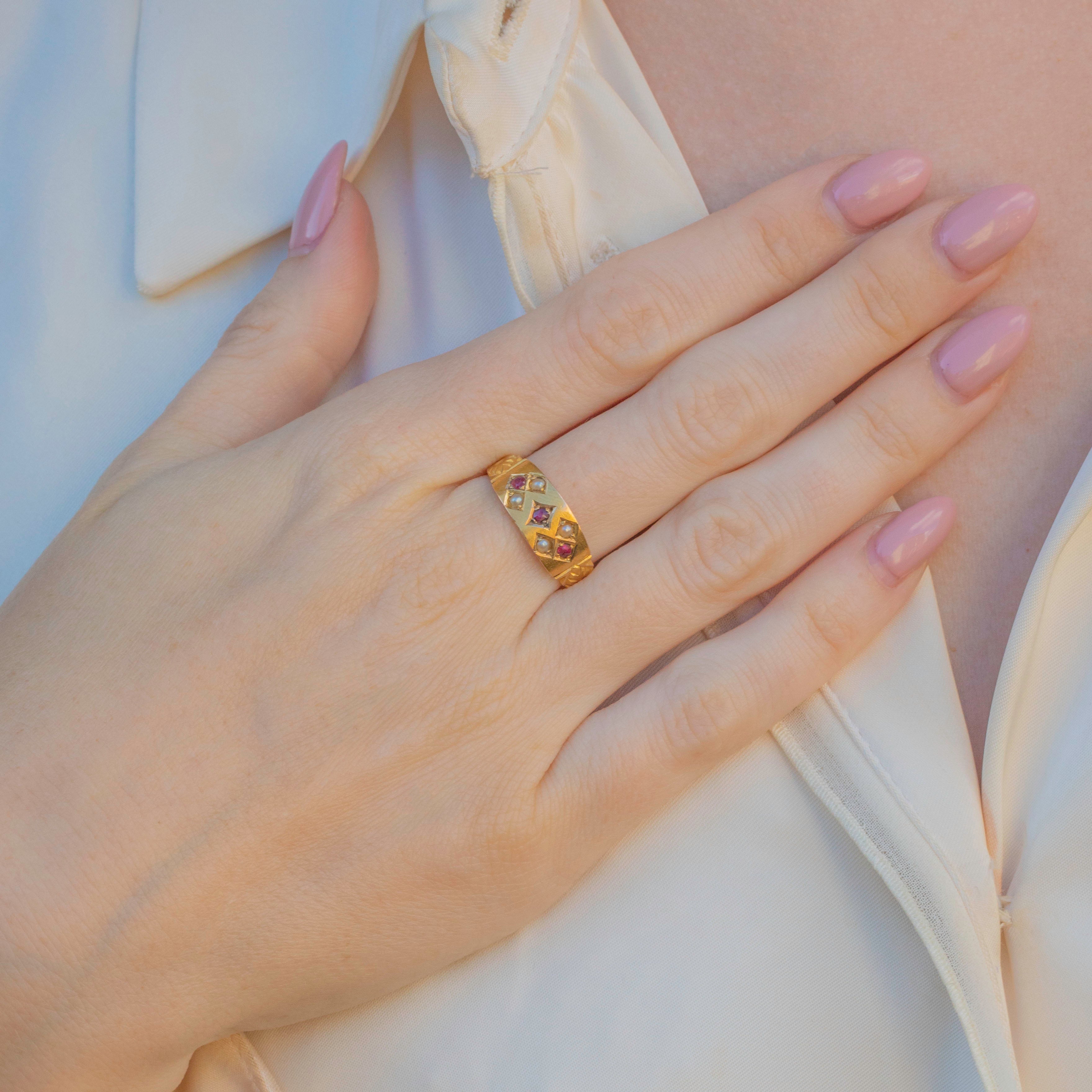Antique 15ct Gold Ruby Pearl Gypsy Ring, c.1891