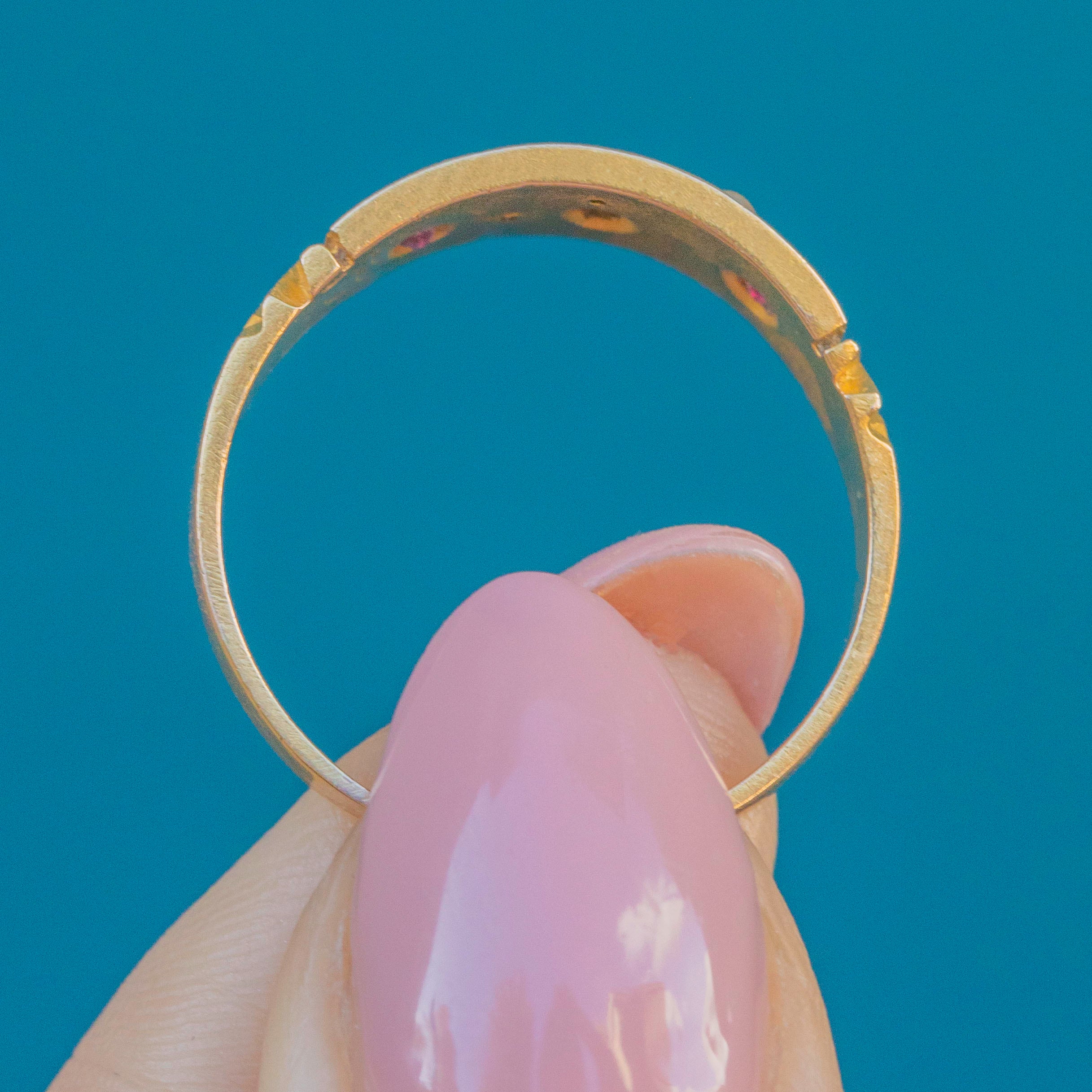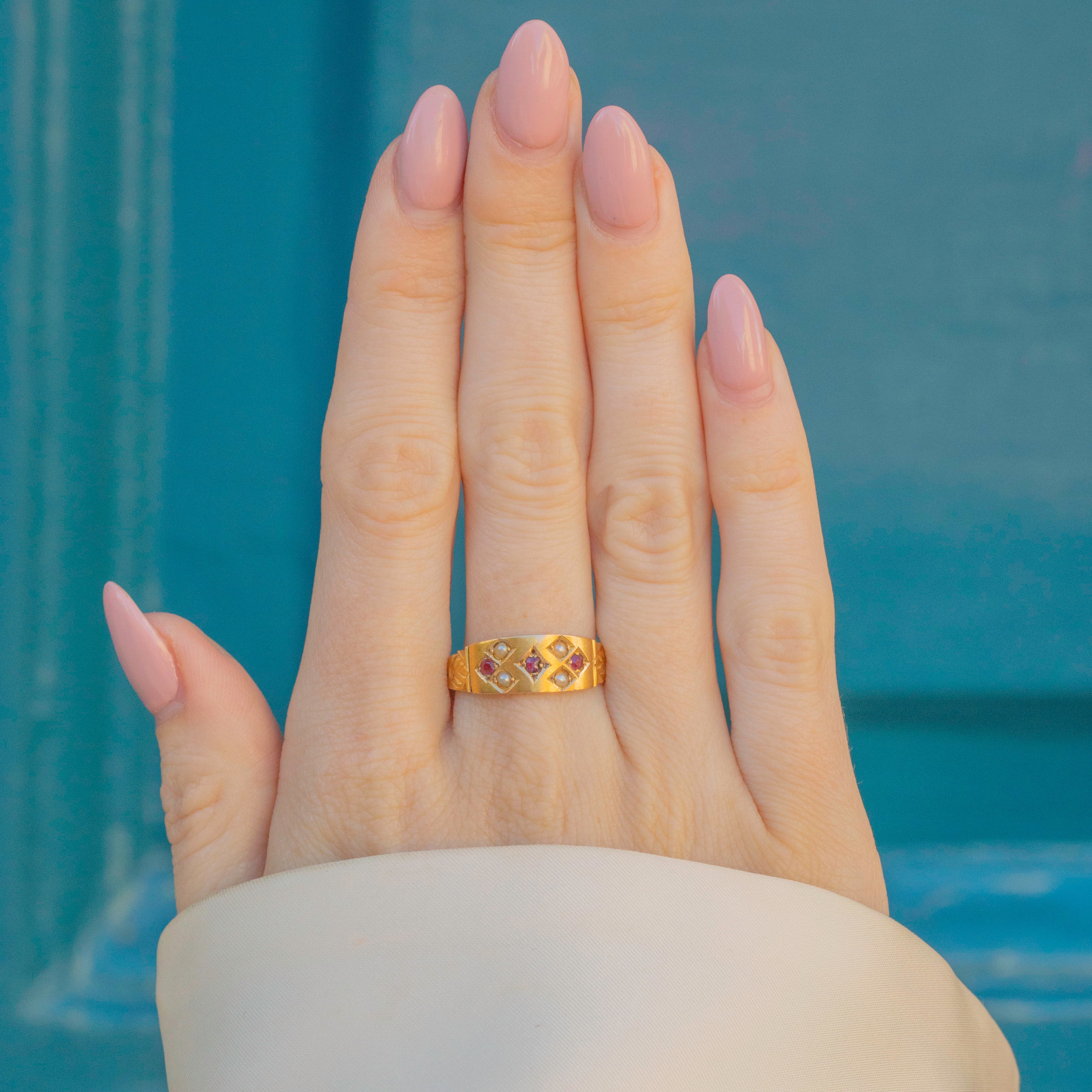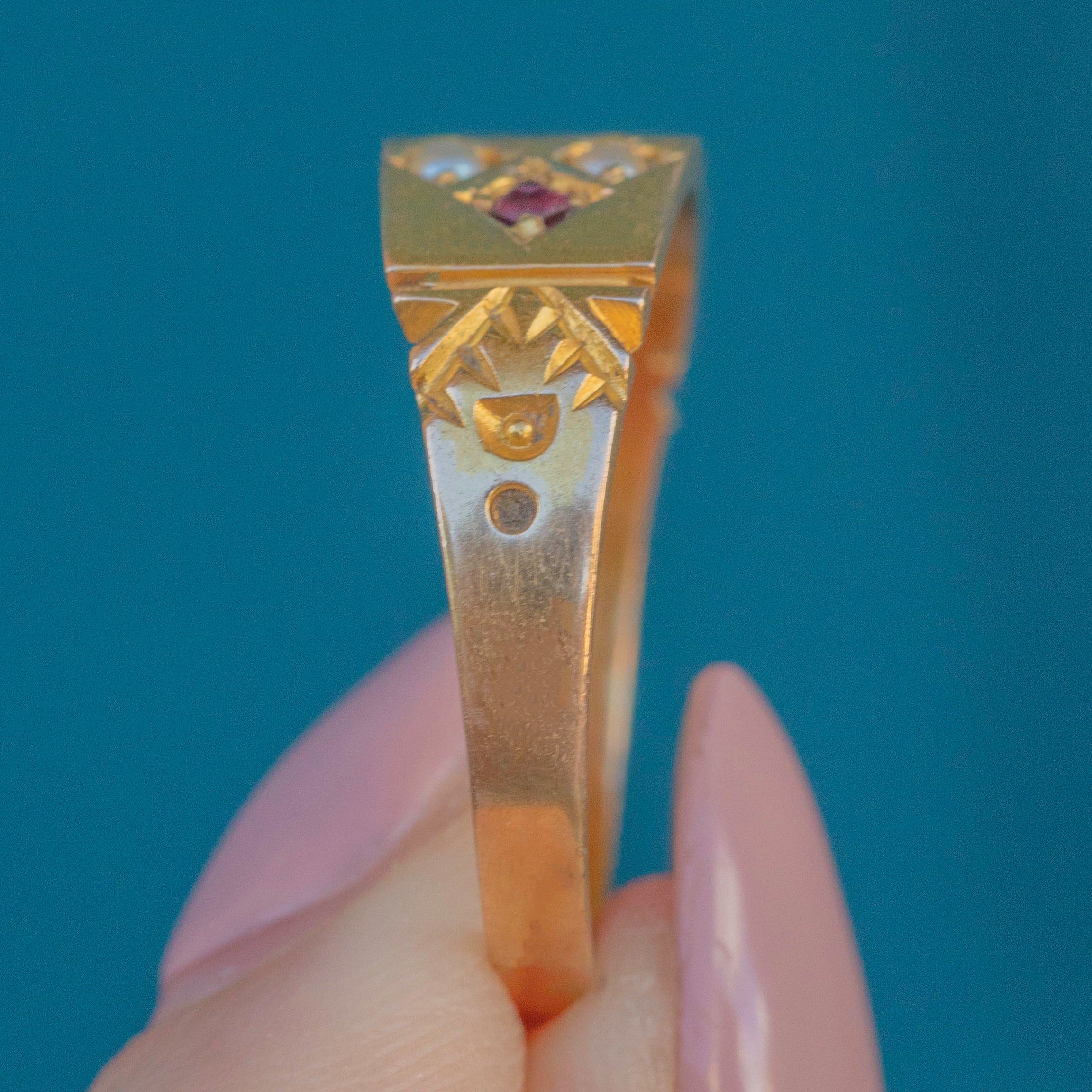 EXCELLENT. This antique 15ct Gold Ruby Pearl gypsy ring is in excellent condition. The gemstones are all original and free from chips or cracks. The Gold is bright with wonderful reflective qualities and no scratches. Only the very lightest level of surface wear, commensurate with age. The depth of the hallmarks indicates that this ring has been cared for very well over the last 150 years!