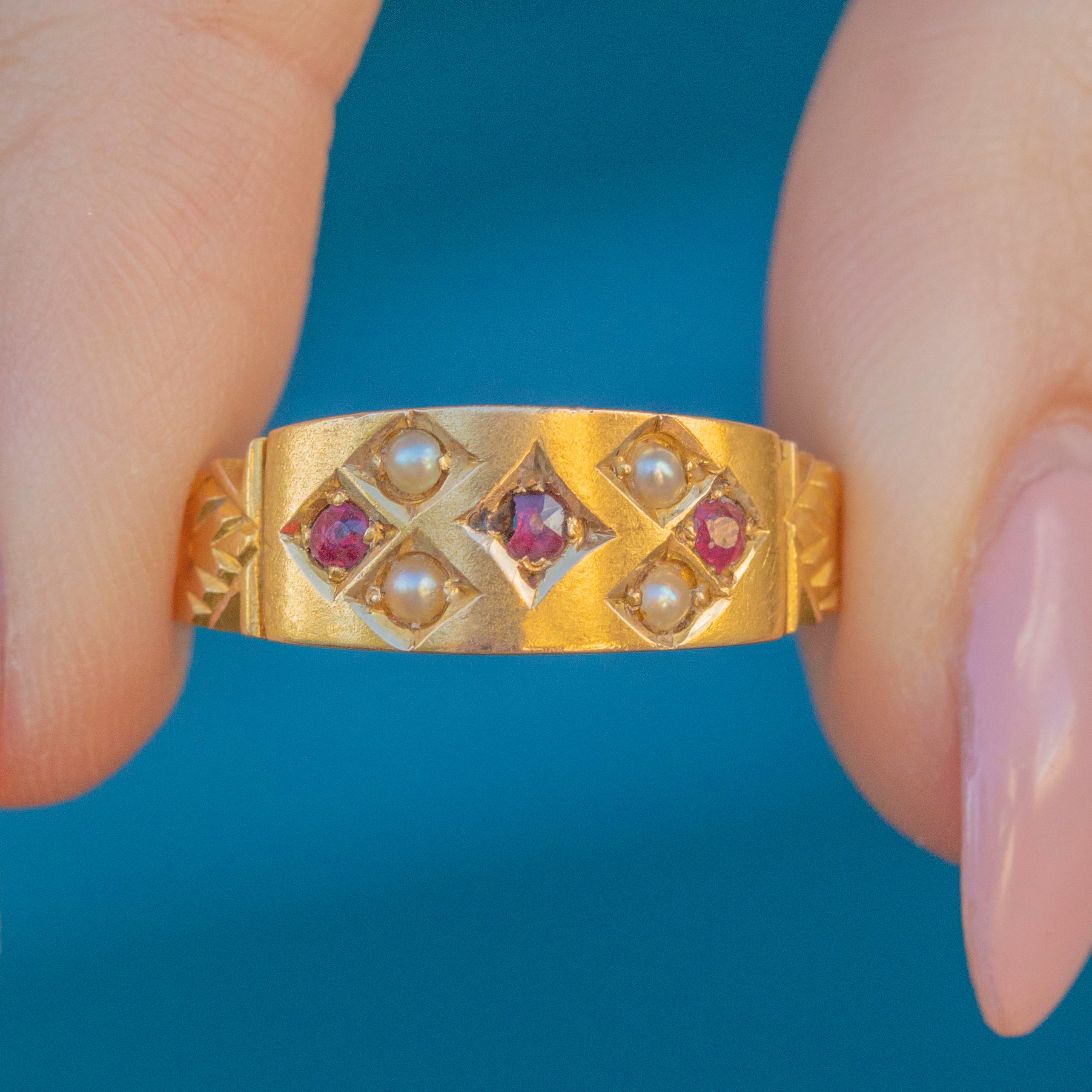 A classic antique 15ct Gold Ruby Pearl gypsy ring offered in wonderful condition, with a full complement of chunky antique hallmarks easily legible to the naked eye!
