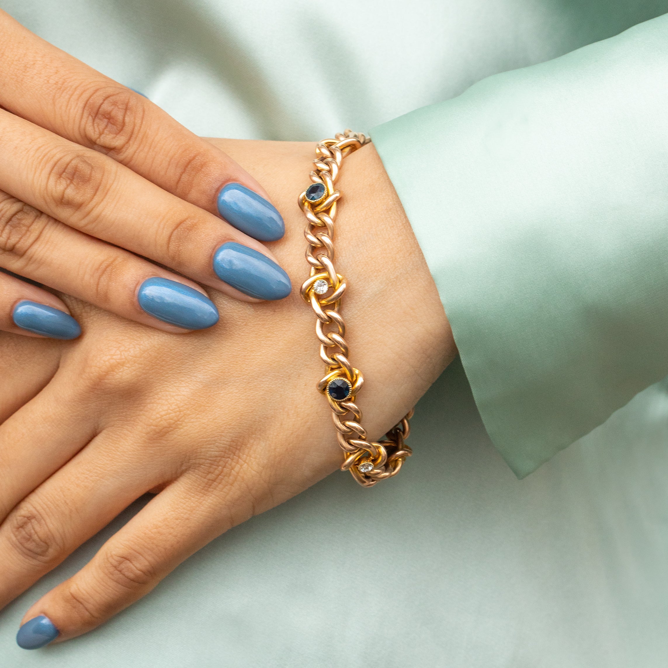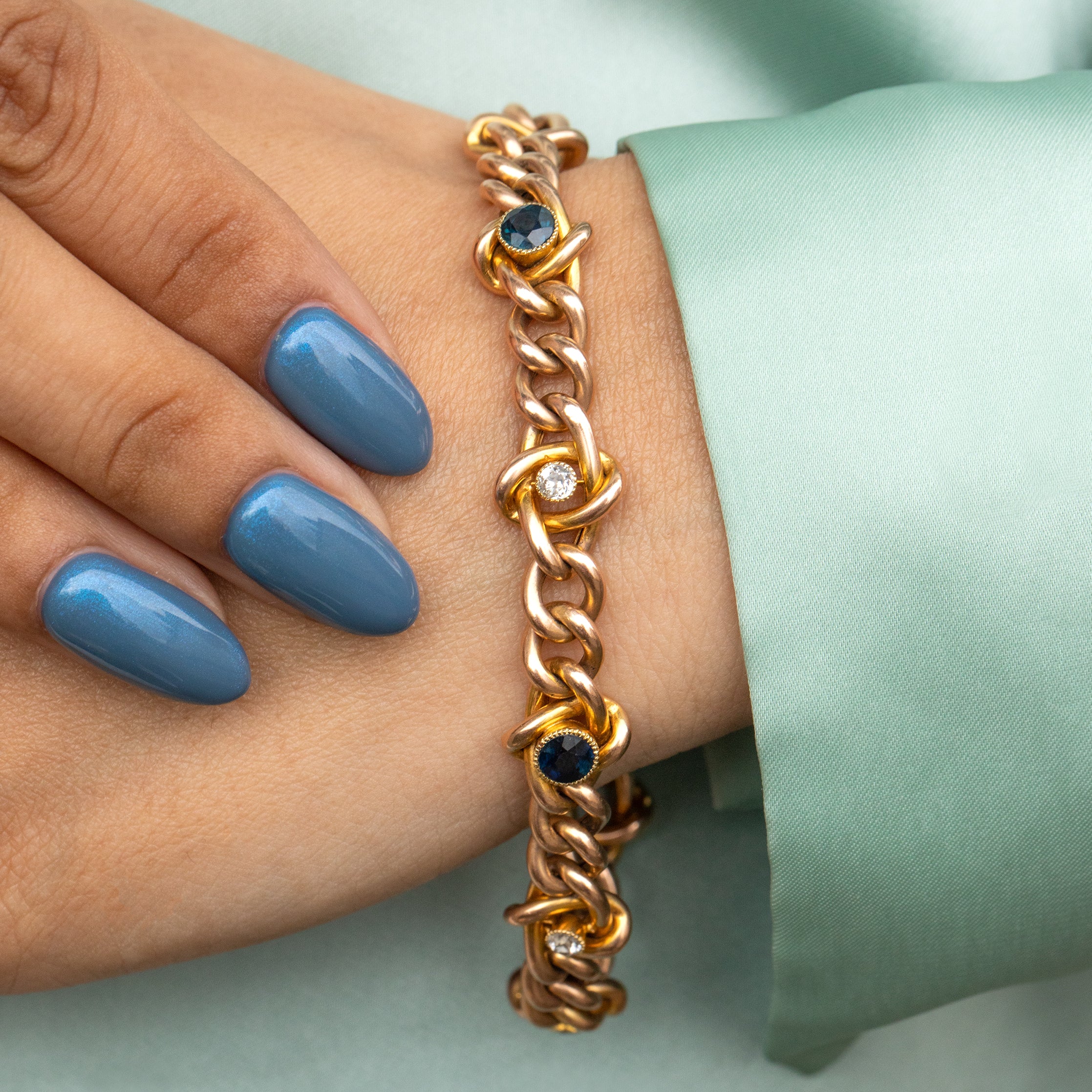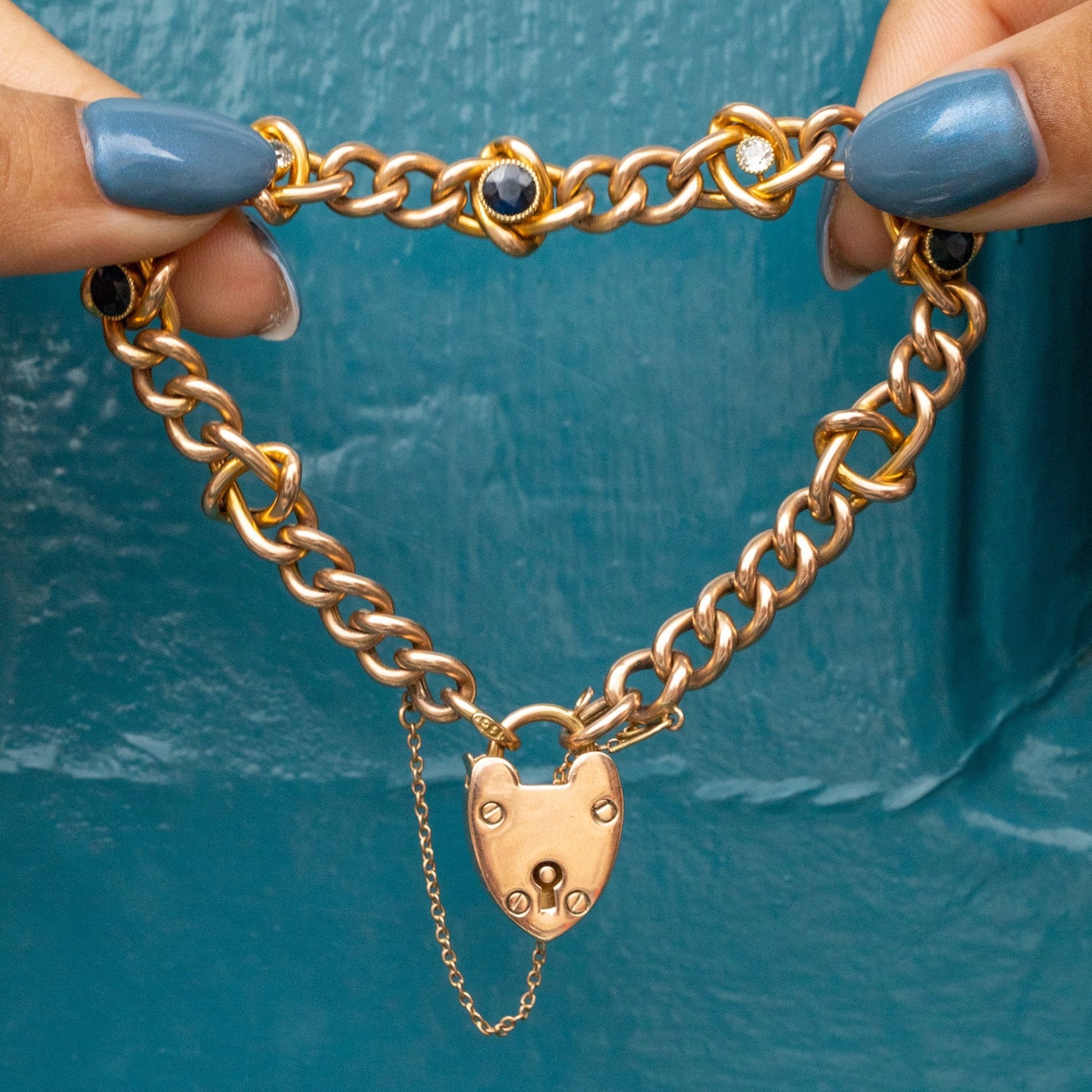 Complete with a romantic heart padlock, this Victorian Gold bracelet boasts chunky curb links dotted with Sapphires and Diamonds making this a truly exceptional design! Steeped in romantic symbolism, this bracelet will be a sensational addition to your jewellery box!