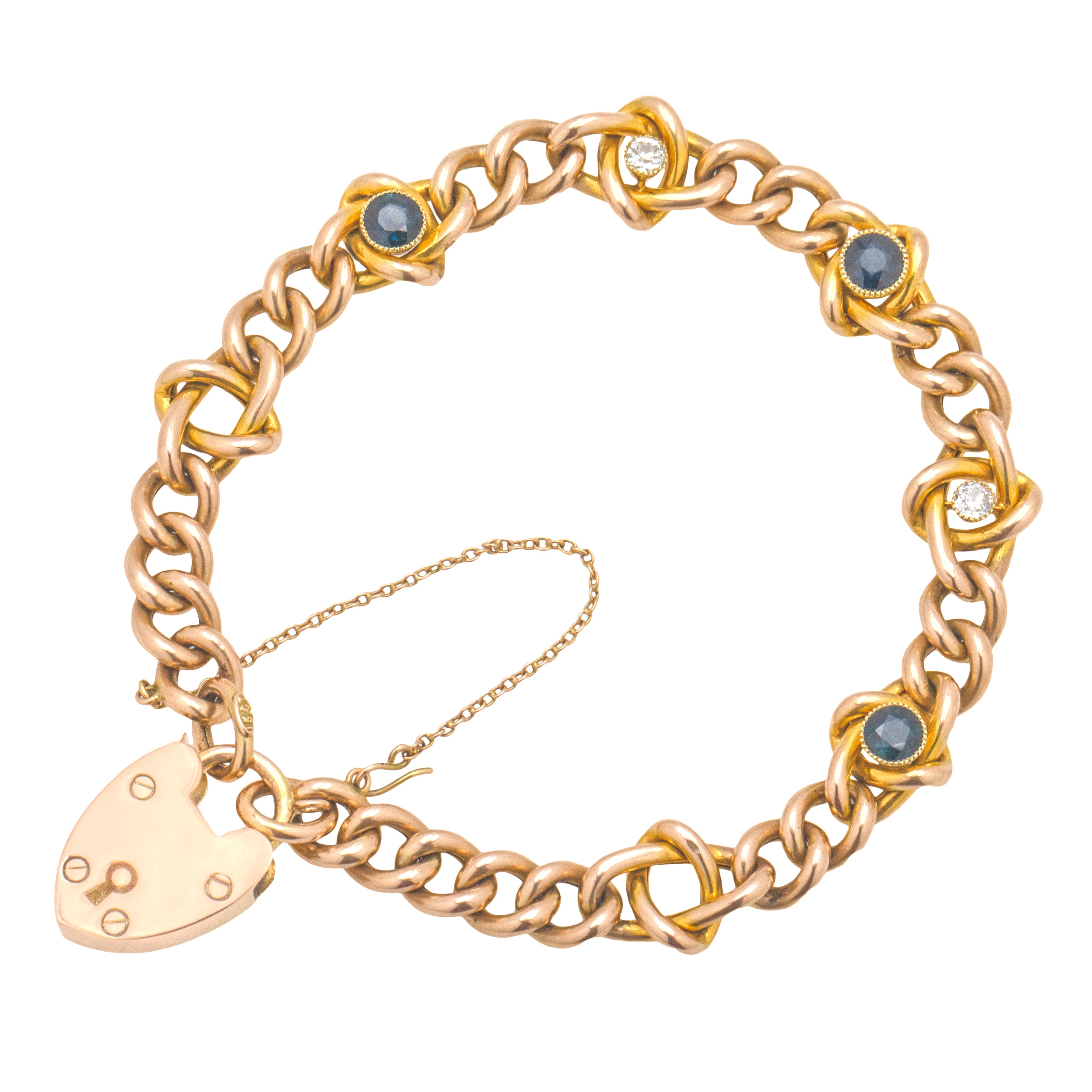Antique 15ct Gold Sapphire Diamond Bracelet, Heart Padlock