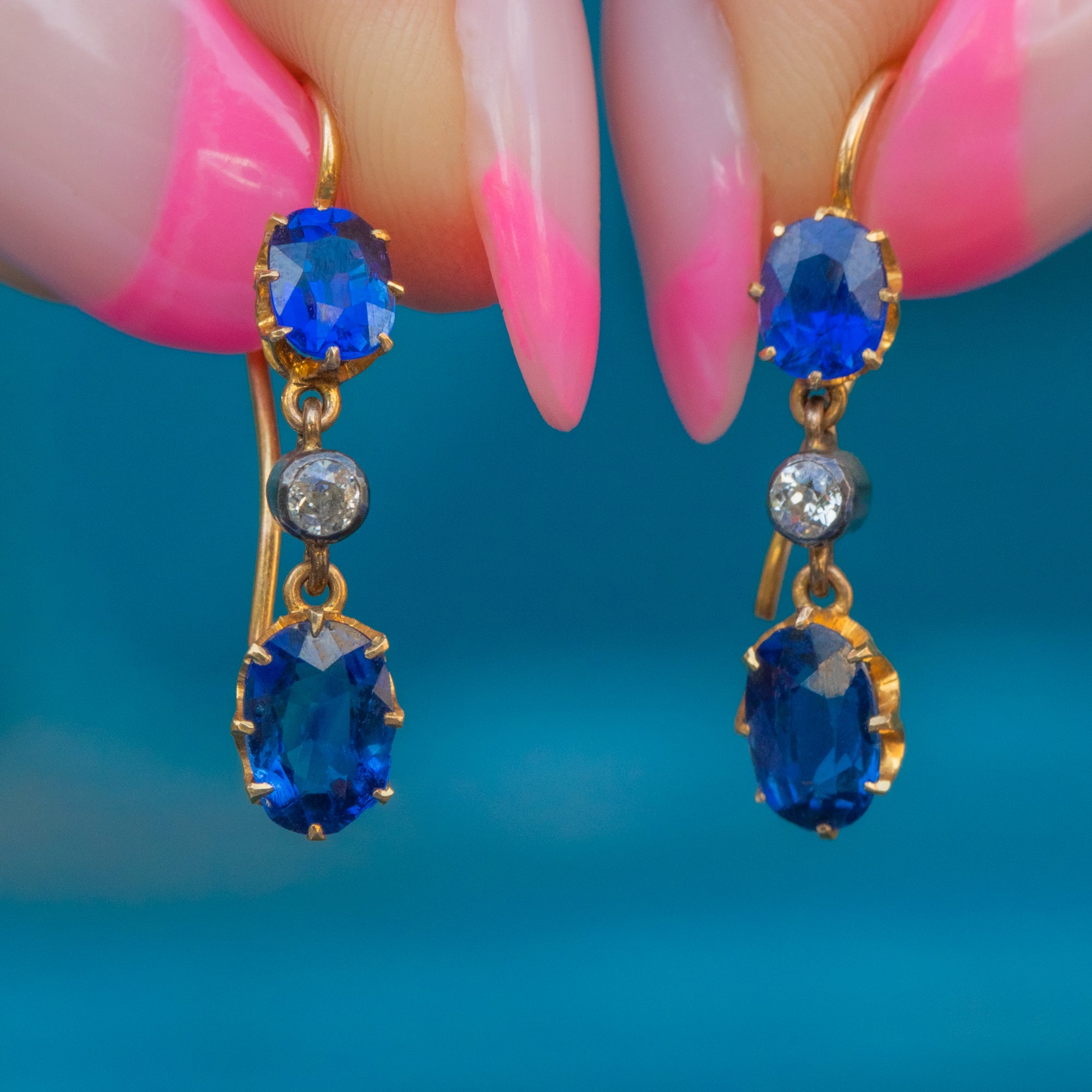 Antique 15ct Gold Sapphire Diamond Drop Earrings, 2.16ct Sapphires