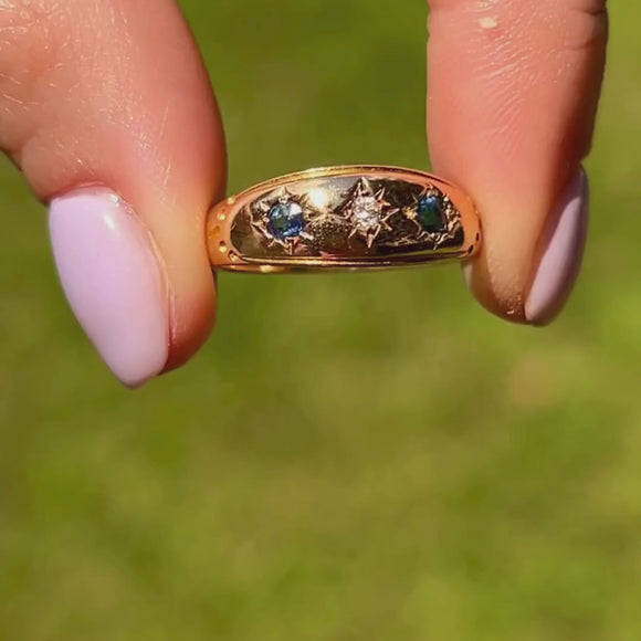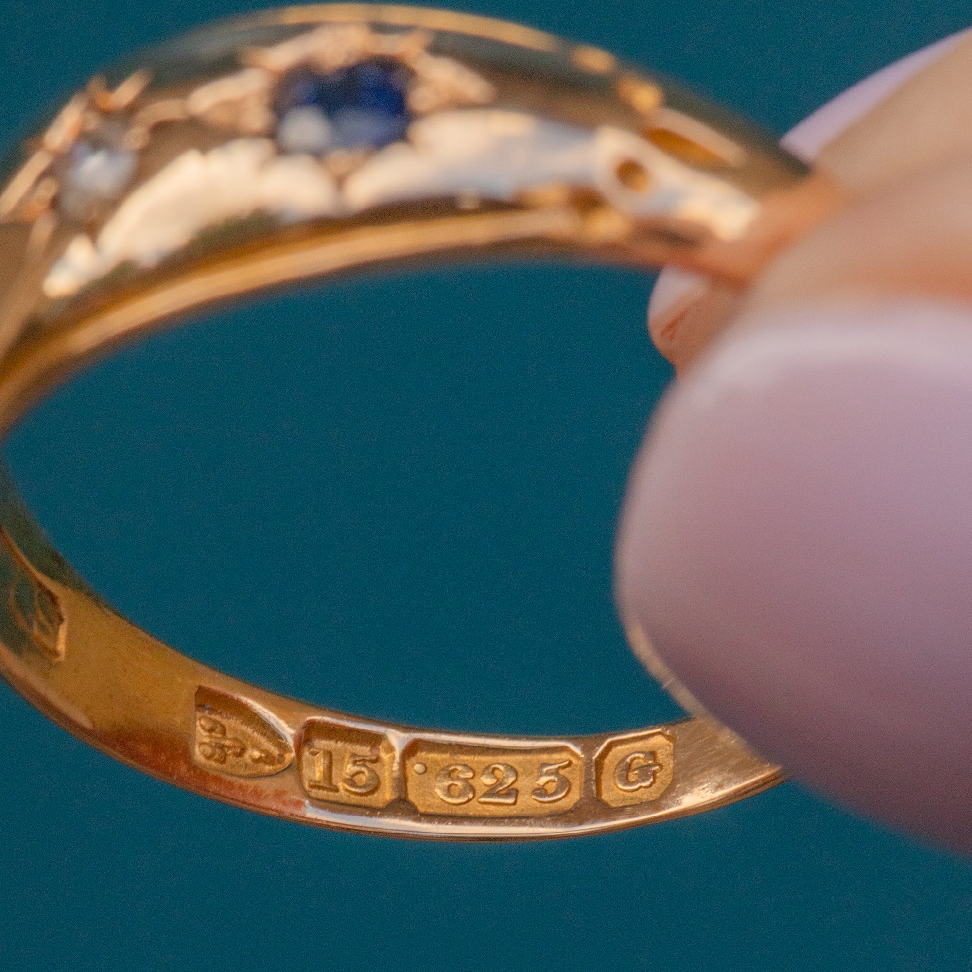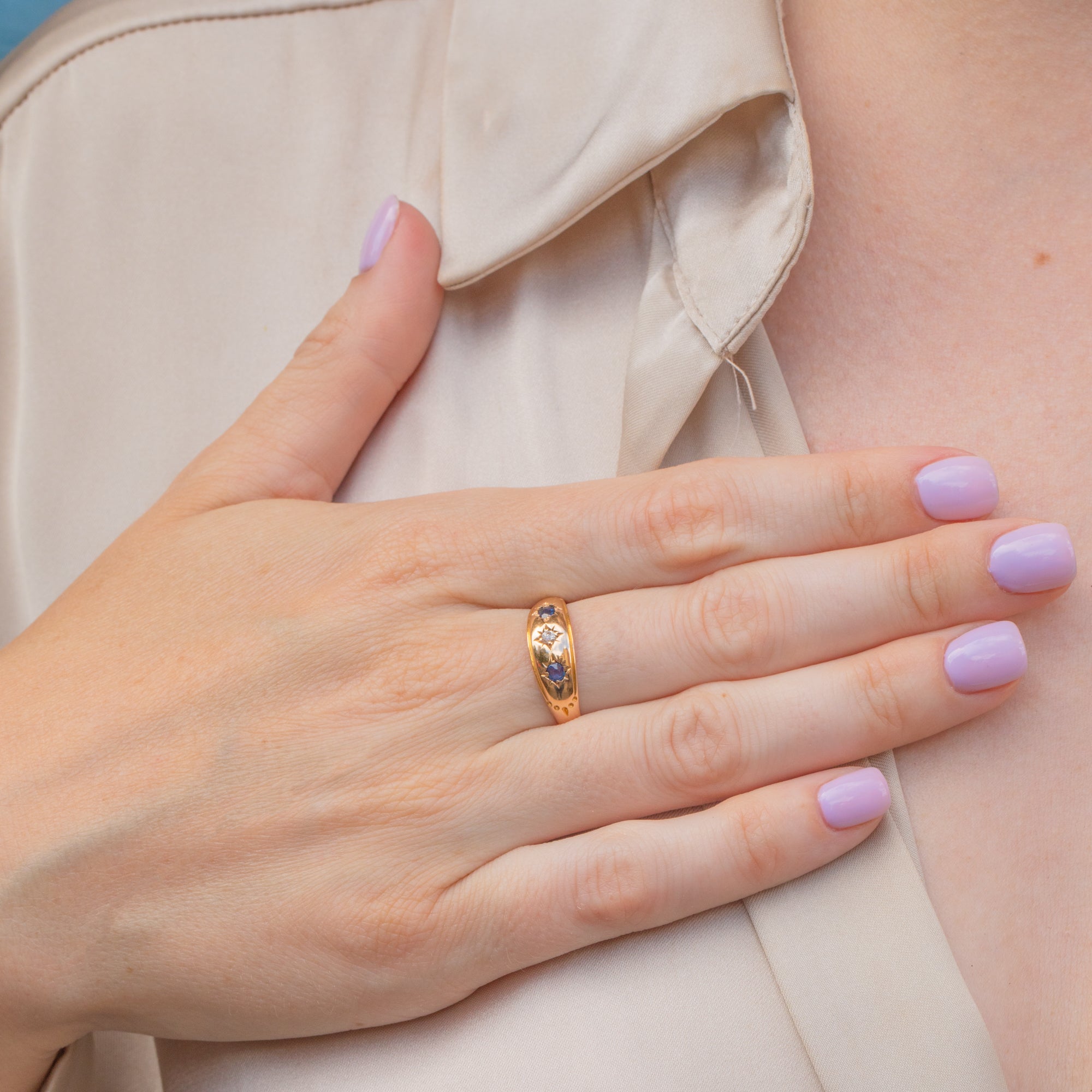 VERY GOOD-EXCELLENT. This antique 15ct Gold Sapphire Diamond gypsy ring is in very good to excellent condition! The Sapphires and Diamonds sit secure within their star settings with the colours offsetting beautifully against one another. To the culet of one Sapphire there is a small chip but nothing untoward. The Gold throughout has gorgeous reflective qualities and her perfectly round form allows for this Victorian Sapphire ring to be worn in comfort and confidence!