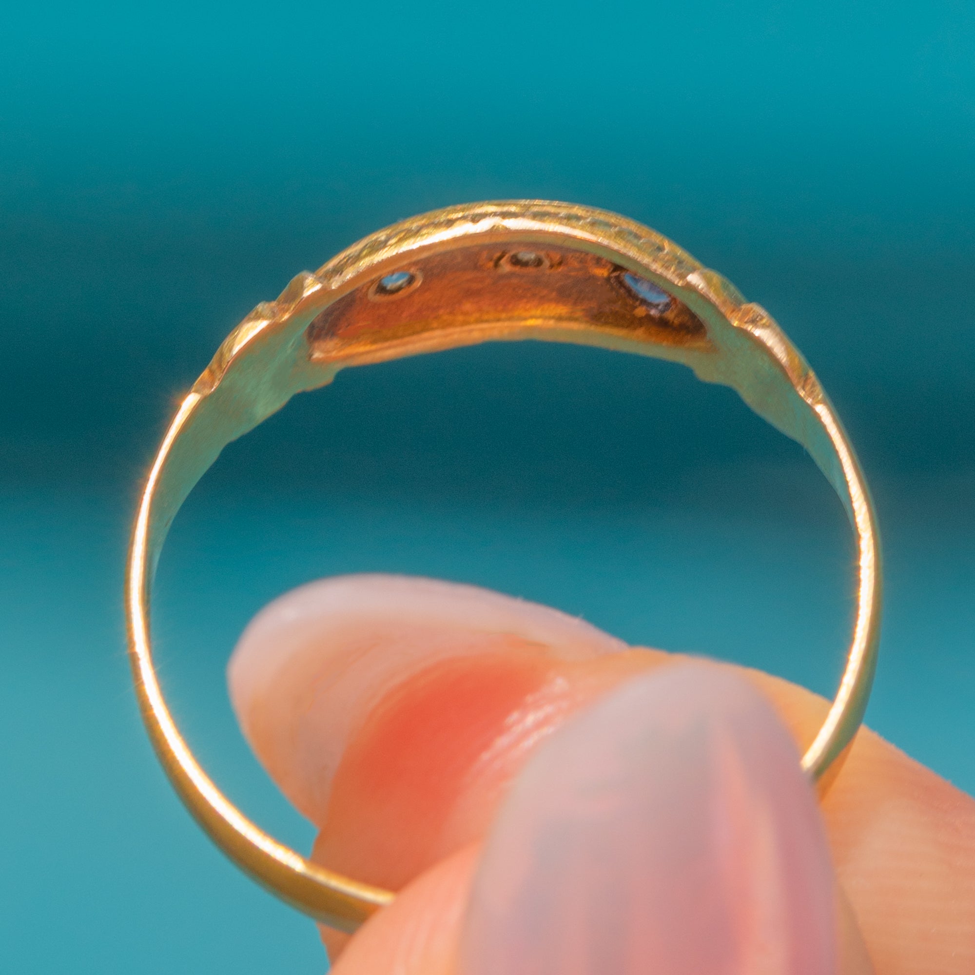 VERY GOOD: The gemstones are radiant and sit securely within their settings - with only the most minor wear present. She has been resized in the past - indicated by the resize mark on the back of the ring. The Gold has a rich situation throughout, and the band is smooth with a full set of hallmarks dating to 1899.