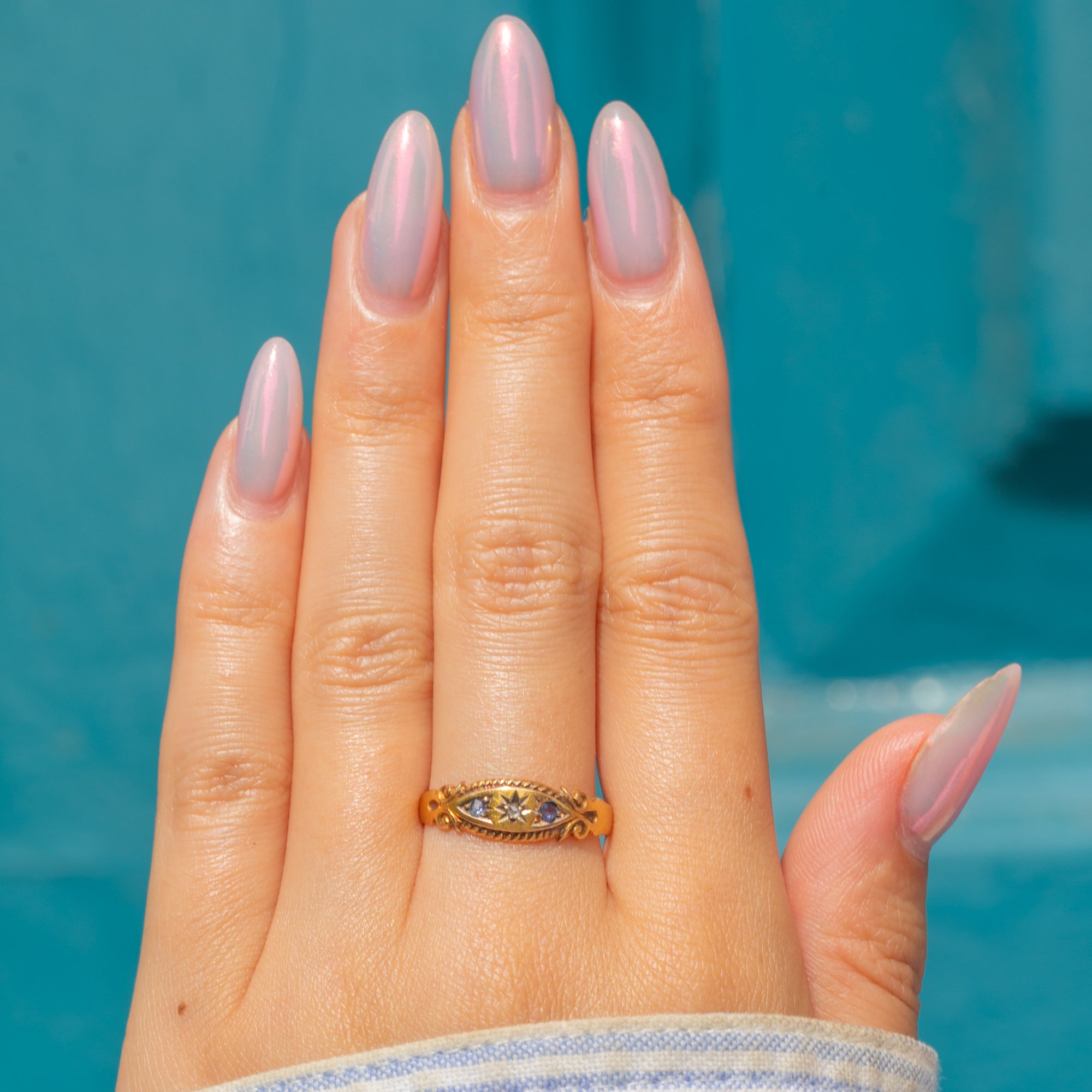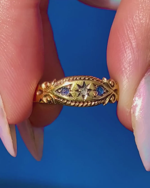 In her centre sits a scintillating Diamond flanked by Sapphires, each gemstone gleaming with a gorgeous radiance as they catch the light. These Victorian gemstones sit within bold settings, giving this antique ring a decadent charm.