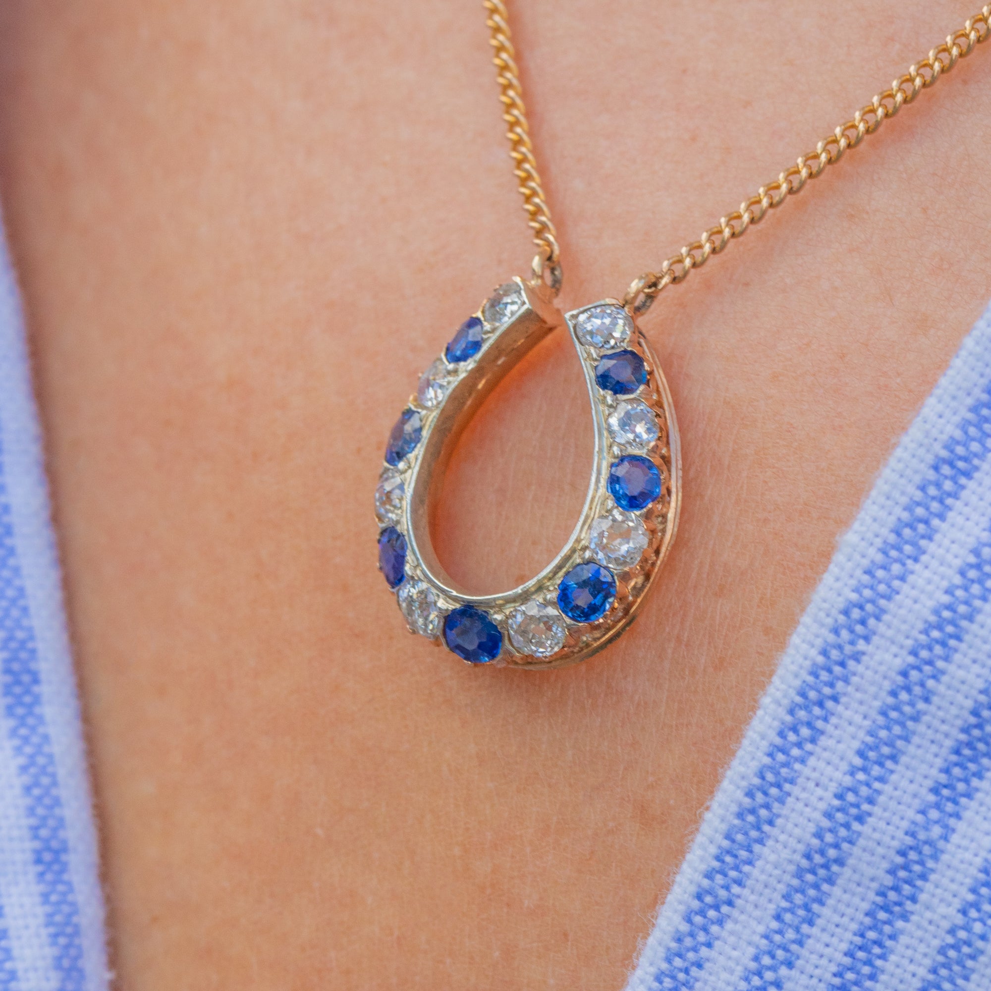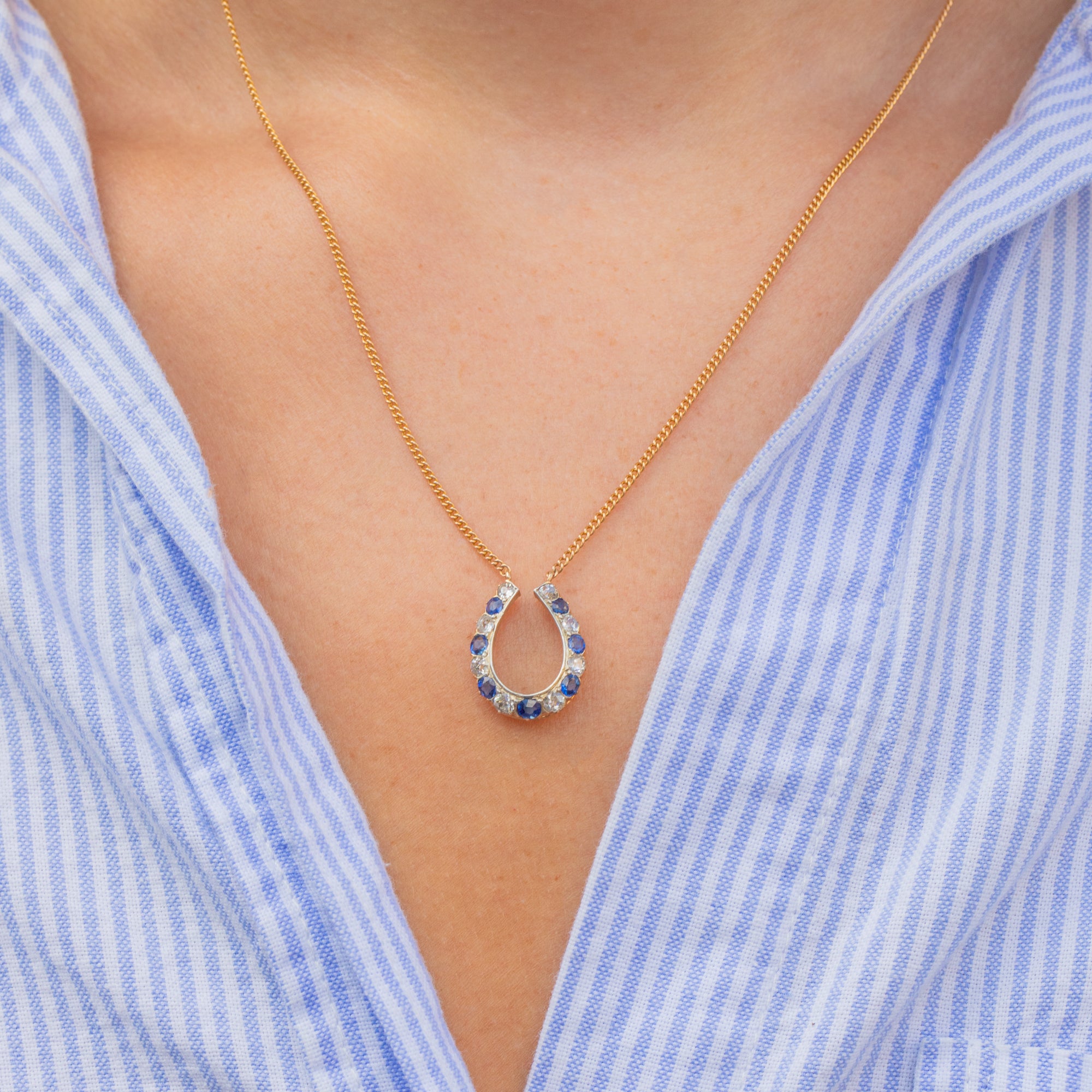 Bring luck into your repertoire with this antique 15ct Gold Sapphire Diamond horseshoe integral necklace! This integral horseshoe necklace will be the belle of the ball, inlaid with midnight blue Sapphires, totalling 0.35ct, and alternating with dazzling Diamonds for an effortlessly elegant finish.