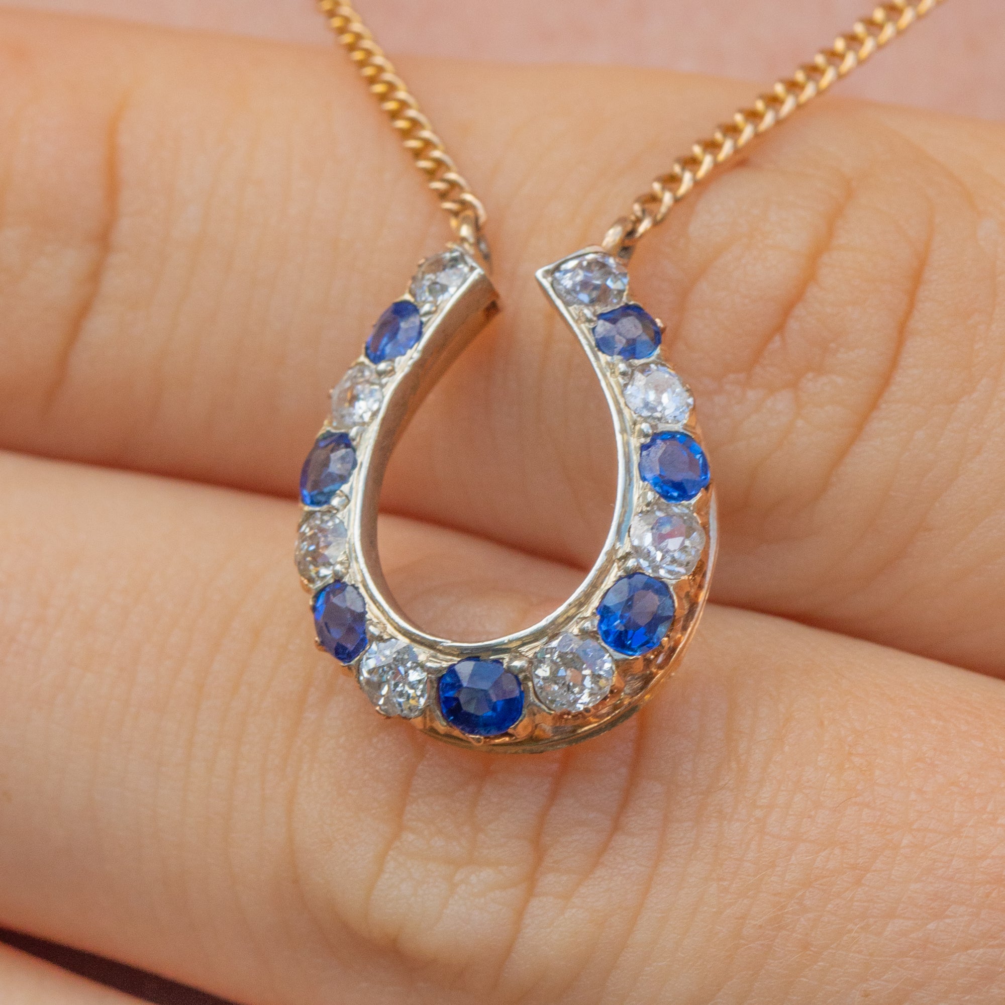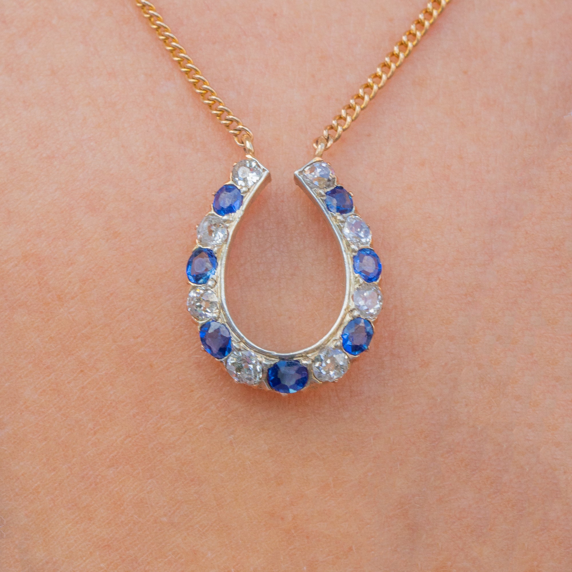 Her horseshoe is suspended from a fine chain, which provides security but also allows for her cluster of Diamonds and Sapphires to remain the star of the show. At 18 inches, this Sapphire Diamond necklace falls centrally against your décolletage, perfect for accompanying any formal evening attire!