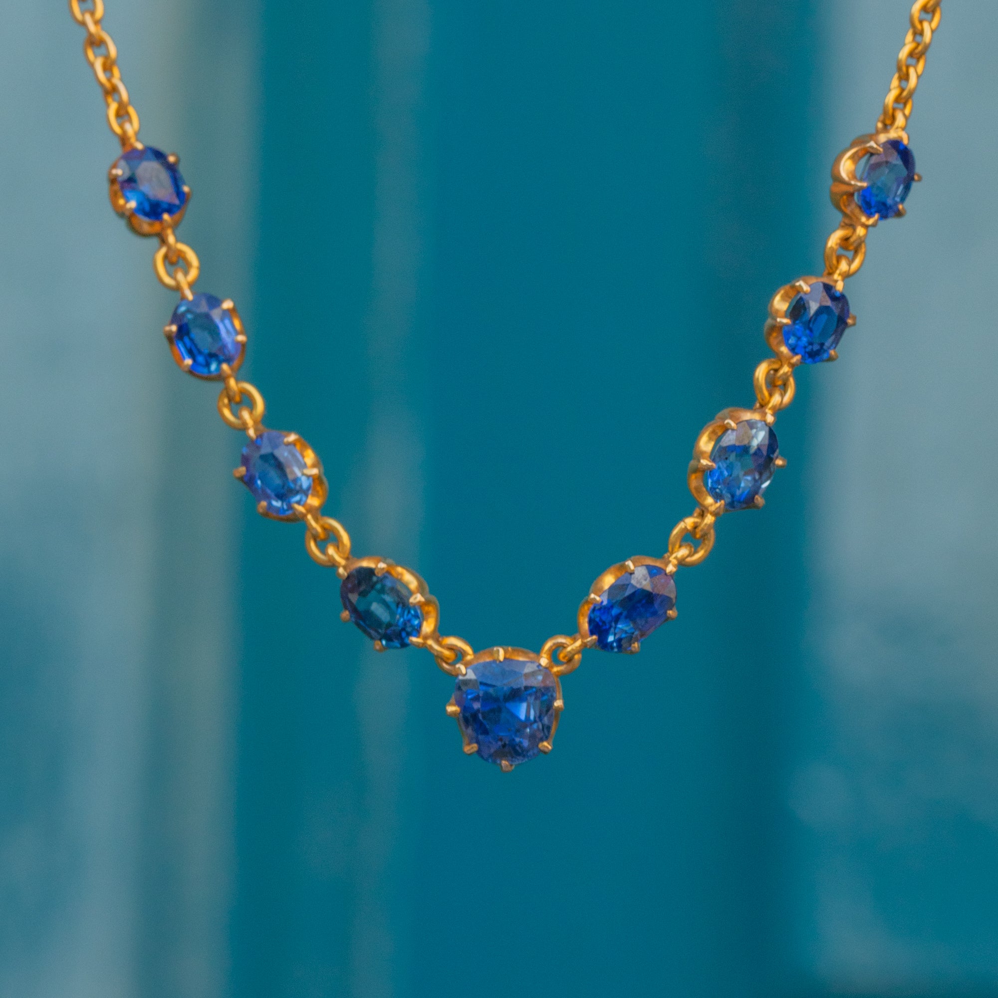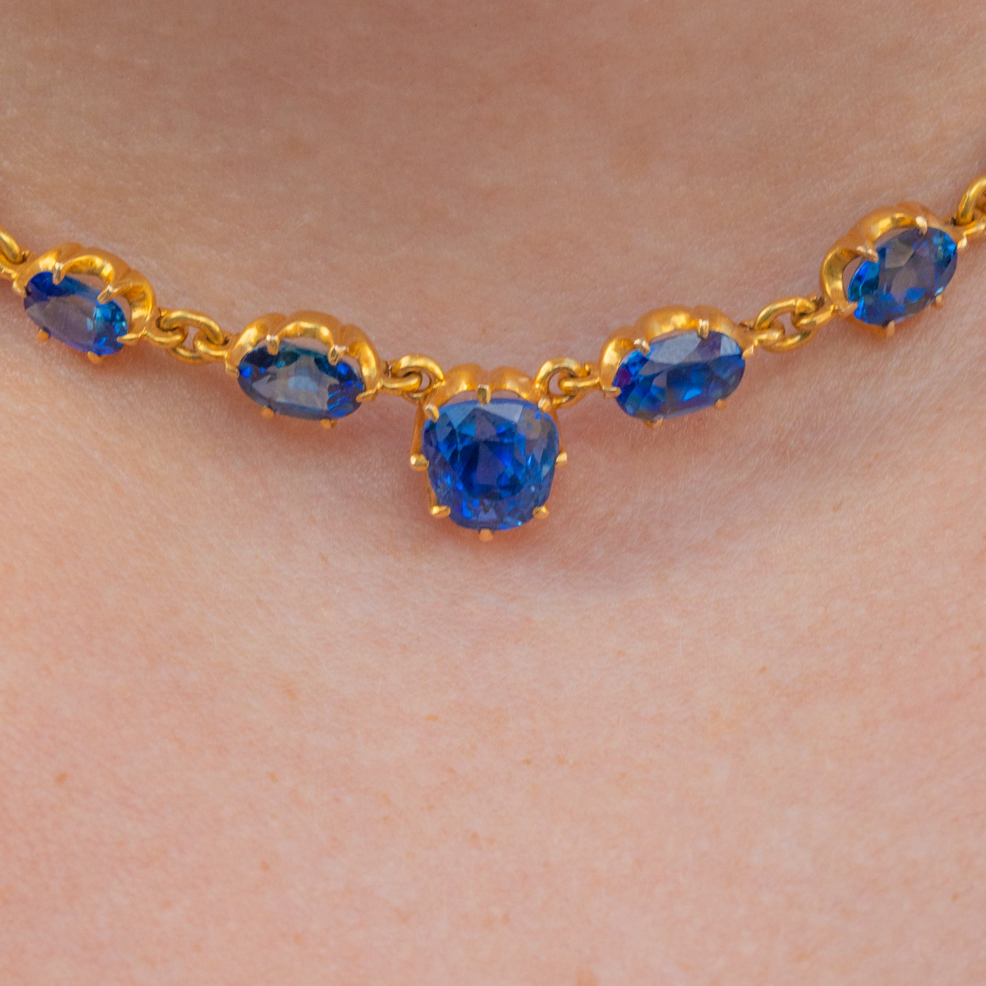 VERY GOOD-EXCELLENT. This antique 15ct Gold Sapphire necklace is in very good to excellent condition! Each Sapphire is secure and the vivid blue is harmonious throughout. There are some subtle surface marks to the central stone, however, this can only be seen through a jeweller's loupe.  The 15ct Gold links are uniform and have a rich saturation throughout. With a fully functioning bolt-ring, this Victorian necklace can be enjoyed with confidence!