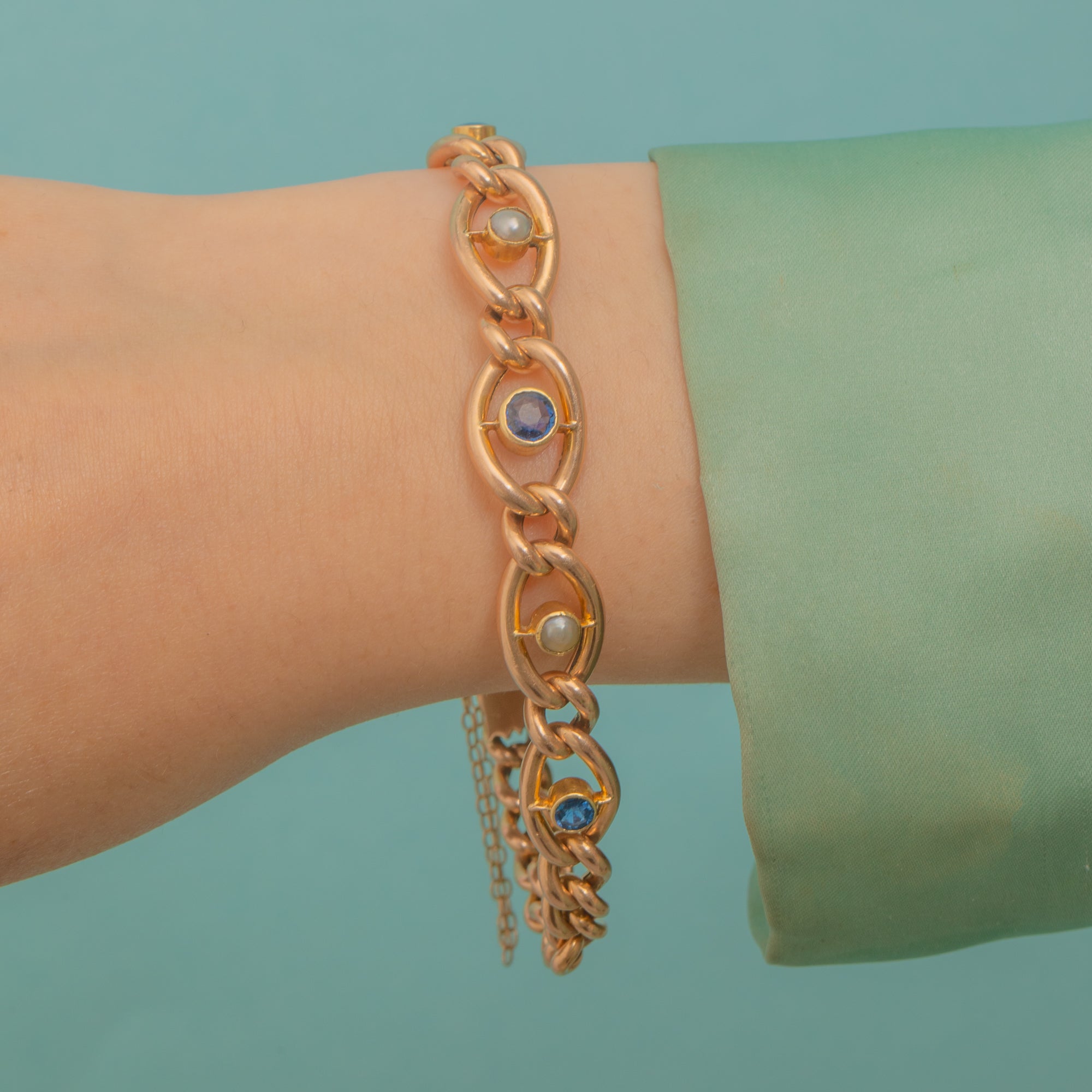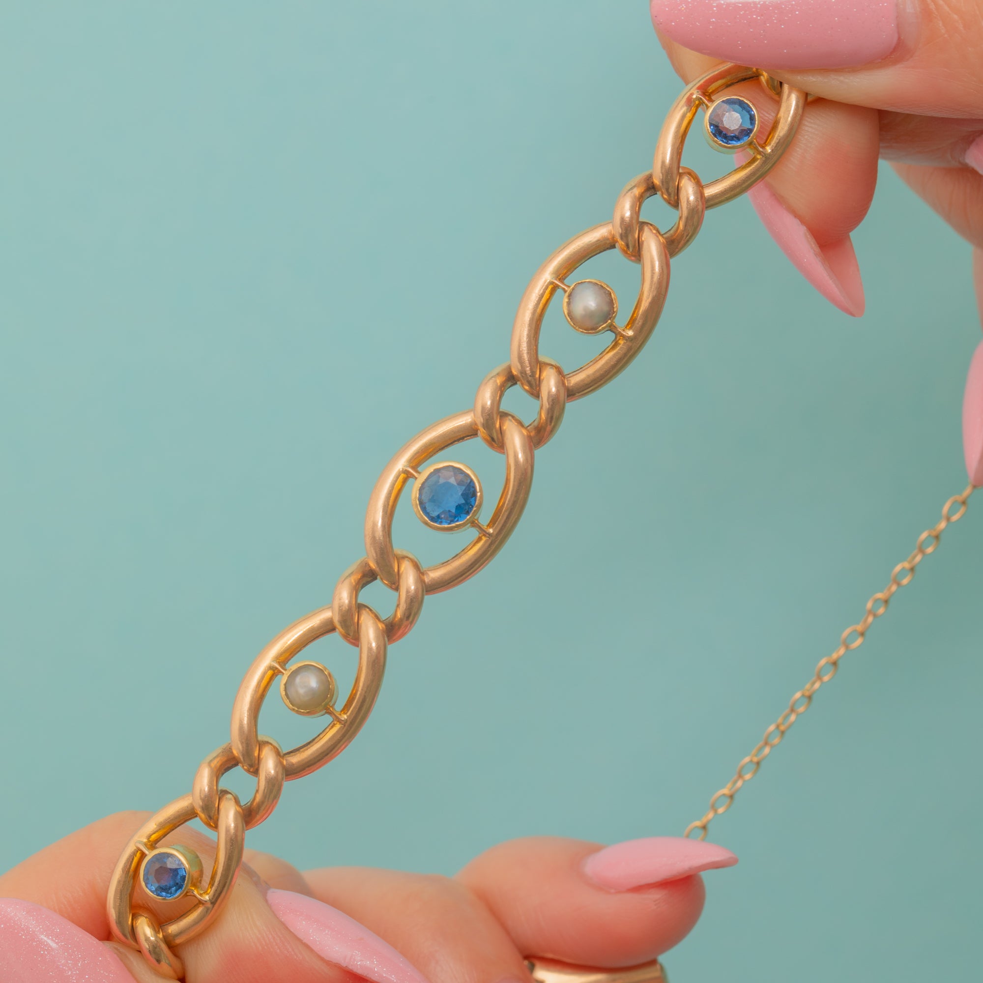 Antique 15ct Gold Sapphire Pearl Curb Link Bracelet