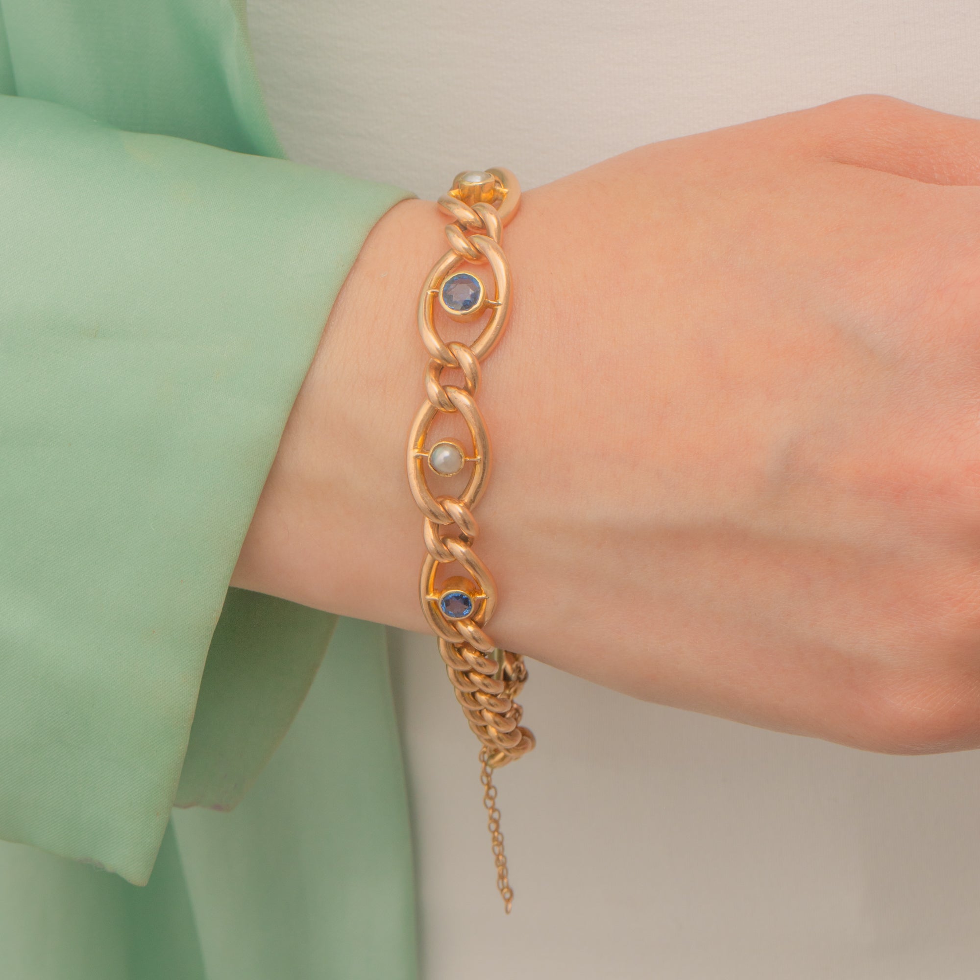VERY GOOD-EXCELLENT: This antique 15ct Gold Sapphire and Pearl curb link bracelet is in great condition. The Gold is bright and buttery, with only minor signs of wear to the clasp and settings. Each of her stones are securely set, and her clasp is in perfect working order. With a safety chain for added security, this antique Victorian curb link bracelet can be worn with utmost confidence!